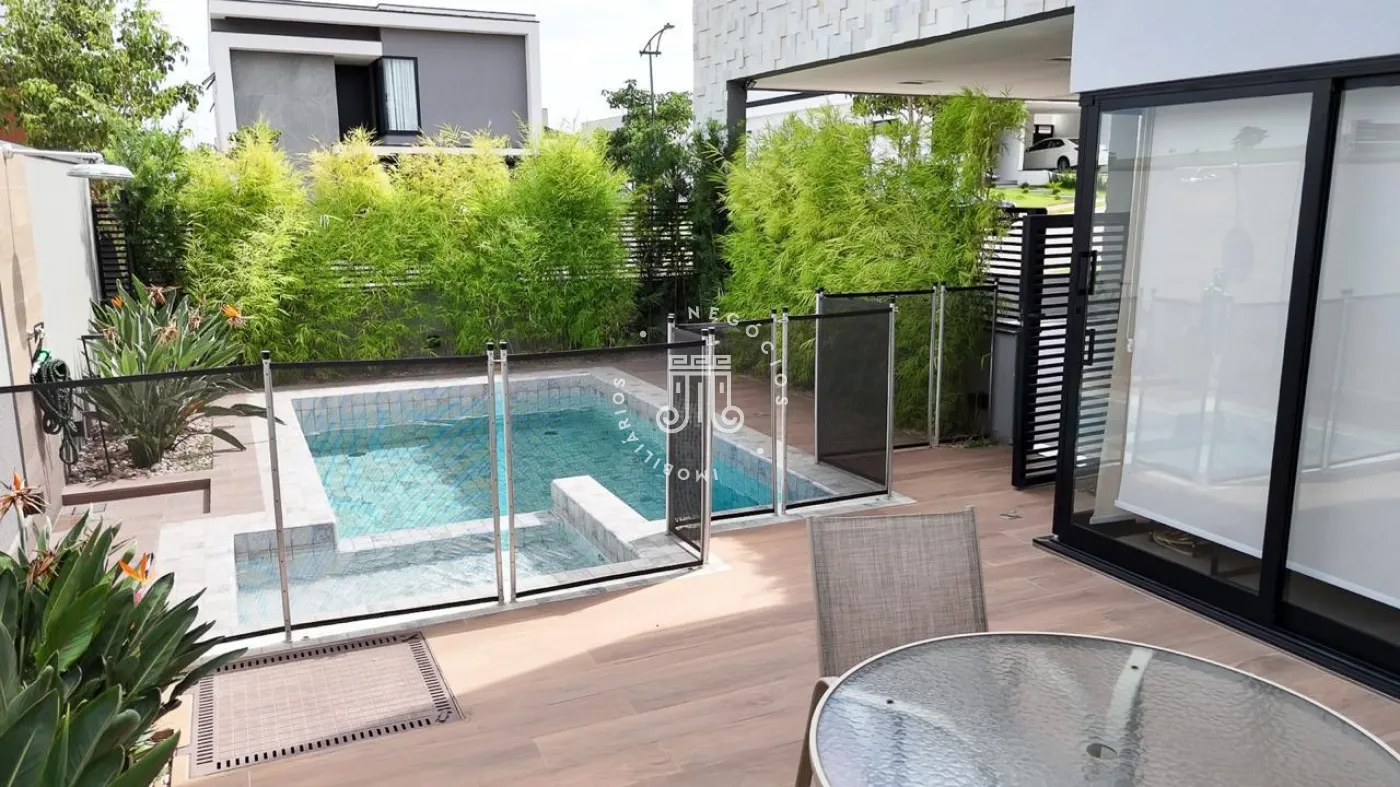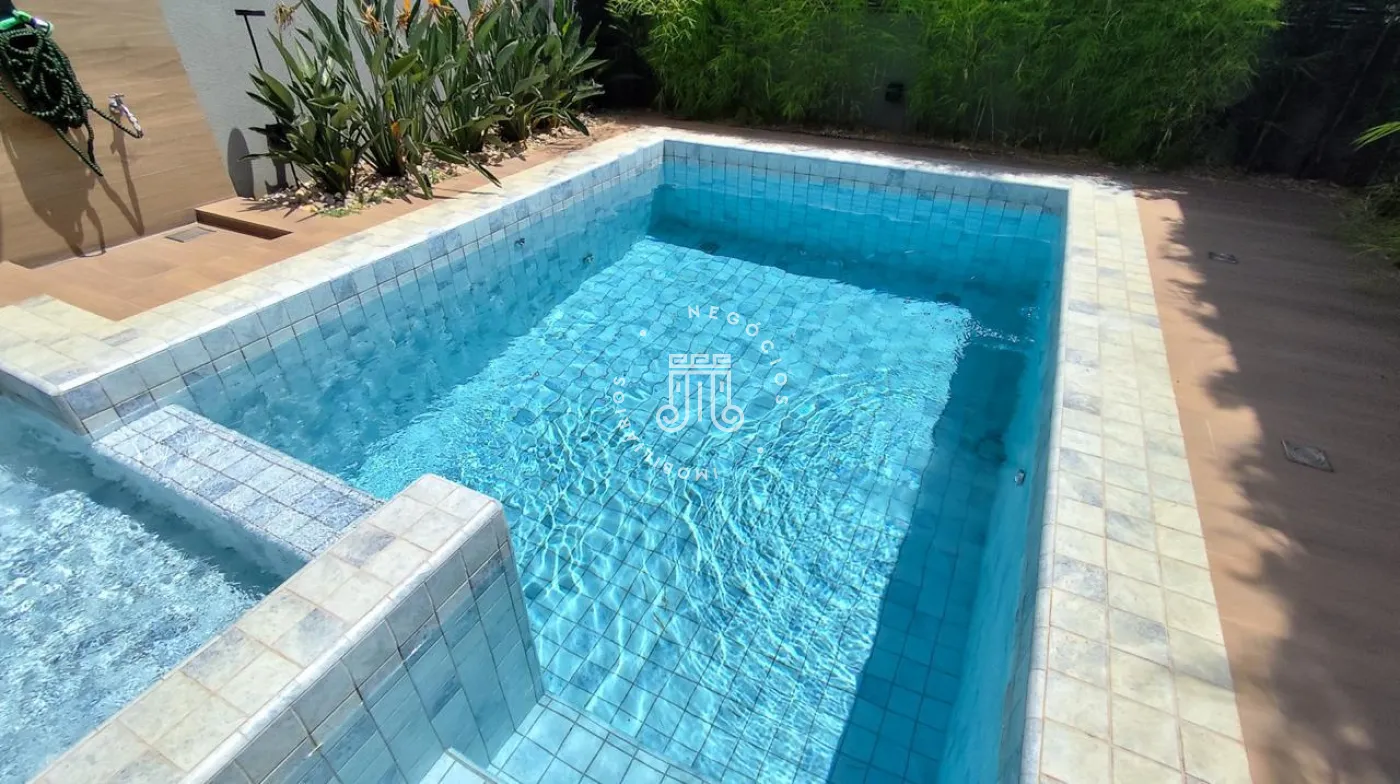 A área externa dispõe de piscina com aquecimento solar, prainha e hidromassagem. O sistema de energia é composto por 11 painéis fotovoltaicos com micro inversor. Conta ainda com infraestrutura para automação, 7 aparelhos de ar-condicionado instalados e caixas de som embutidas na área gourmet, sala, cozinha e piscina.