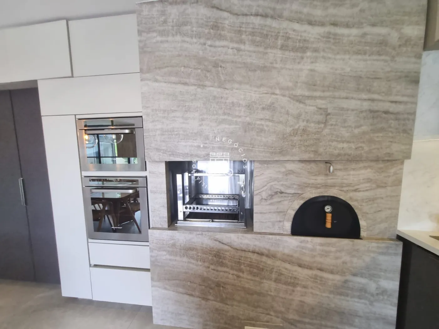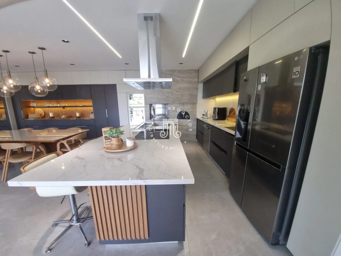 Cozinha gourmet integrada equipada com ilha central churrasqueira forno de pizza cooktop coifa forno e micro-ondas