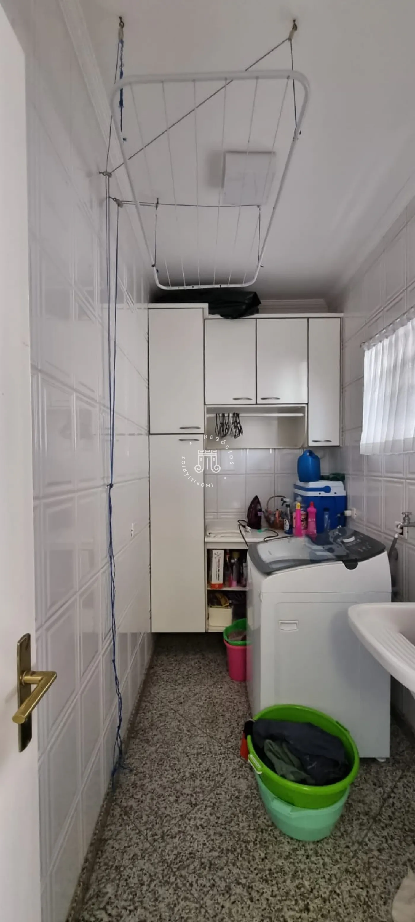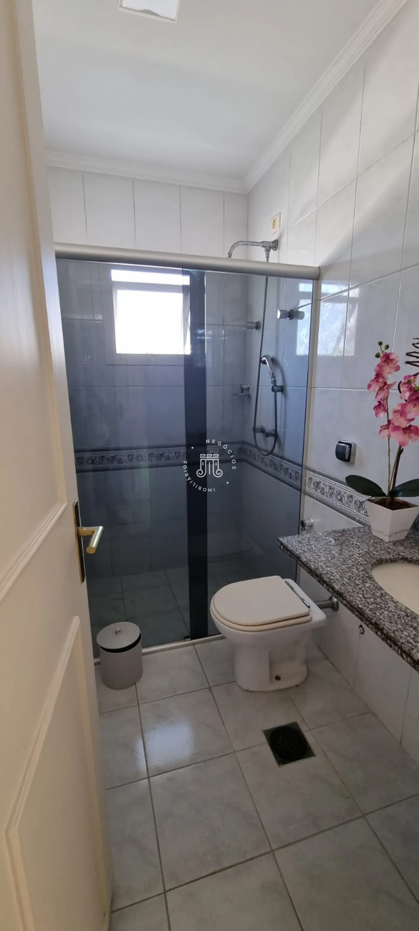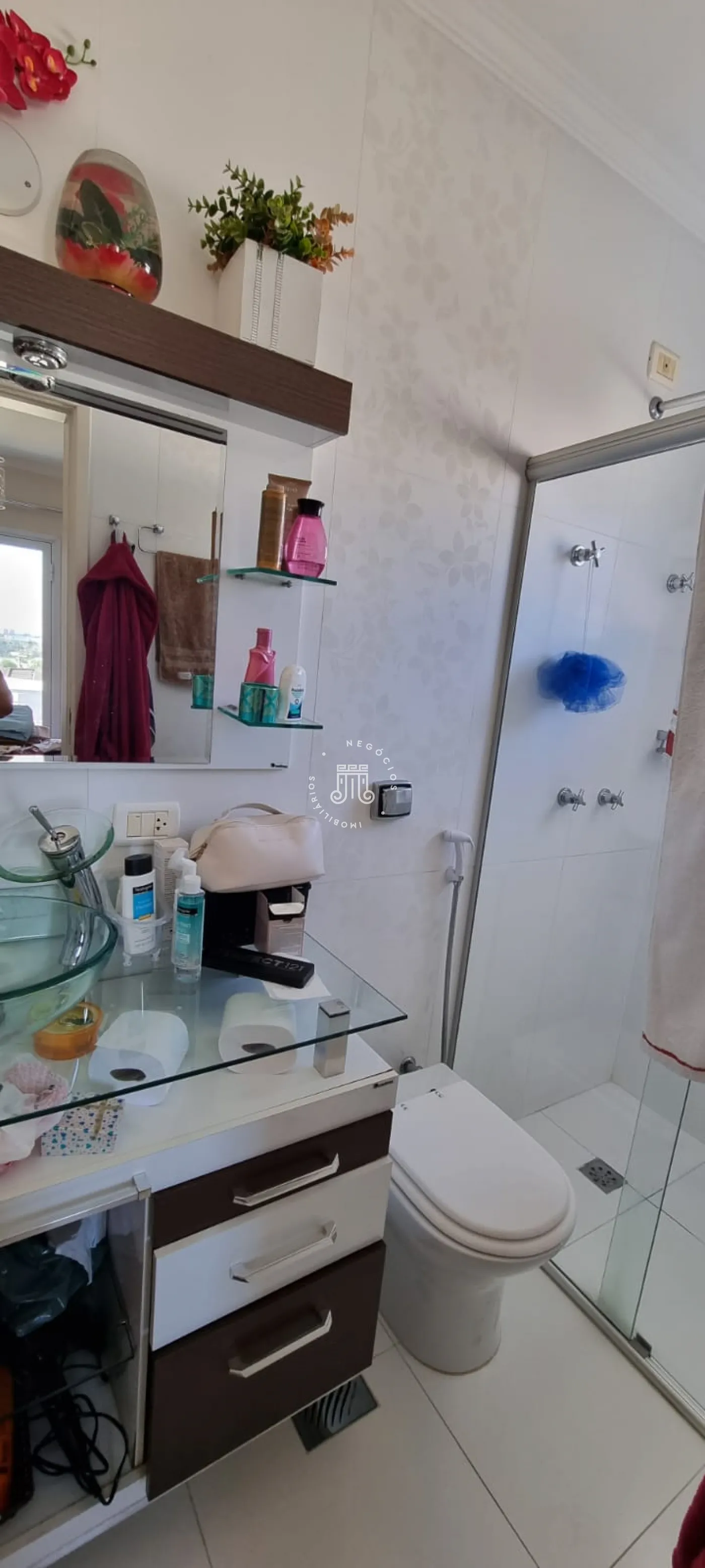 O imóvel possui na parte superior: 03 dormitórios sendo 02 suítes, closet e banheiro social. Na parte inferior do imóvel possui: Sala de TV, sala de jantar, cozinha com móveis planejados, área de serviço com armários embutidos, lavabo e garagem com 03 vagas e 02 cobertas.