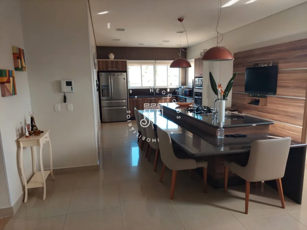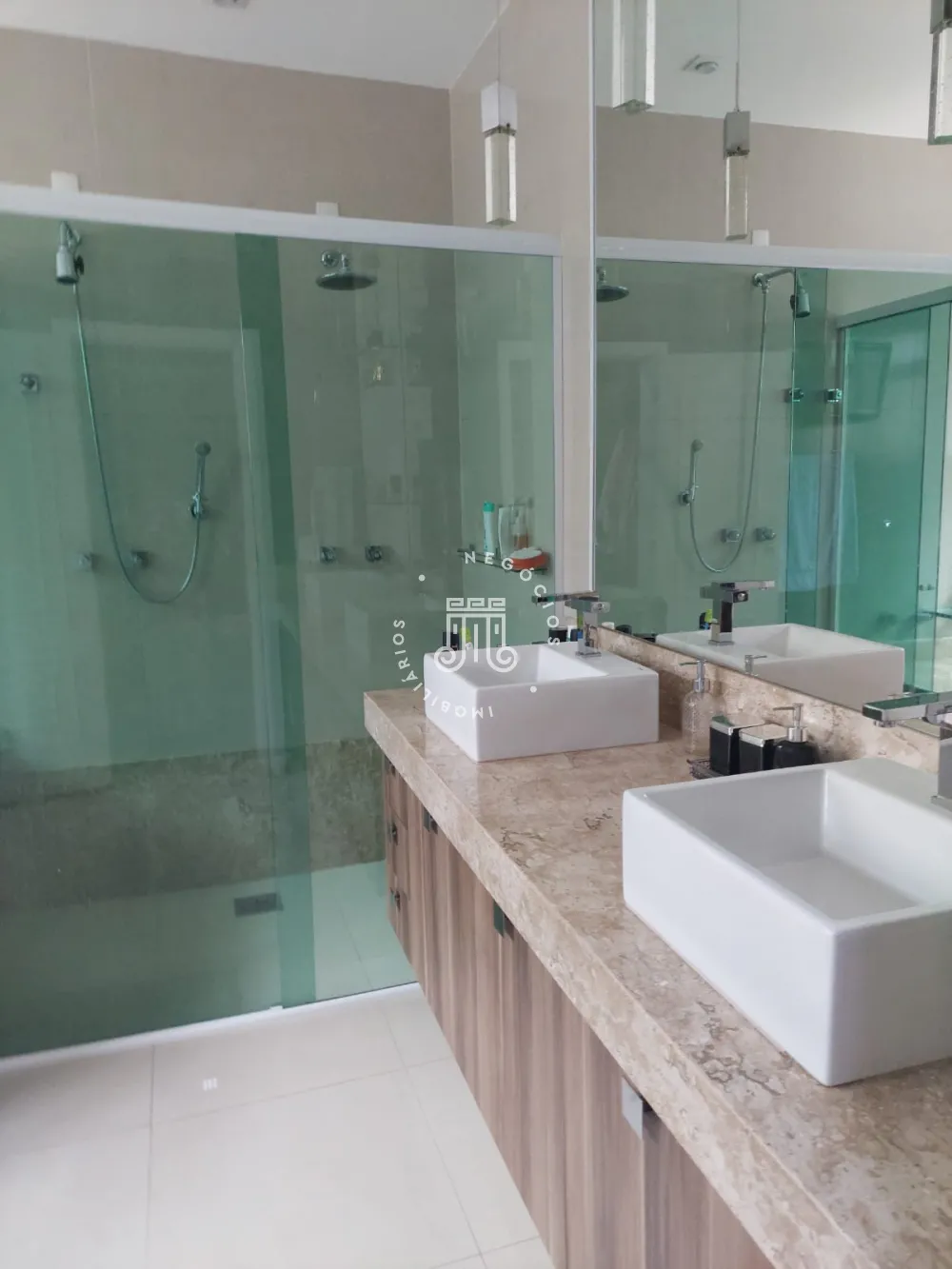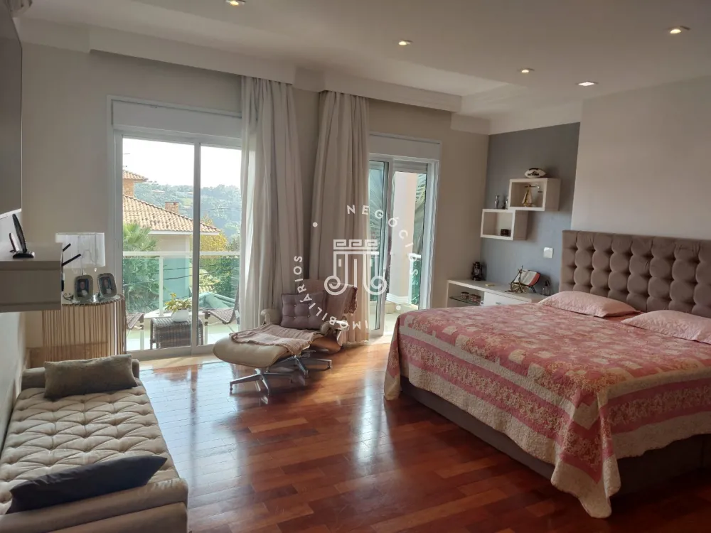 A casa está composta por: 5 Quartos, sendo 4 suítes, 2 suíte com closet, 1 suíte com closet, banheira e hall na parte com vista para a piscina; Hall de entrada com lavabo; Sala de estar com lareira; Sala de jantar; Cozinha ampla com ilha e área de serviço integrada; Escritório e Varanda.