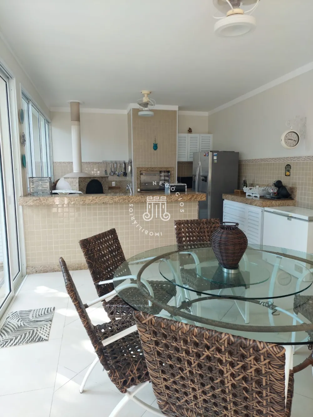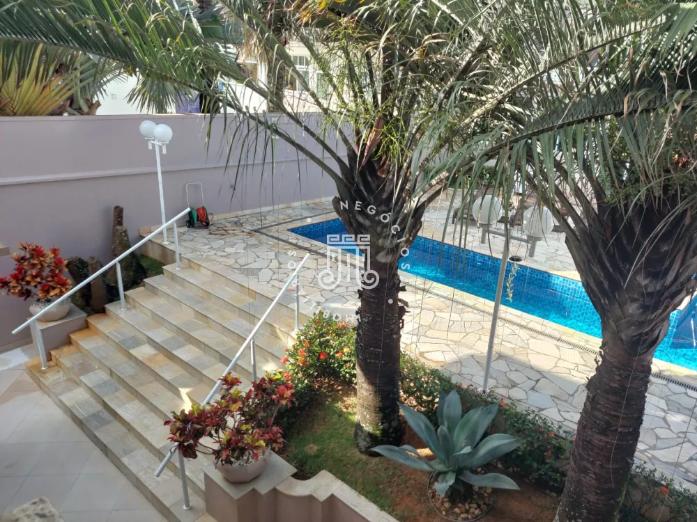 Na área externa ela está composta por: Quintal amplo; área gourmet com forno de pizza e churrasqueira; piscina; sauna; banheiros e garagem para 3 carros cobertos e 3 descobertos.