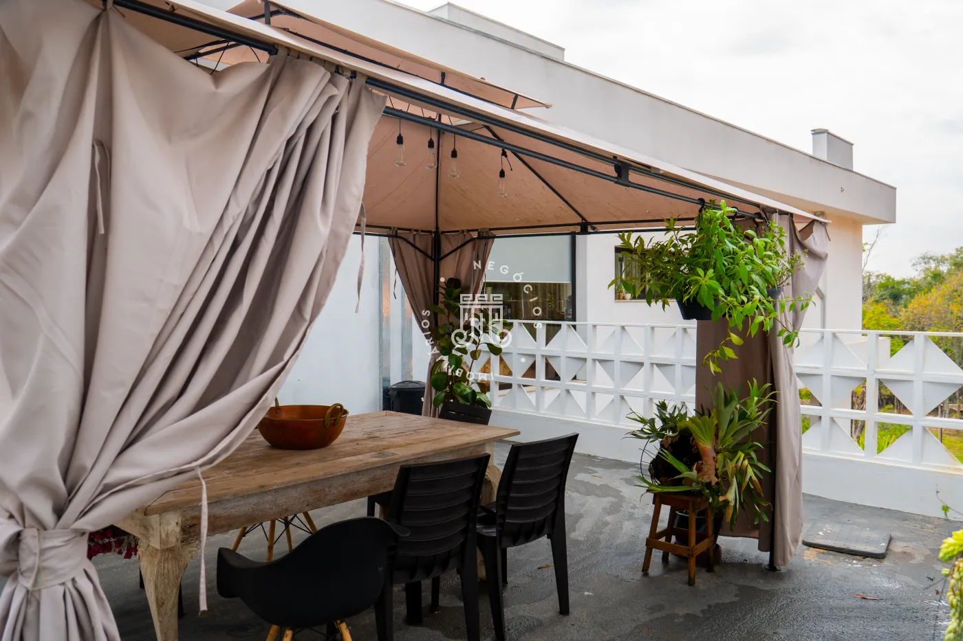 A sala de estar, a sala de jantar e a cozinha contam com piso em porcelanato acetinado, esquadrias em alumínio preto, teto em forro drywall, paredes em gesso branco, instalações elétrica e hidráulica completas, além de previsão para ar-condicionado. As soleiras acompanham o padrão.