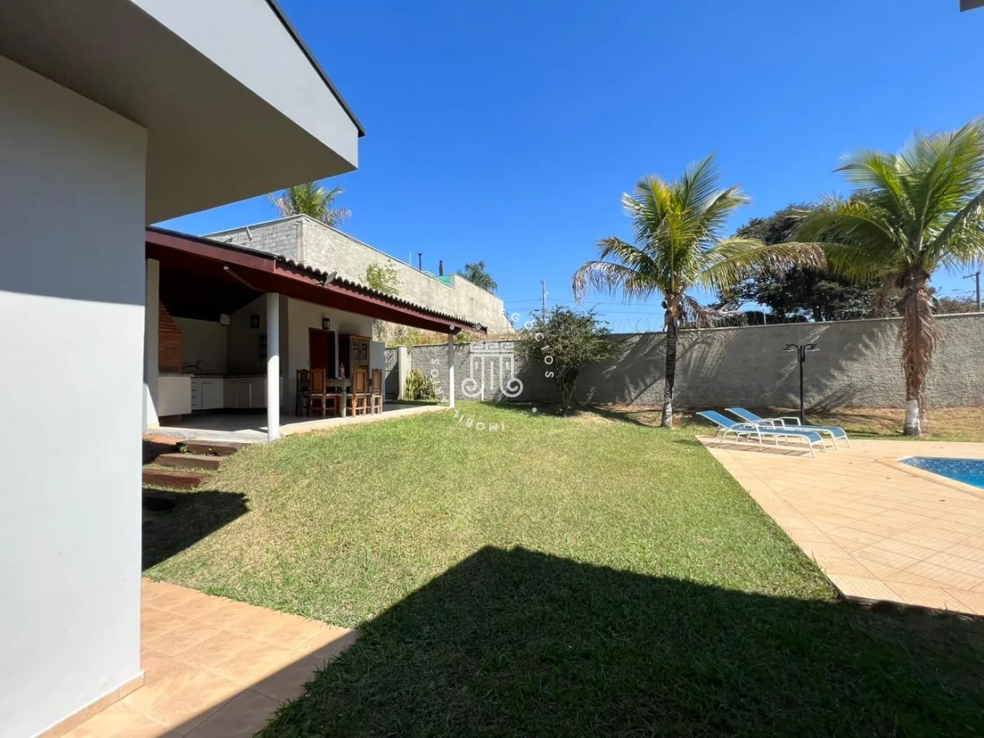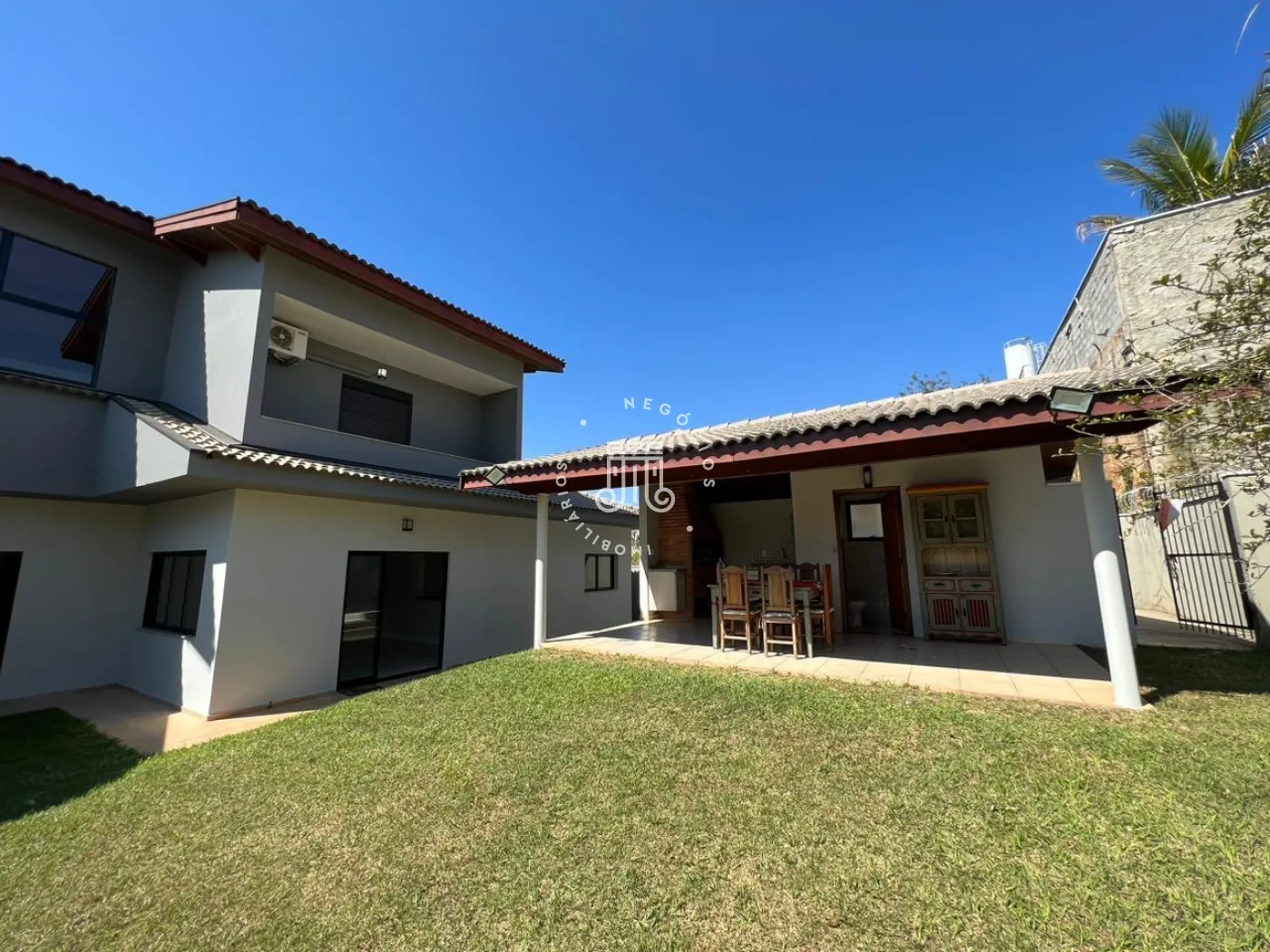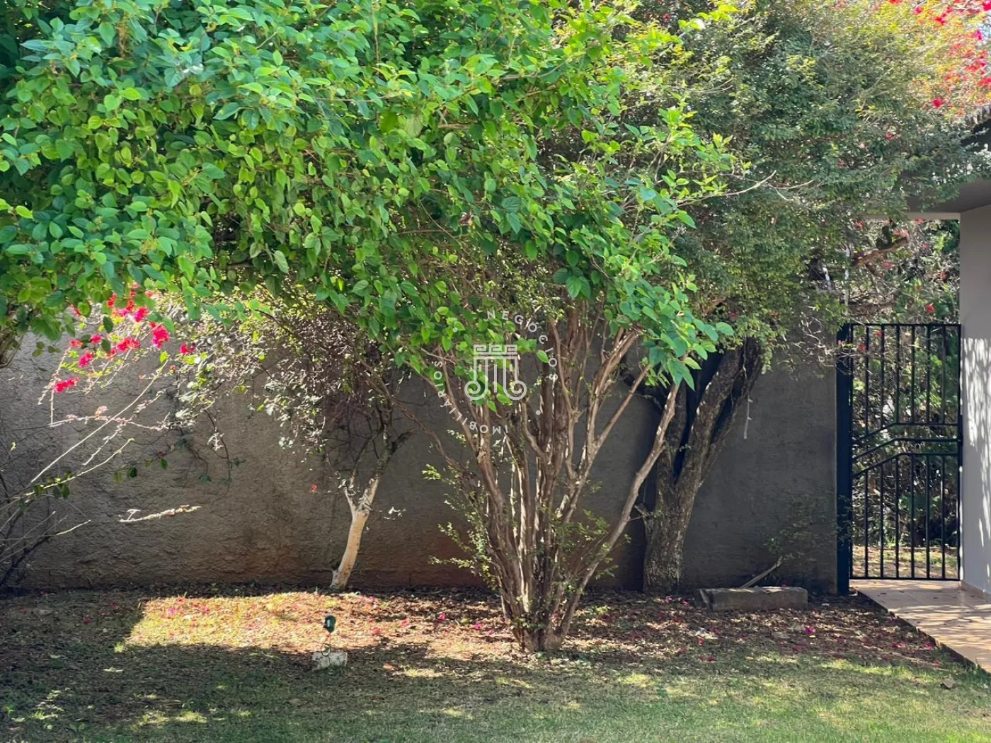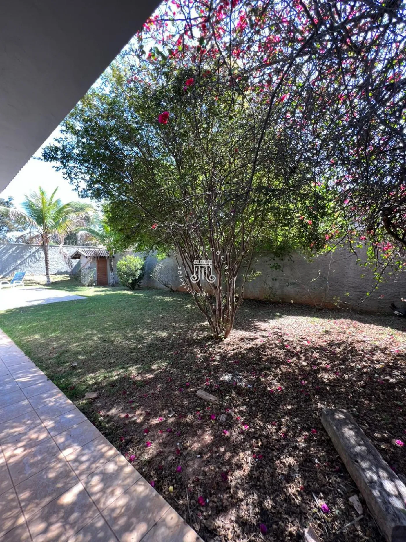 Parte externa: 1 suíte de empregada; piscina; churrasqueira; forno; pia de mármore, com armários; cerca elétrica; casa de máquinas; grande Canil; pequeno pomar com algumas árvores frutíferas; jardins na frente, lateral e parte dos fundos da casa.