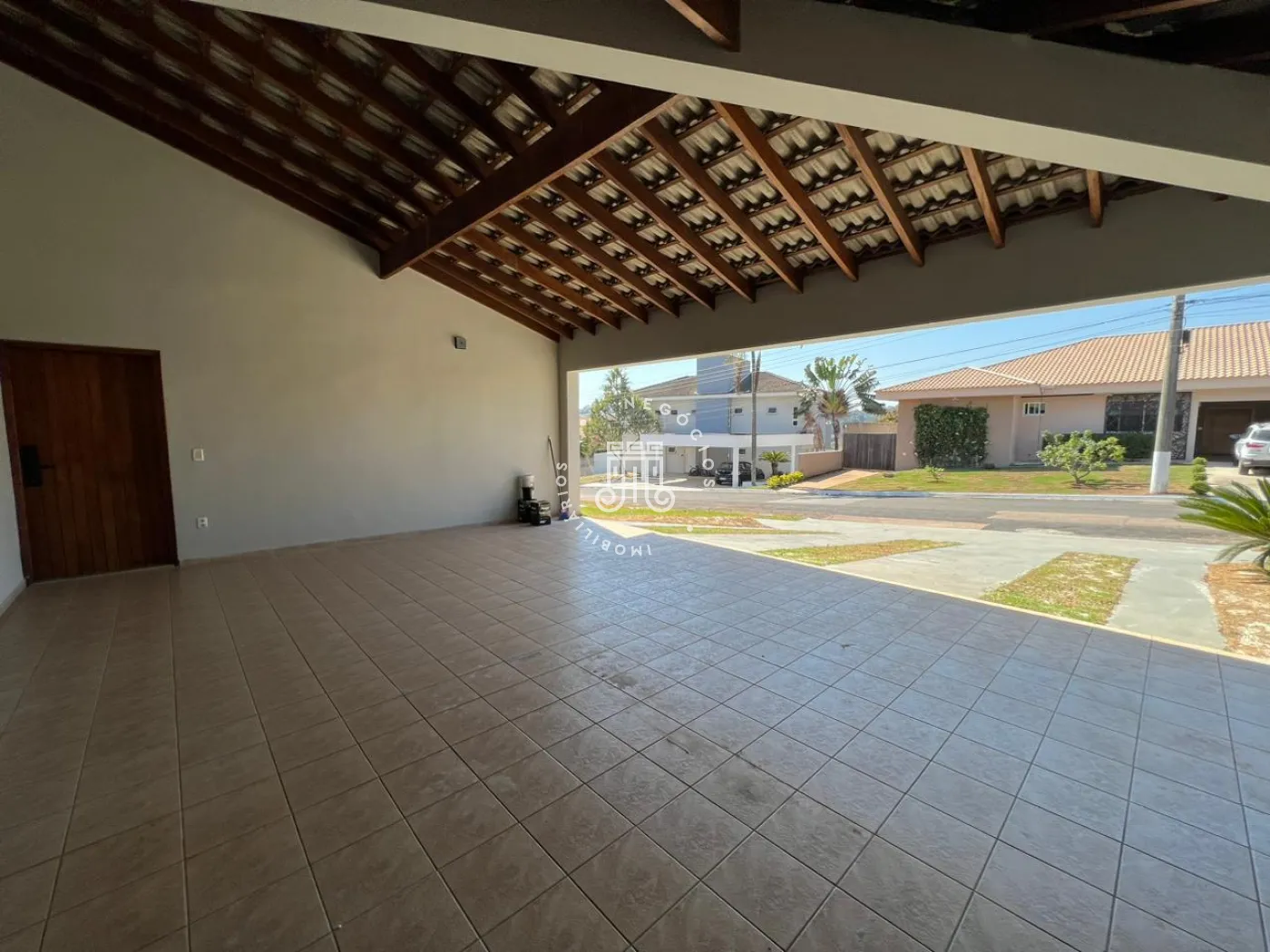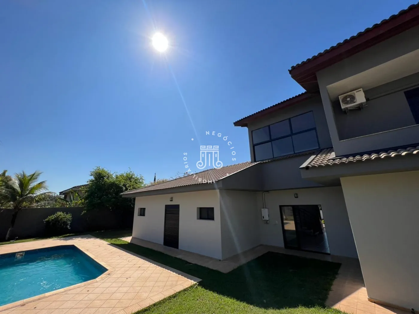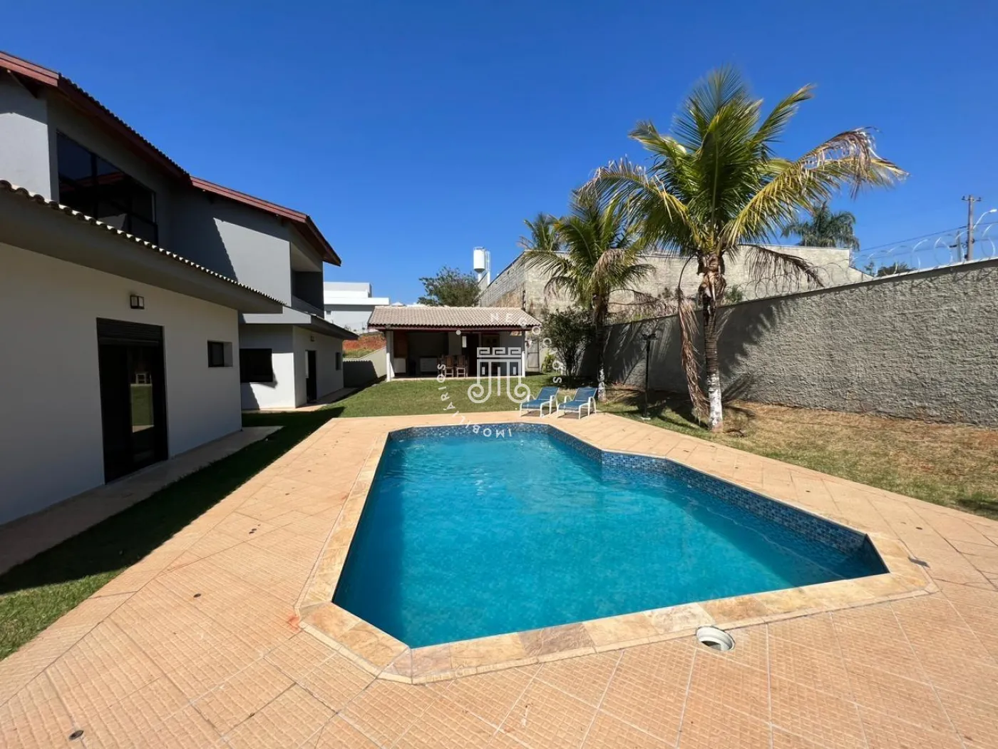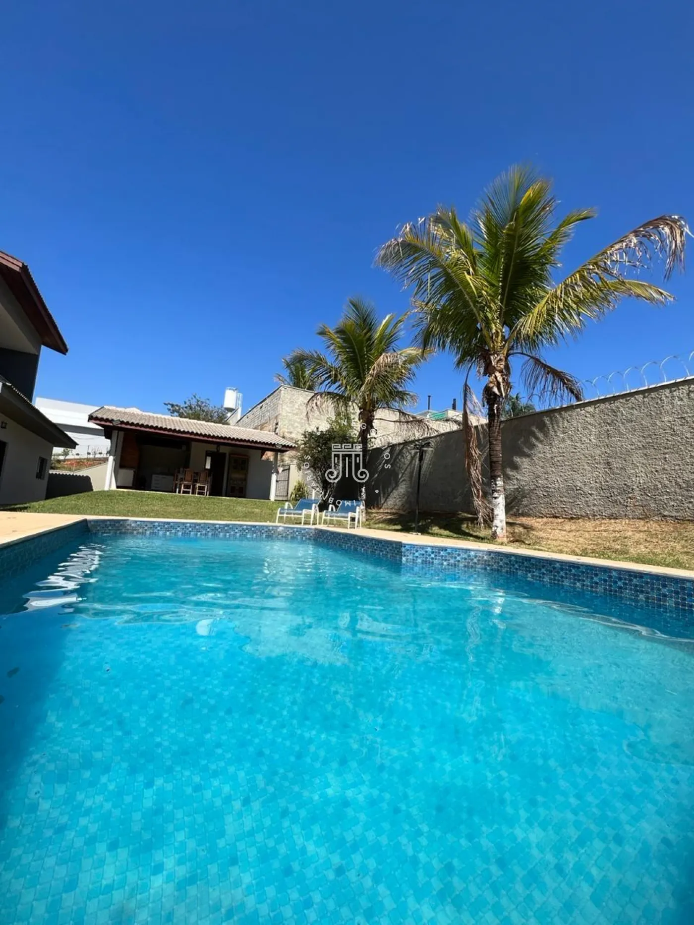 Parte Interna: 3 quartos no piso inferior, sendo 1 suíte com closet com porta balcão com saída para a piscina e 1 suíte com porta balcão com saída para o jardim (as duas suítes possuem veneziana integrada automatizada), Salas de jantar/estar com lareira e piso , escritório; cozinha com cooktop e coifa, lavanderia com armários, garagem para vários carros, com vagas cobertas e descobertas;