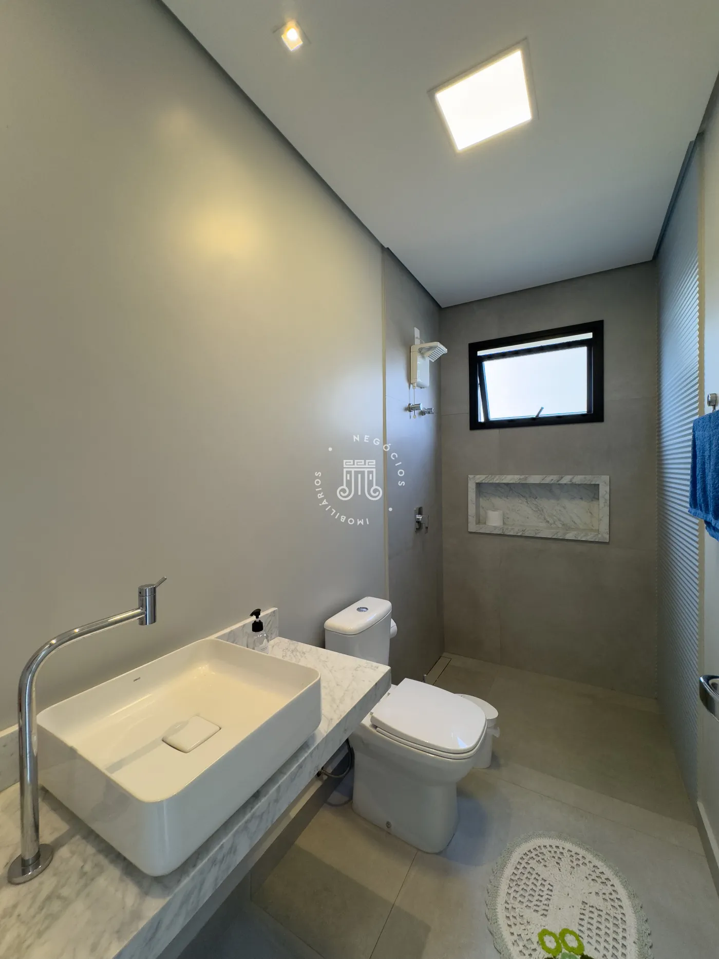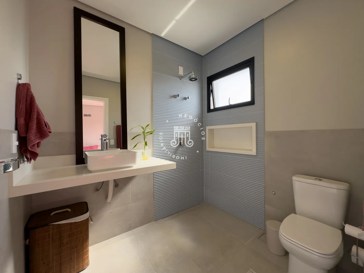 A casa também inclui lavabo, lavanderia, despensa, espaço gourmet com dois ambientes e churrasqueira a carvão. A piscina de alvenaria tem 32m², aquecimento solar, prainha e iluminação. A garagem acomoda 2 carros cobertos e 5 descobertos. Os revestimentos são de porcelanatos Portobello. Além disso, a casa possui um amplo escritório com vista para a piscina, infraestrutura para ar condicionado nos quartos e escritório, e um total de 5 banheiros.