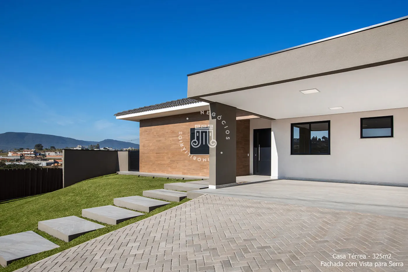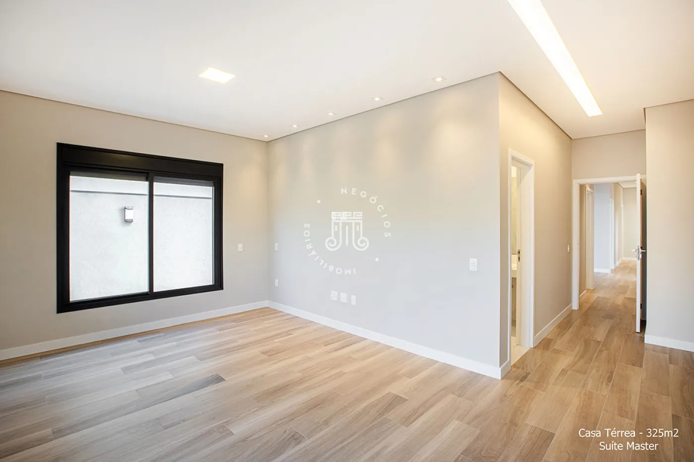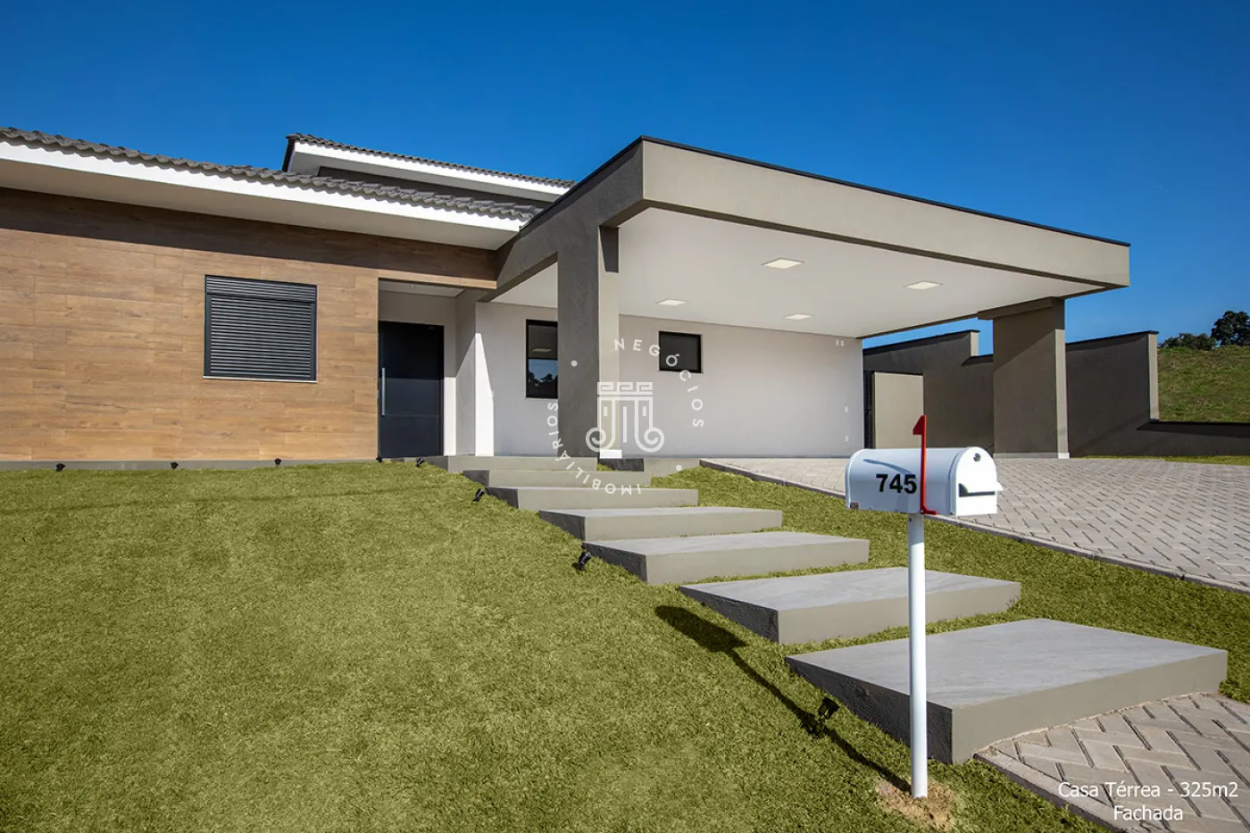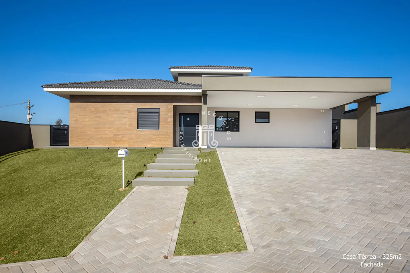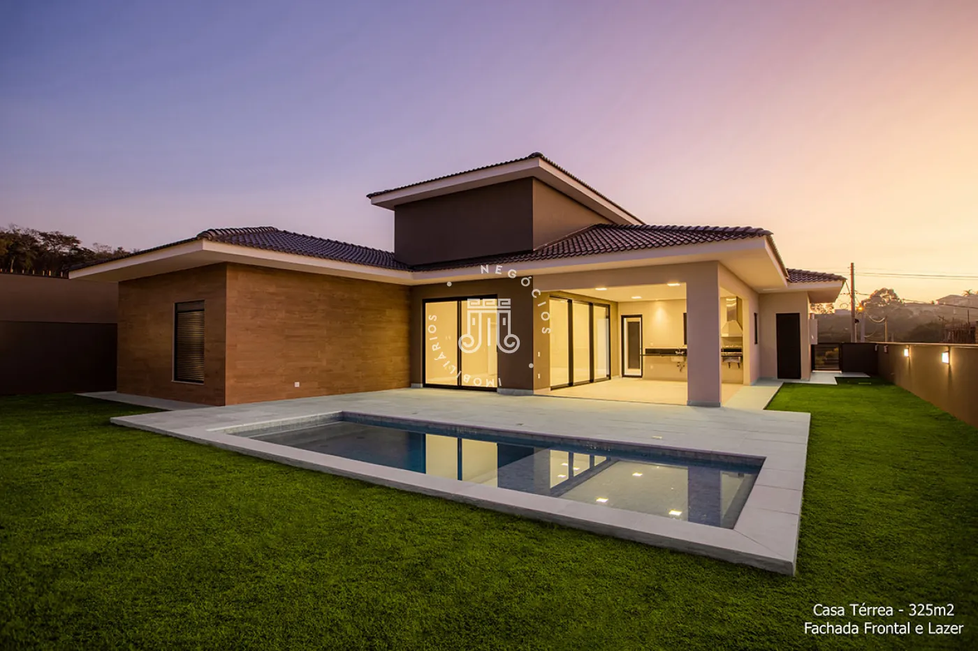 Residência térrea com 4 suítes, sendo uma master com closet, escritório, lavabo, salas de estar e jantar, cozinha, despensa, área de serviço (coberta e descoberta), dormitório de serviço, banho de serviço, lazer com piscina aquecida, solário, espaço gourmet e banho externo e garagem coberta para 3 veículos.
