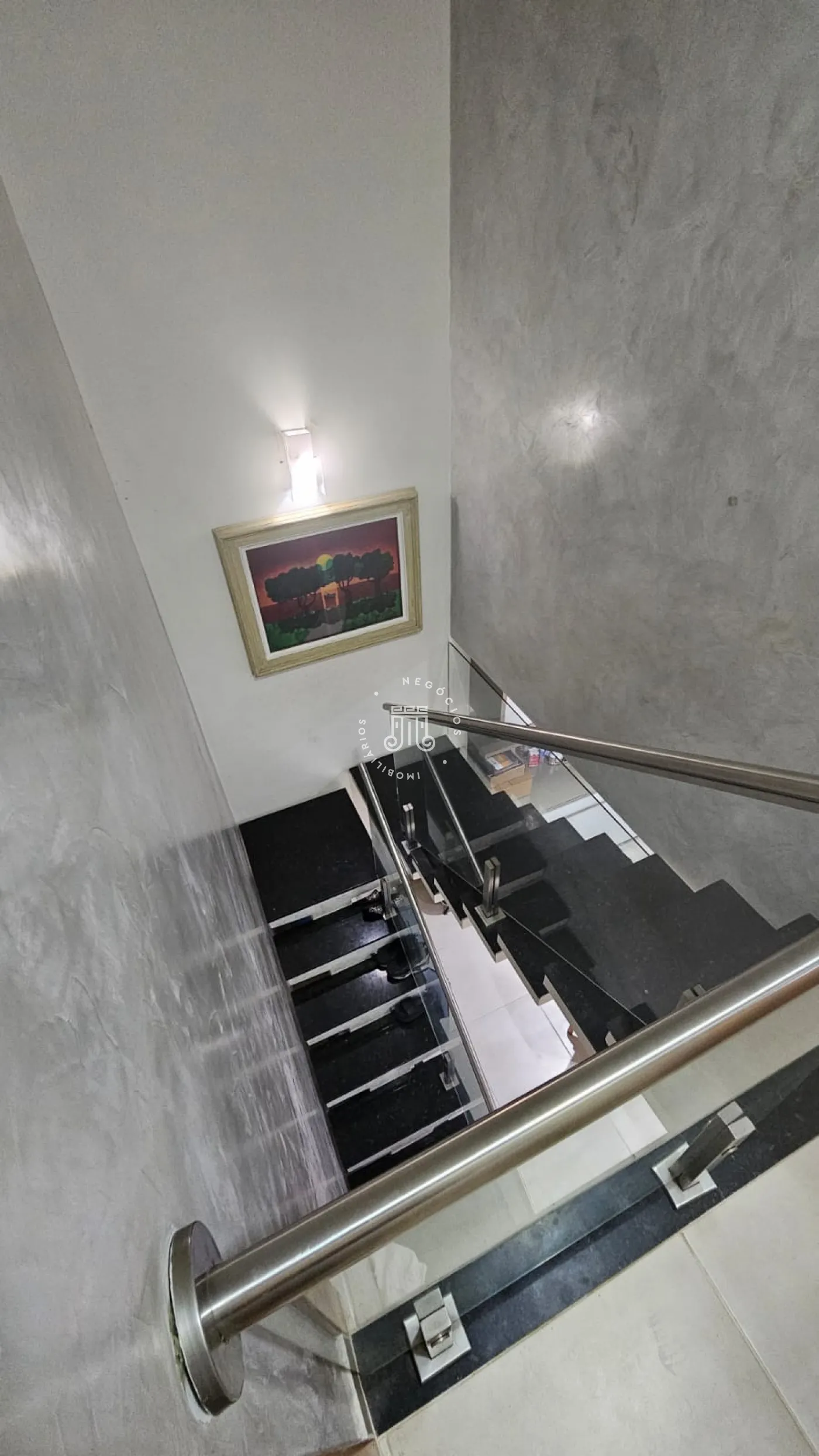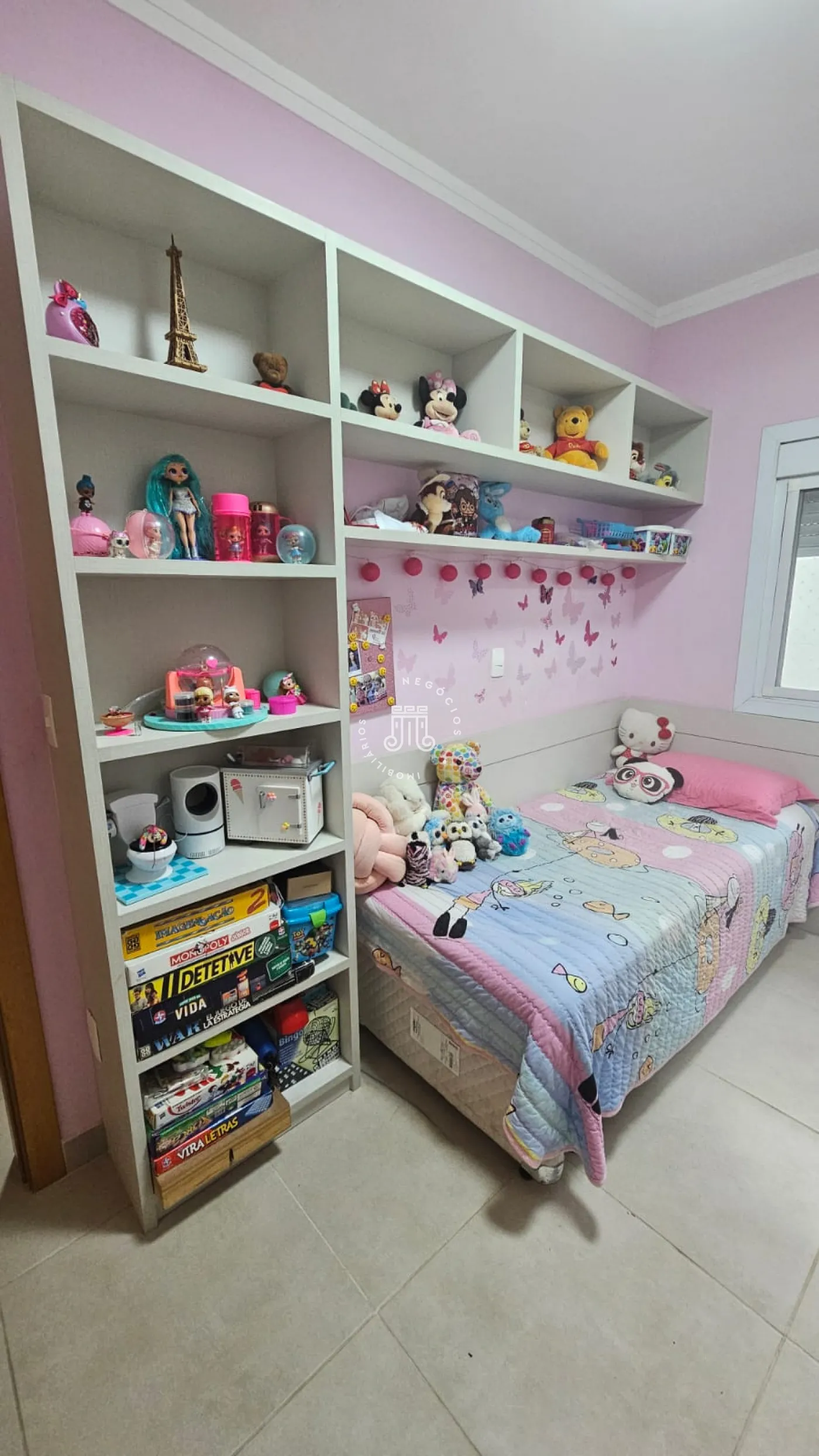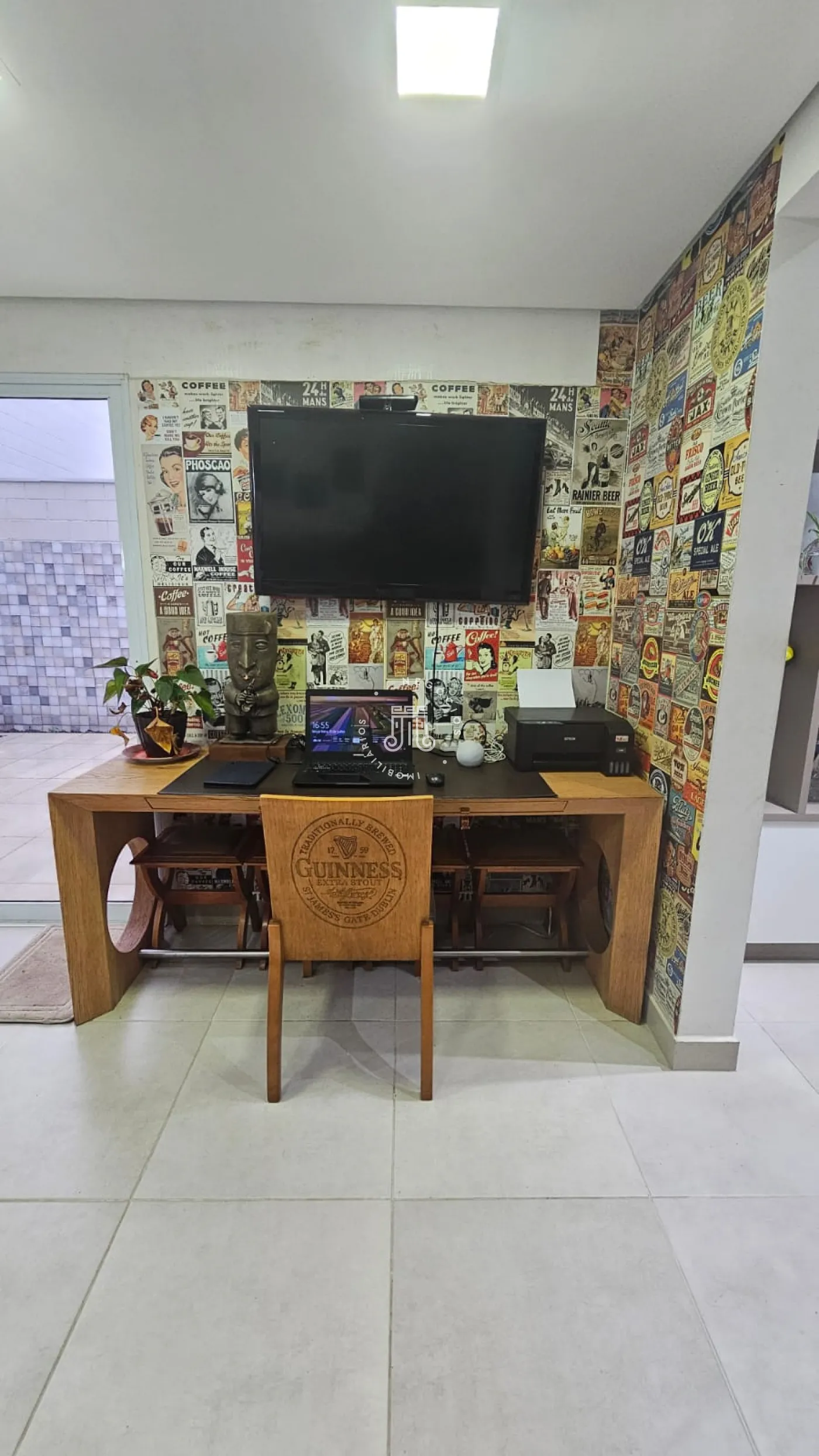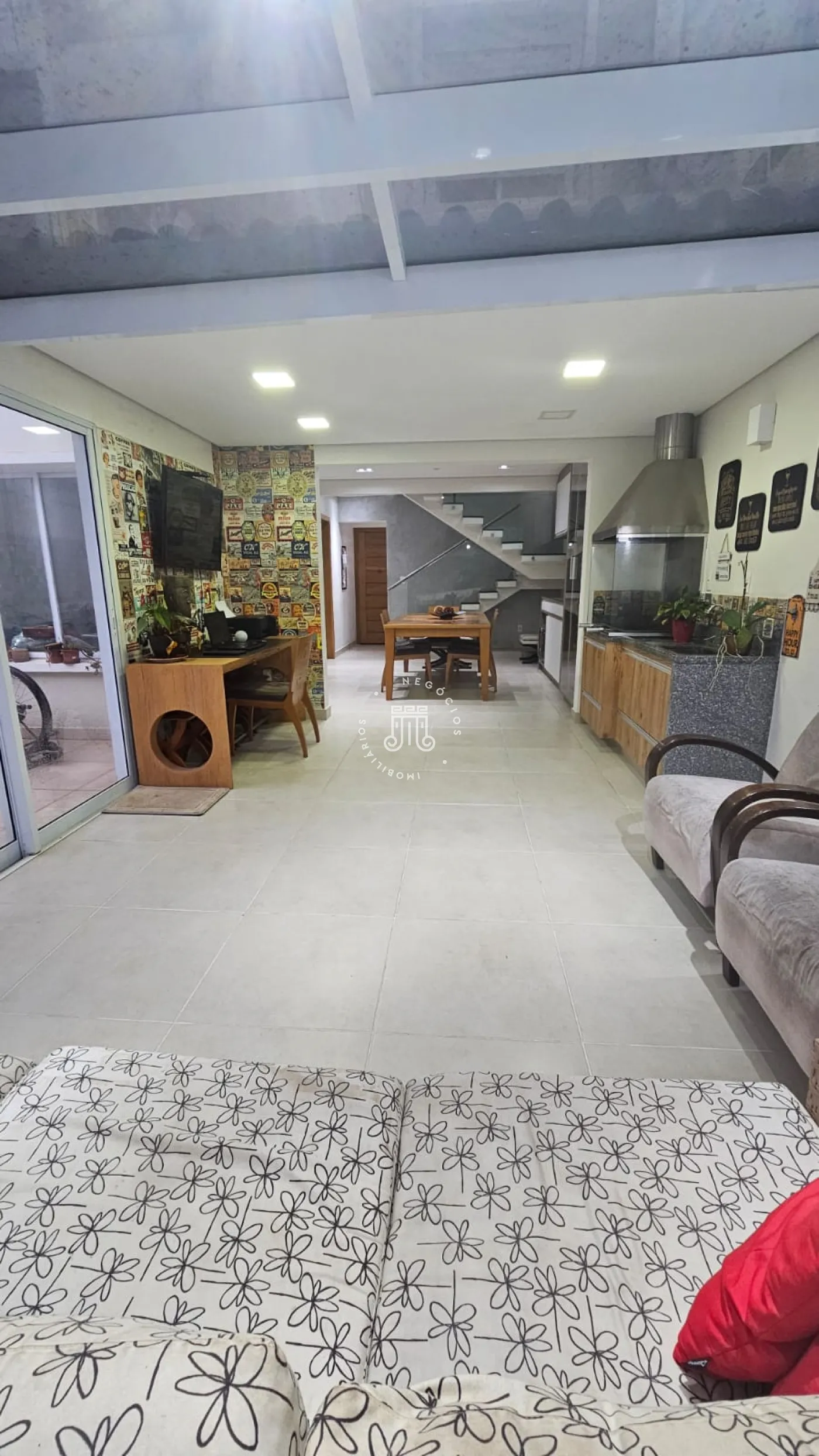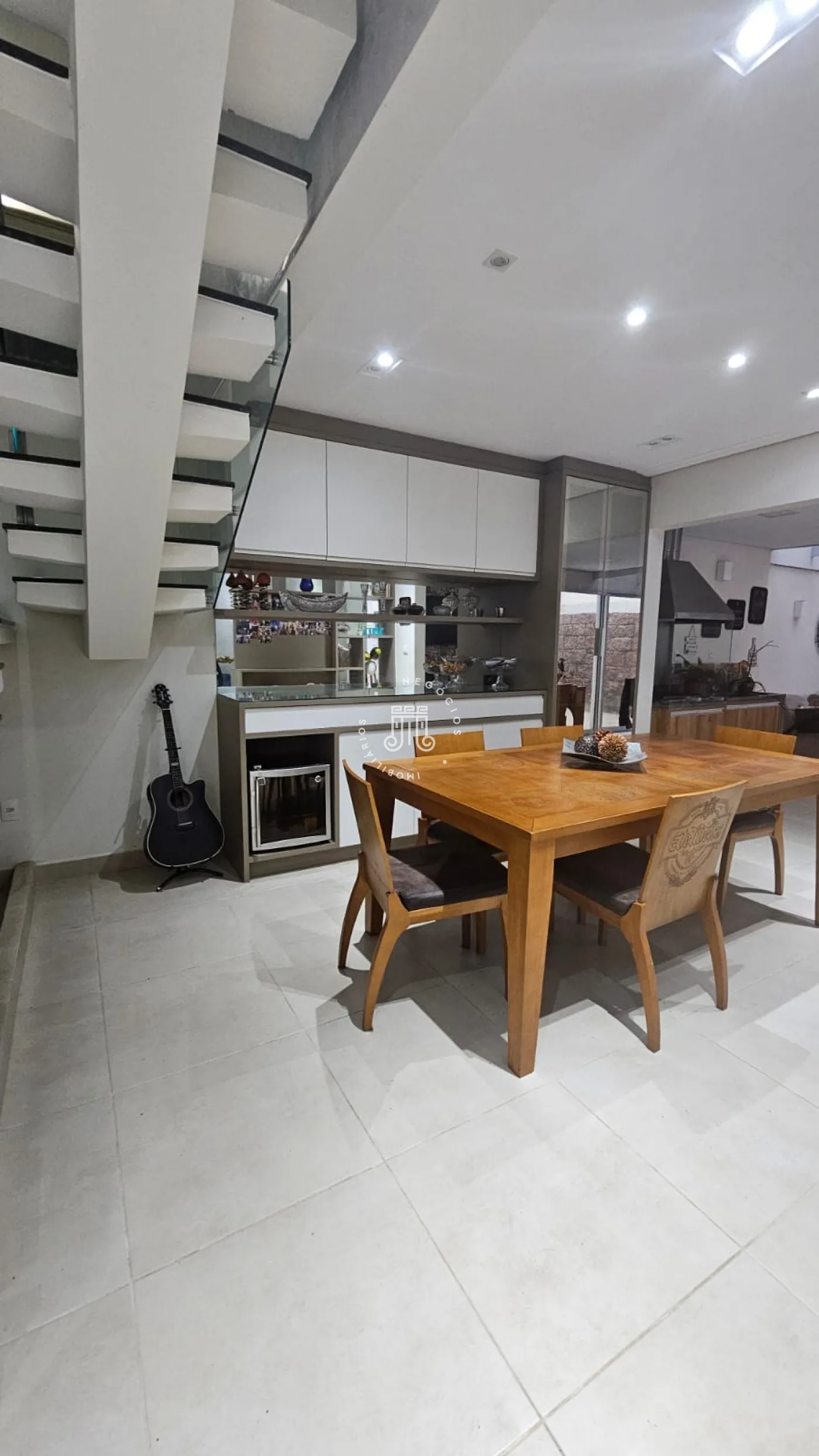 Com três dormitórios, sendo uma suíte com closet, sala de estar, sala de jantar, lavabo, banheiro social, cozinha, área de serviço, quintal com churrasqueira e vaga para 3 carros.