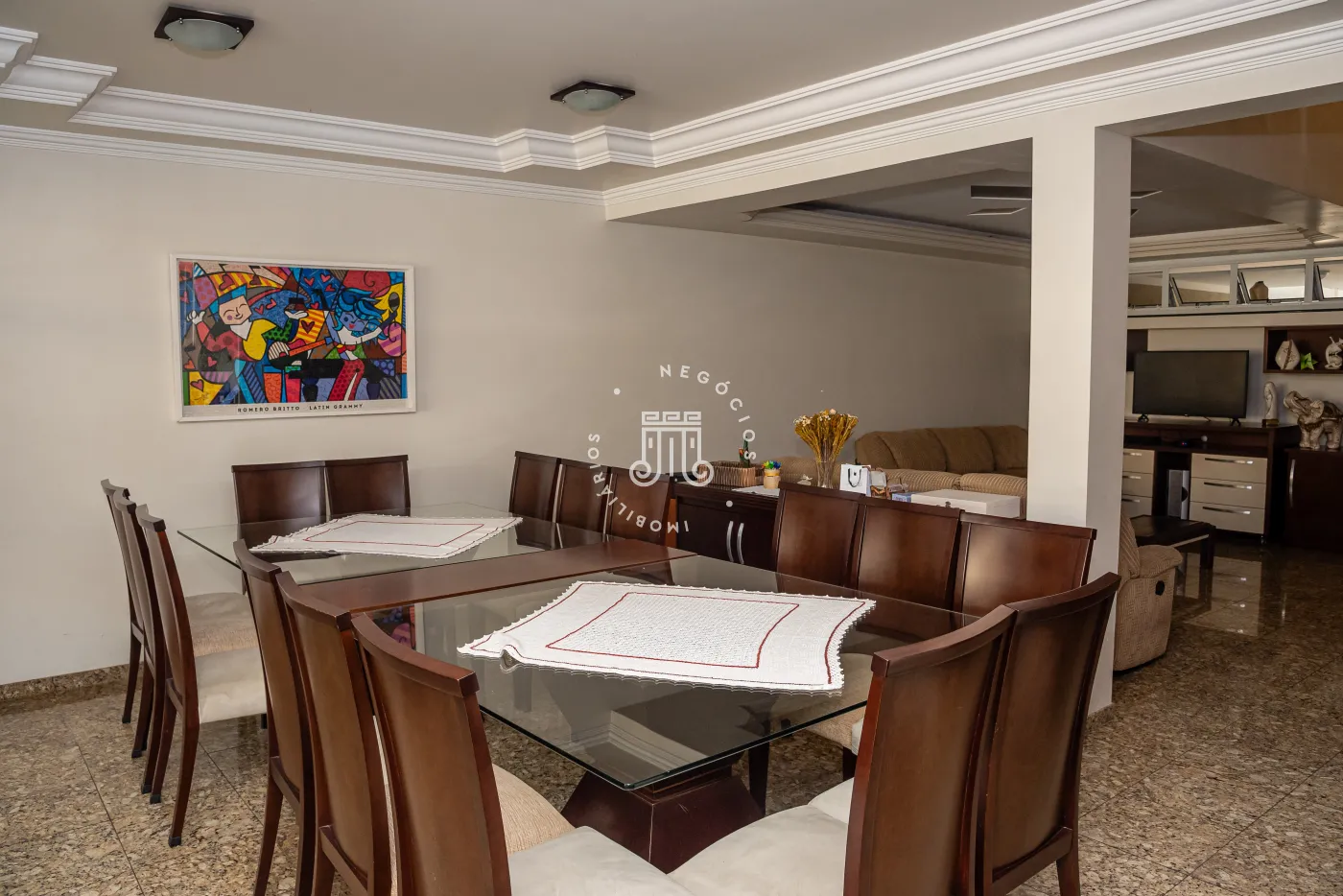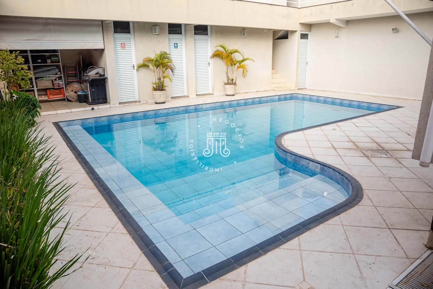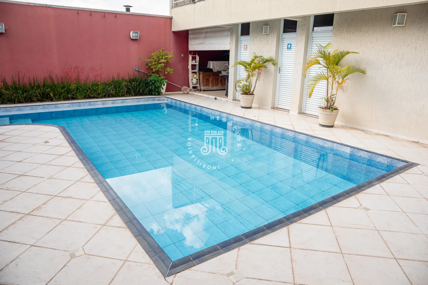 Piso Inferior: 01 suíte, 04 vagas de garagem cobertas, sala de estar, sala de jantar, lavabo, cozinha ampla, área de serviço, quintal amplo com piscina aquecida (aquecedor elétrico), churrasqueira, sauna e 02 banheiros na área externa.