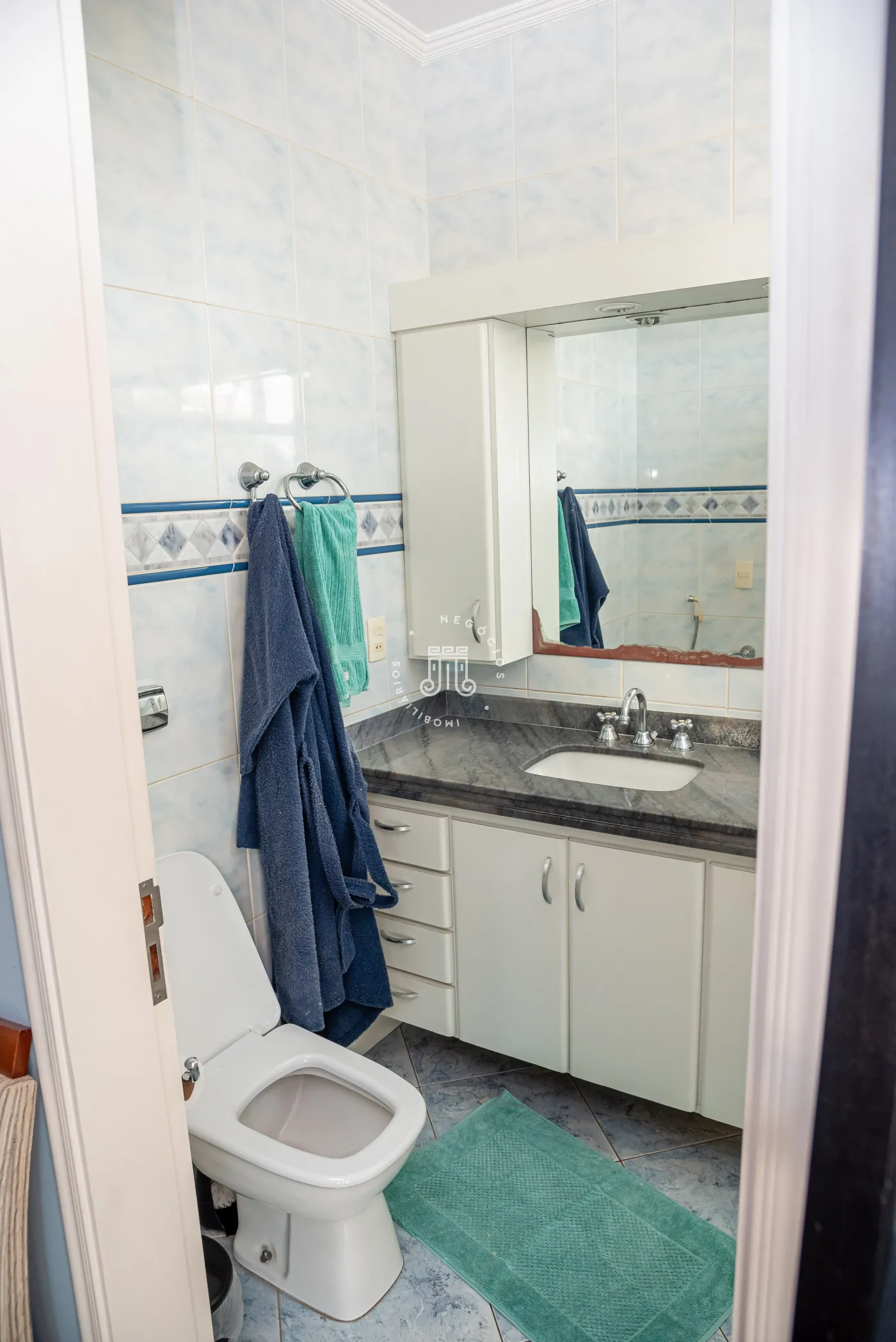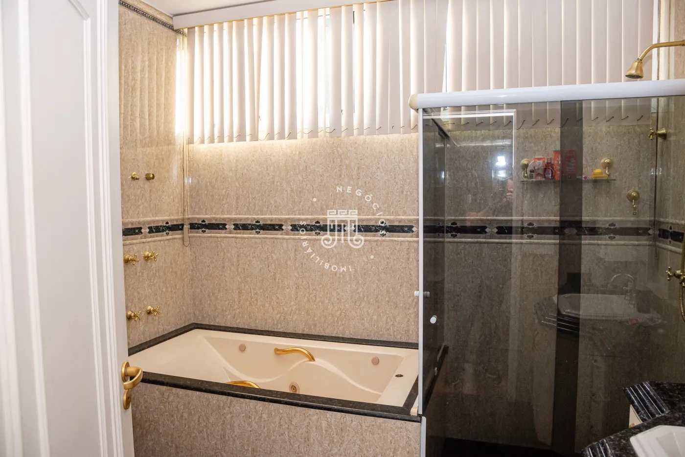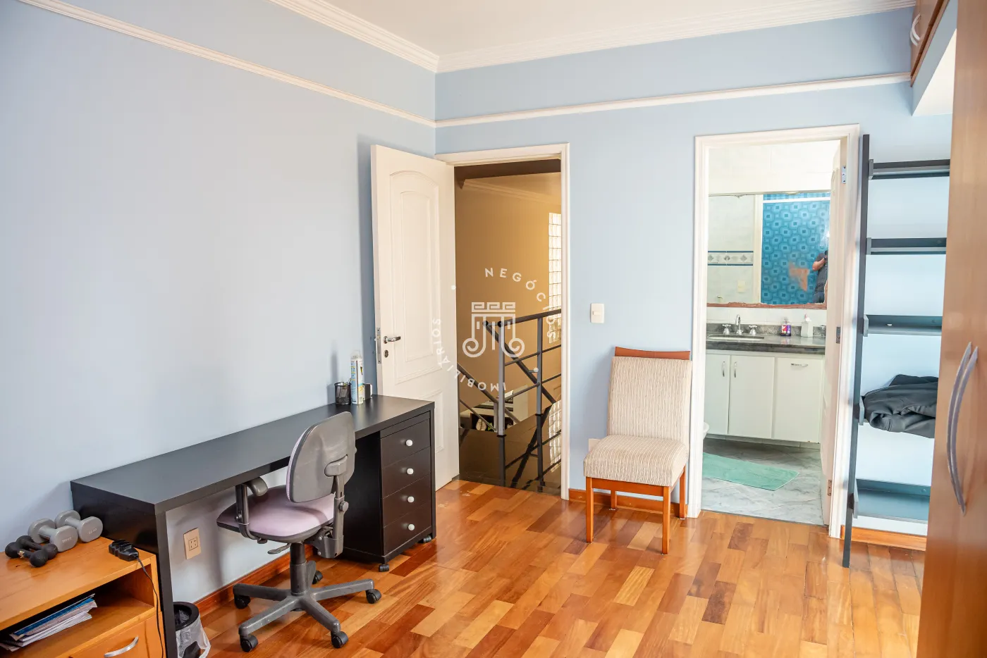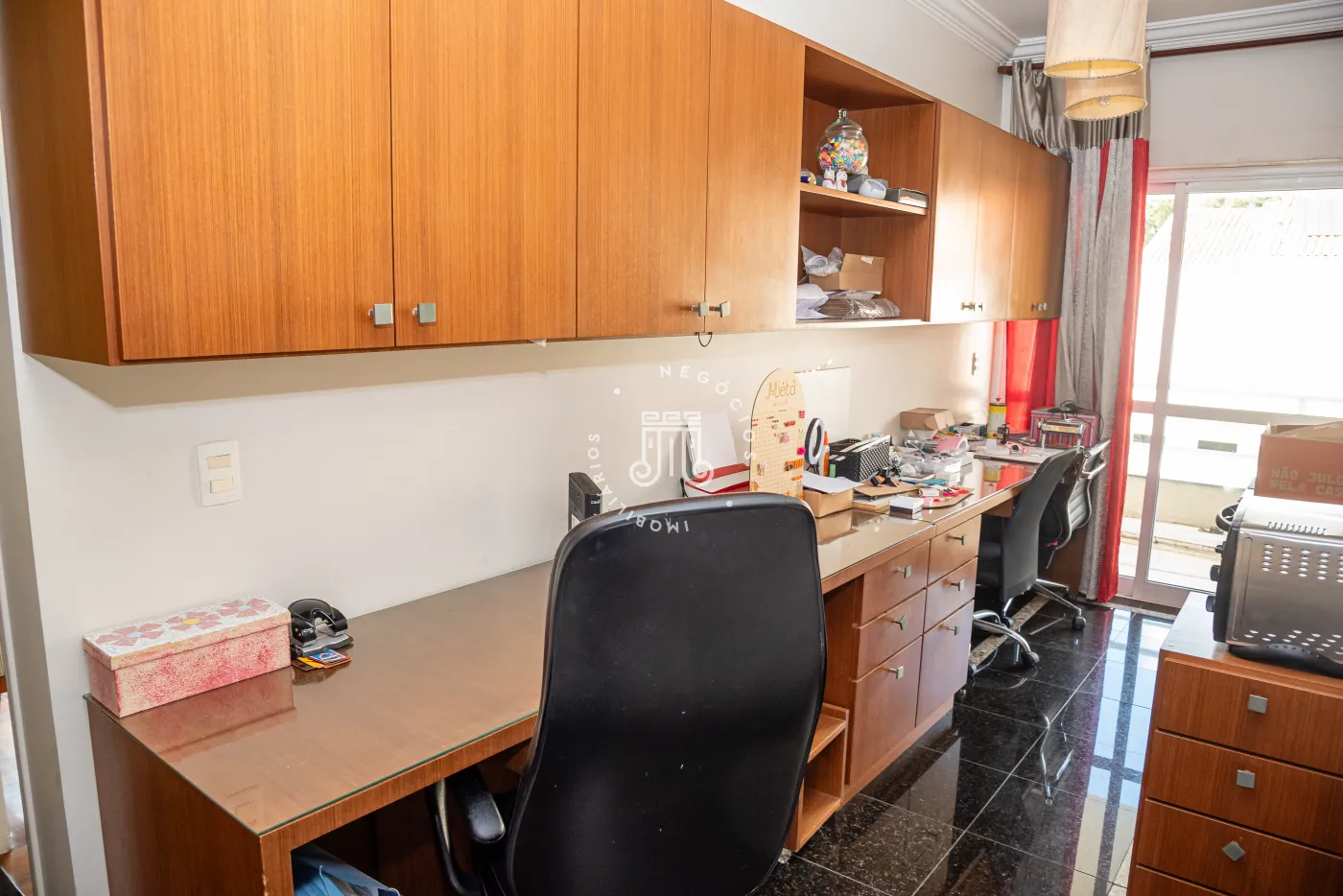 No piso superior 01 escritório e 03 suítes, todas com varanda, sendo uma master, com closet e banheira de hidromassagem.