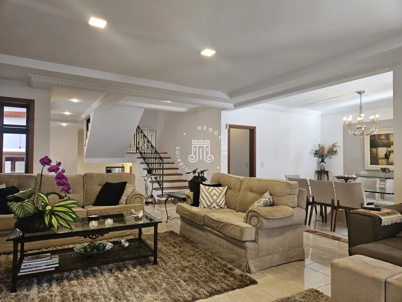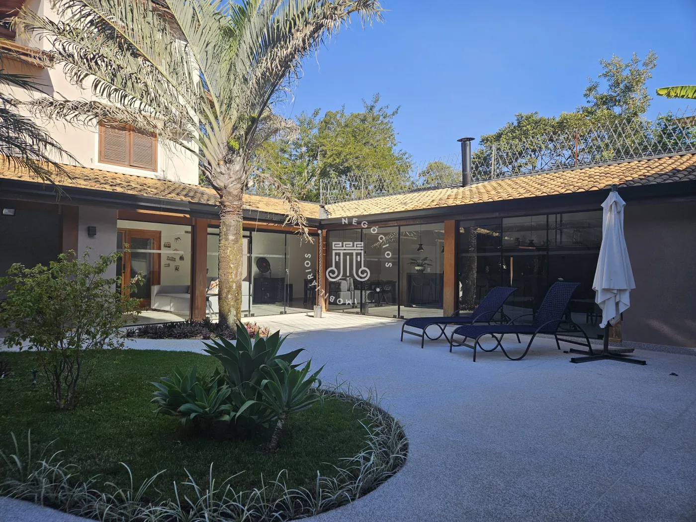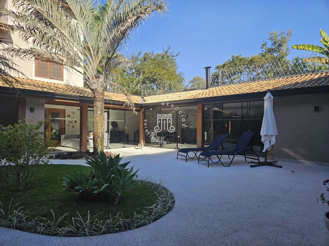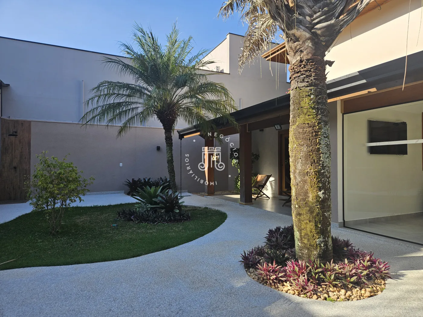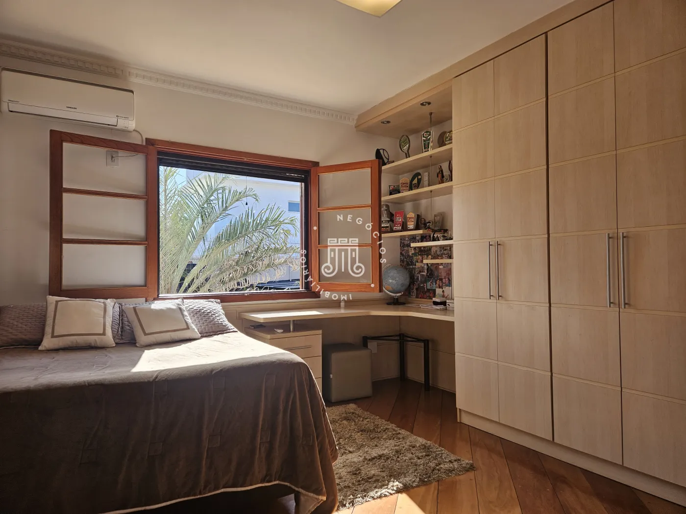 O imóvel possui área total construída de 424 m². Conta com três dormitórios, todos com suíte.