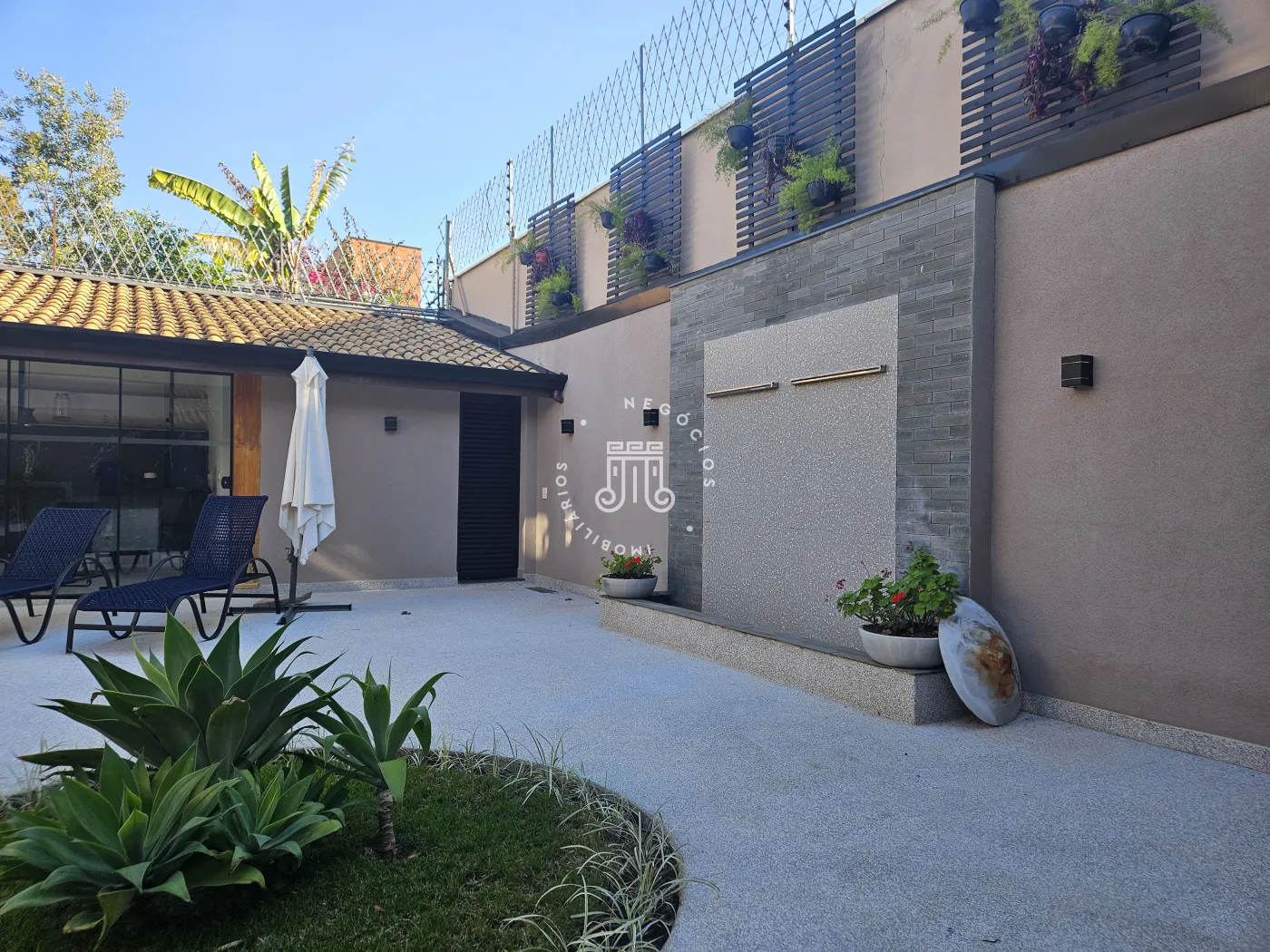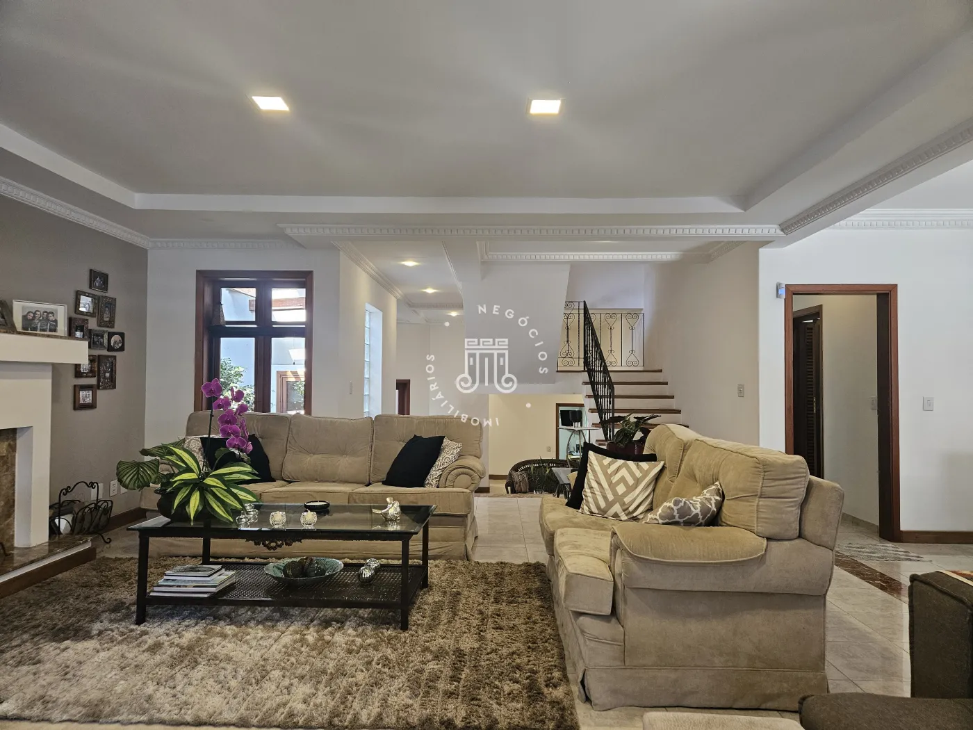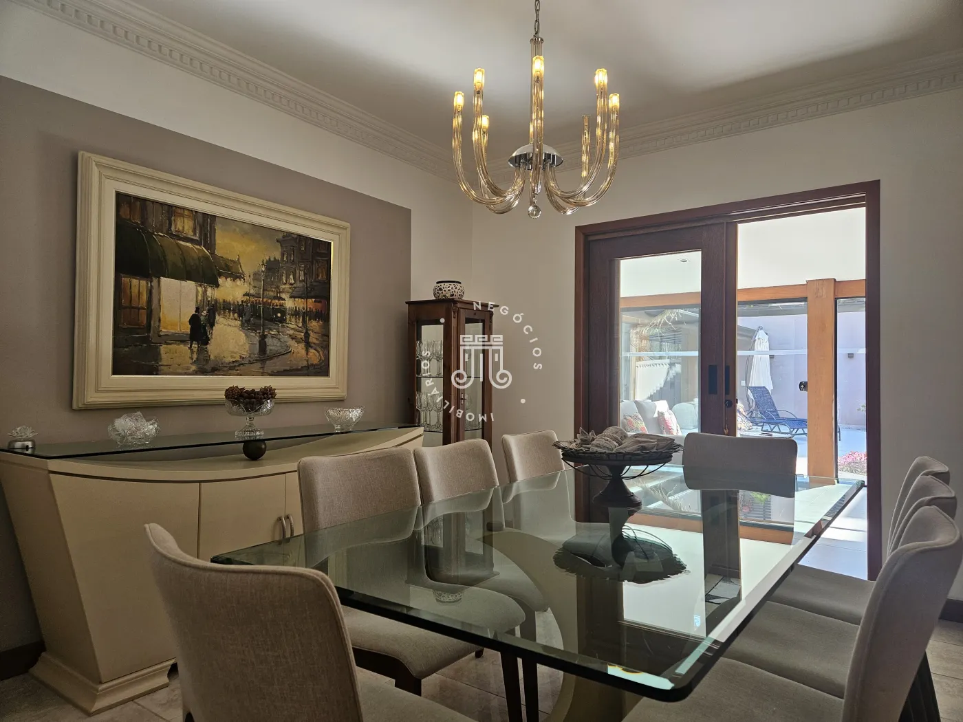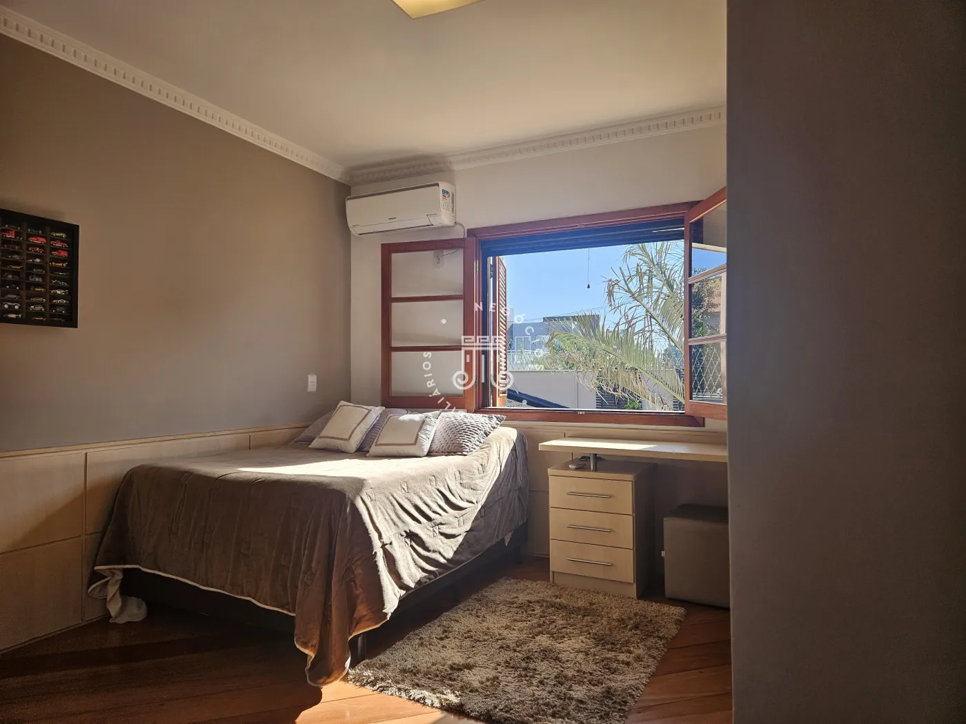 O imóvel possui área total construída de 424 m². Conta com três dormitórios, todos com suíte.