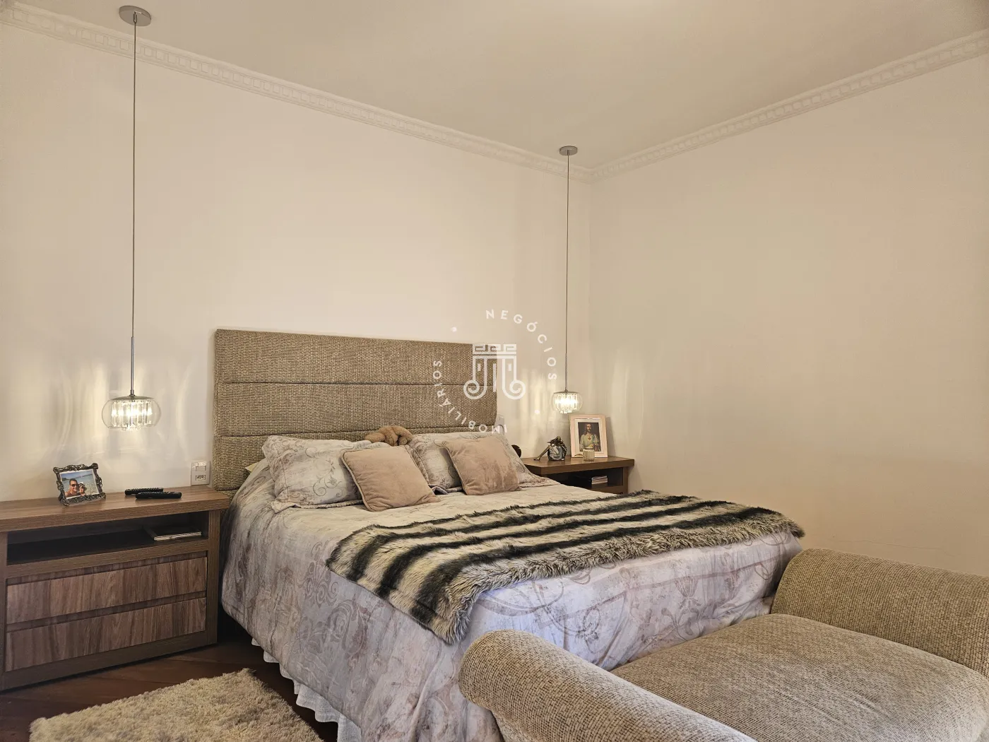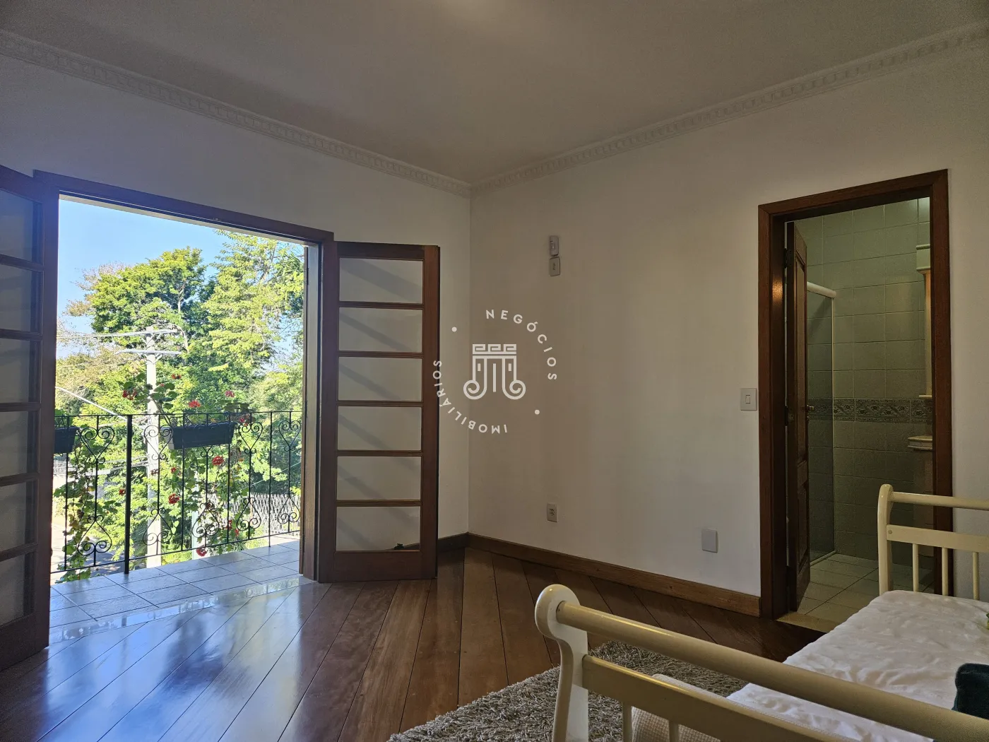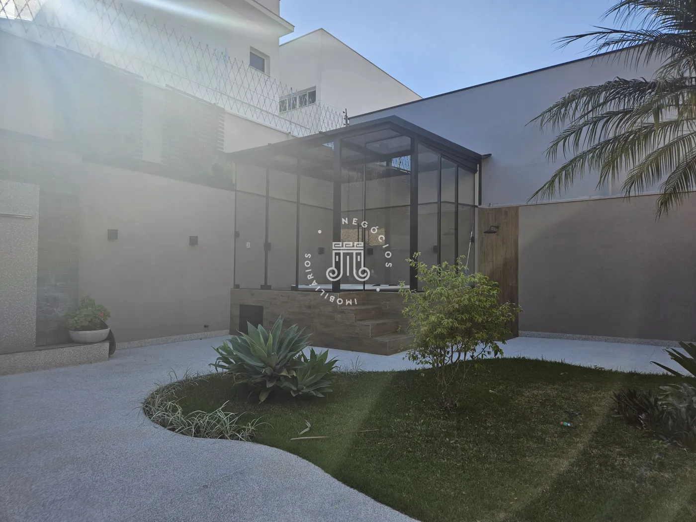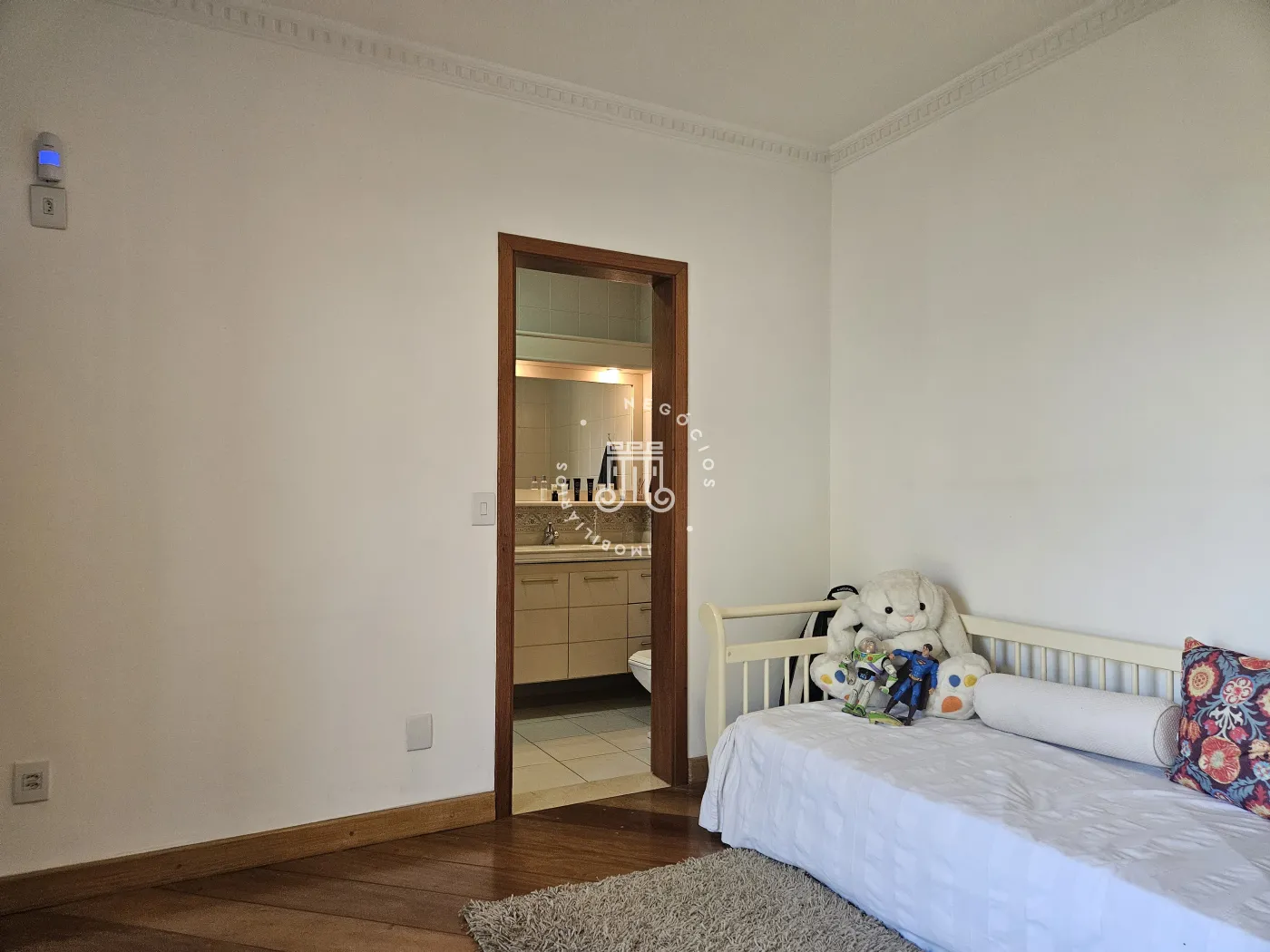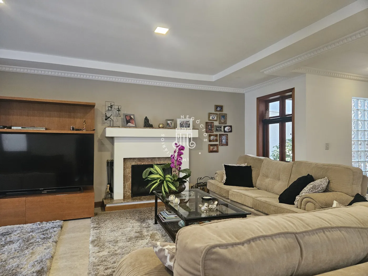 O imóvel possui área total construída de 424 m². Conta com três dormitórios, todos com suíte.