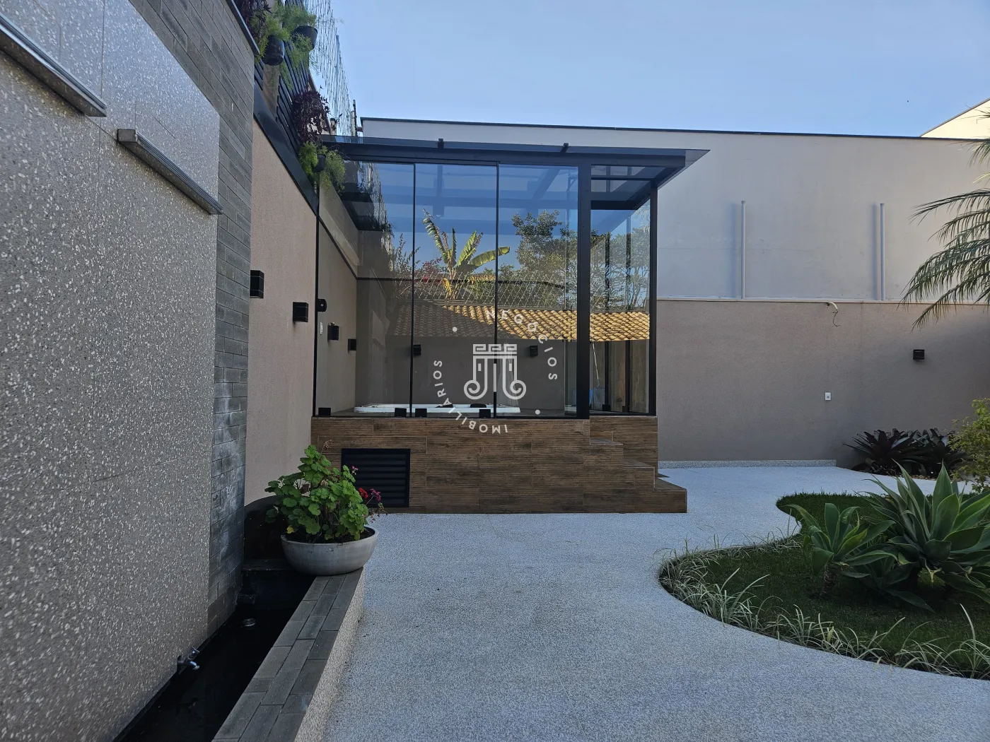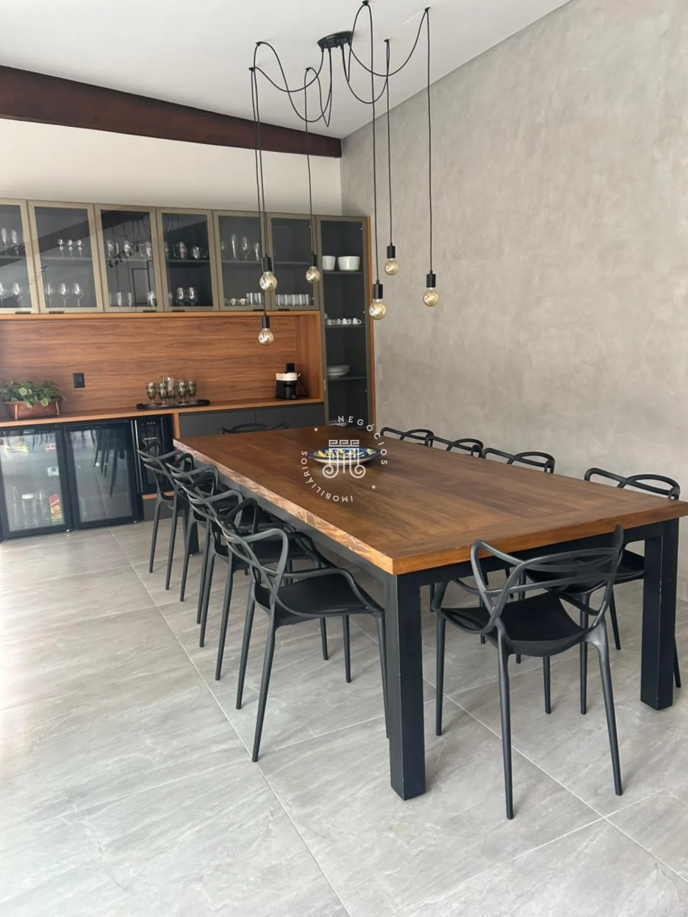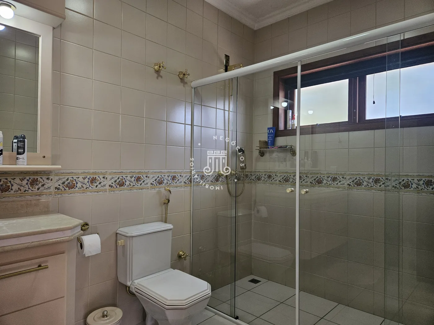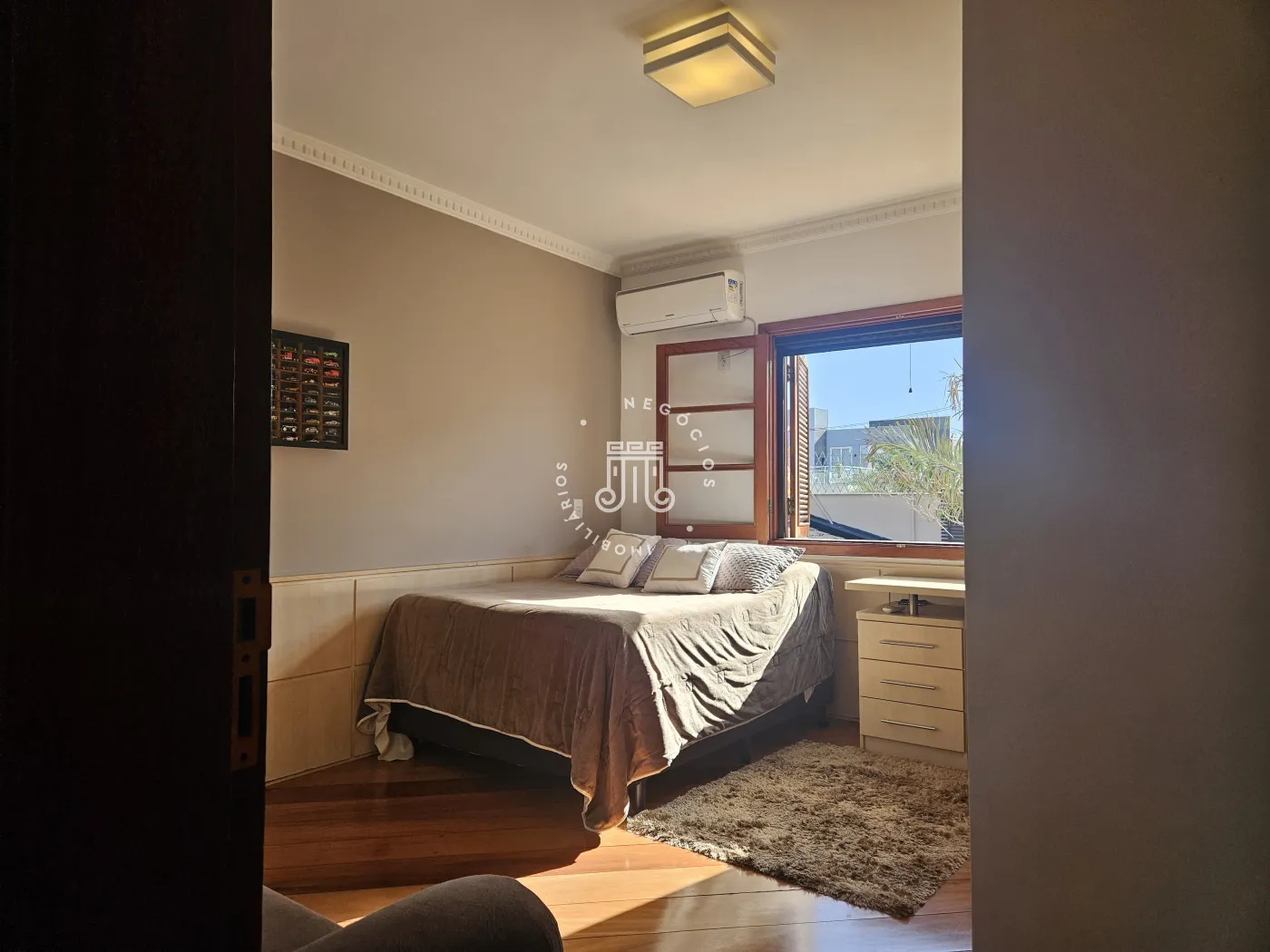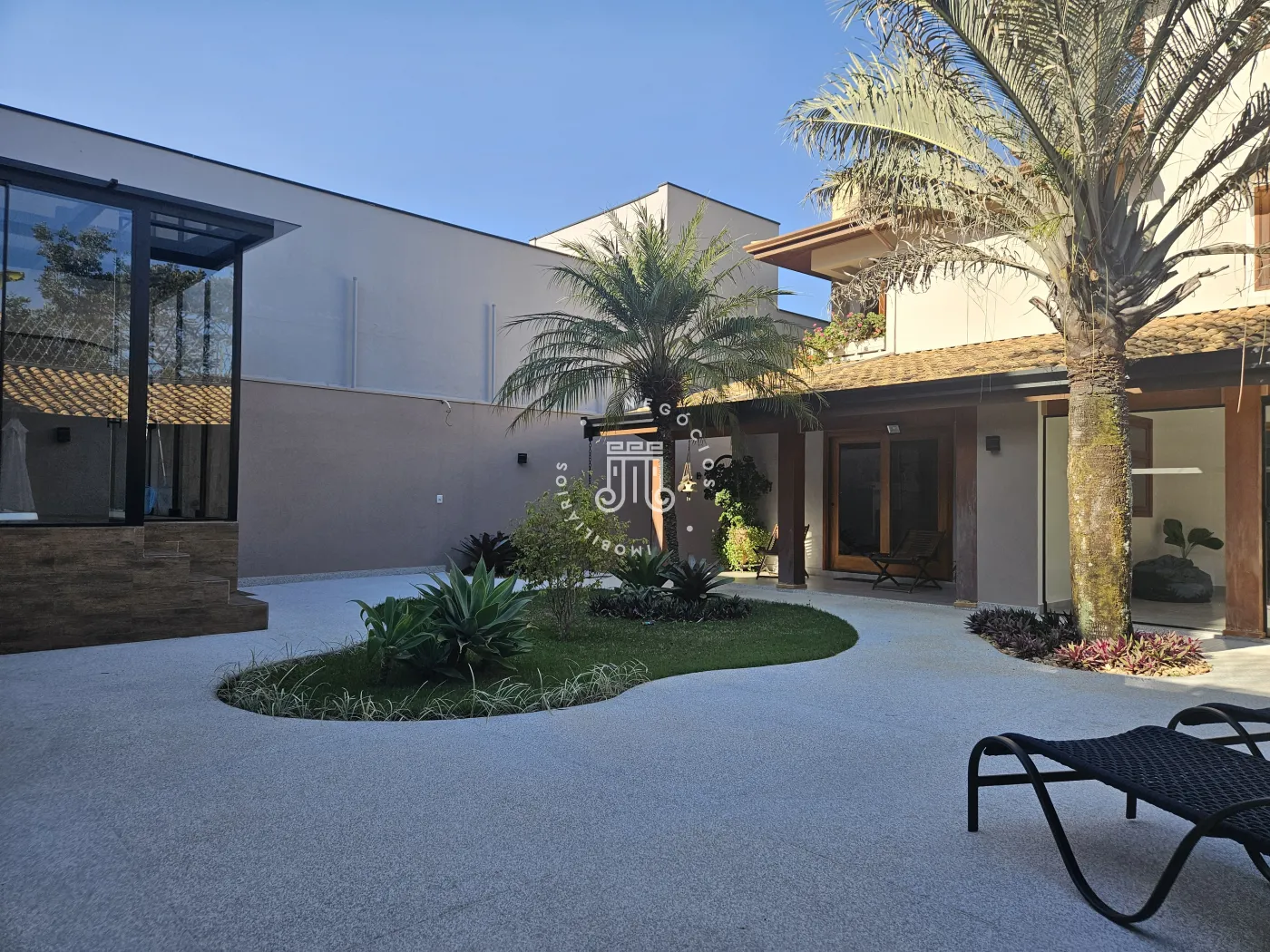 O imóvel possui área total construída de 424 m². Conta com três dormitórios, todos com suíte.