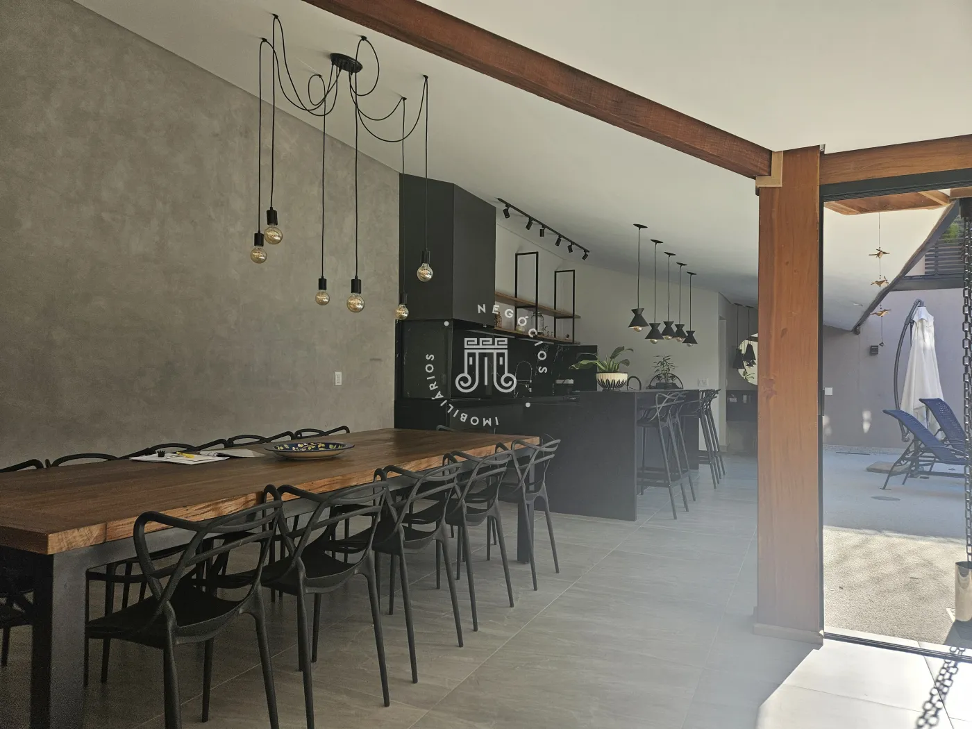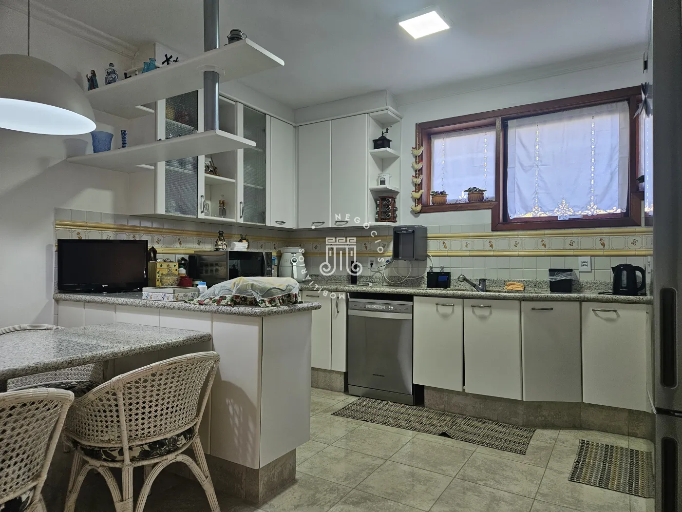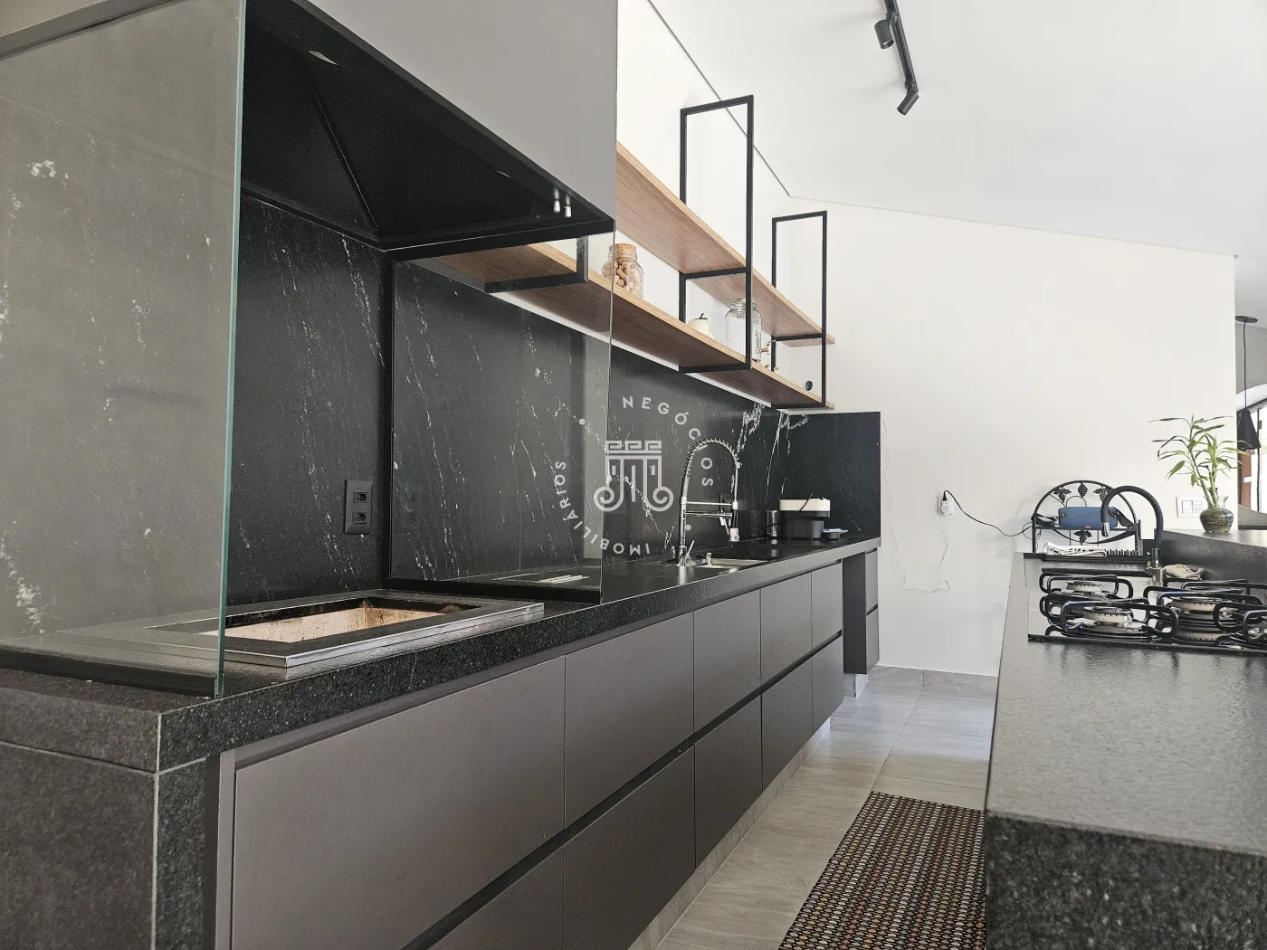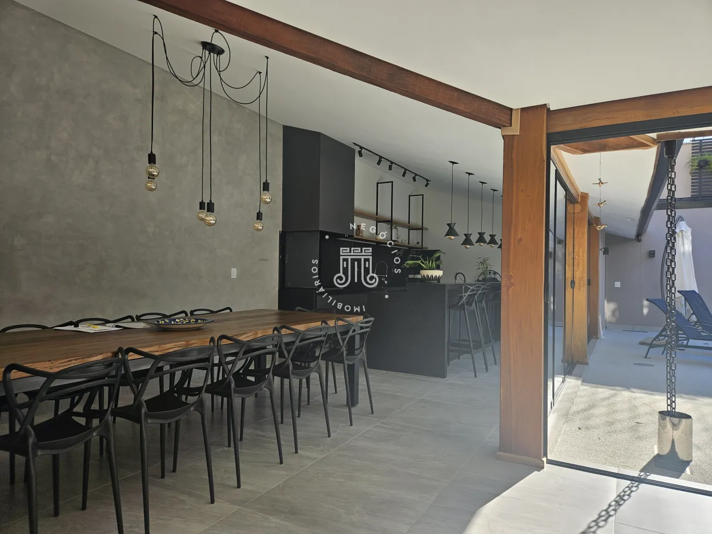 O imóvel possui área total construída de 424 m². Conta com três dormitórios, todos com suíte.