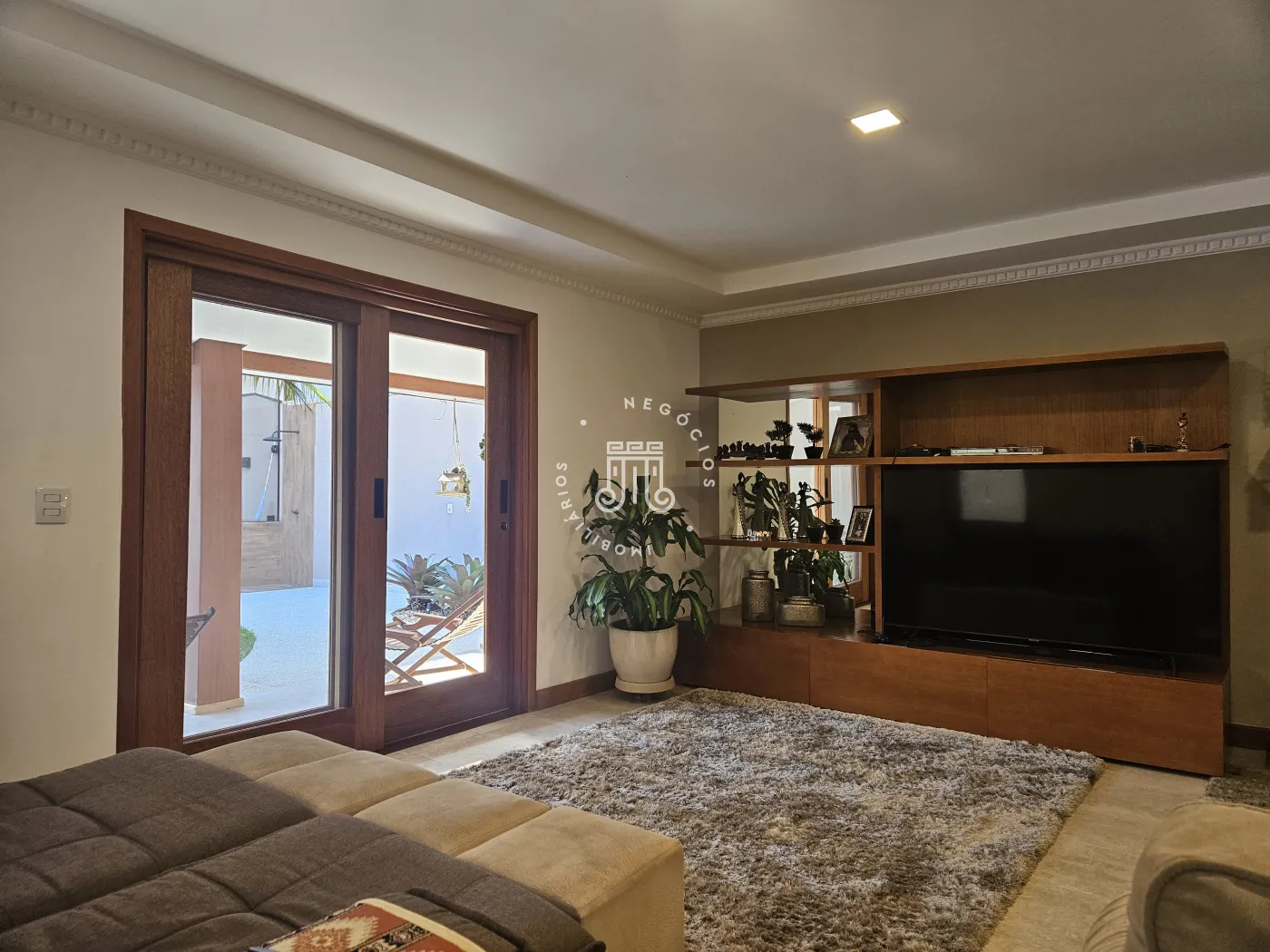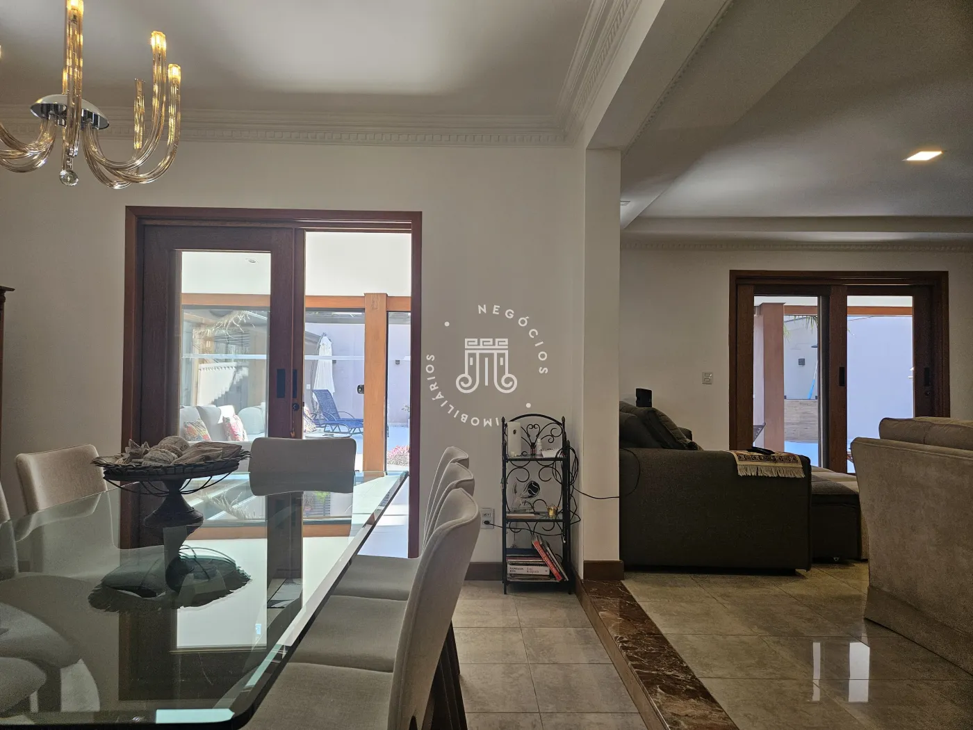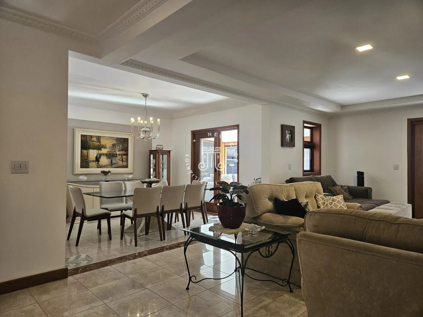 A sala é planejada para três ambientes, permitindo integração entre os espaços.
