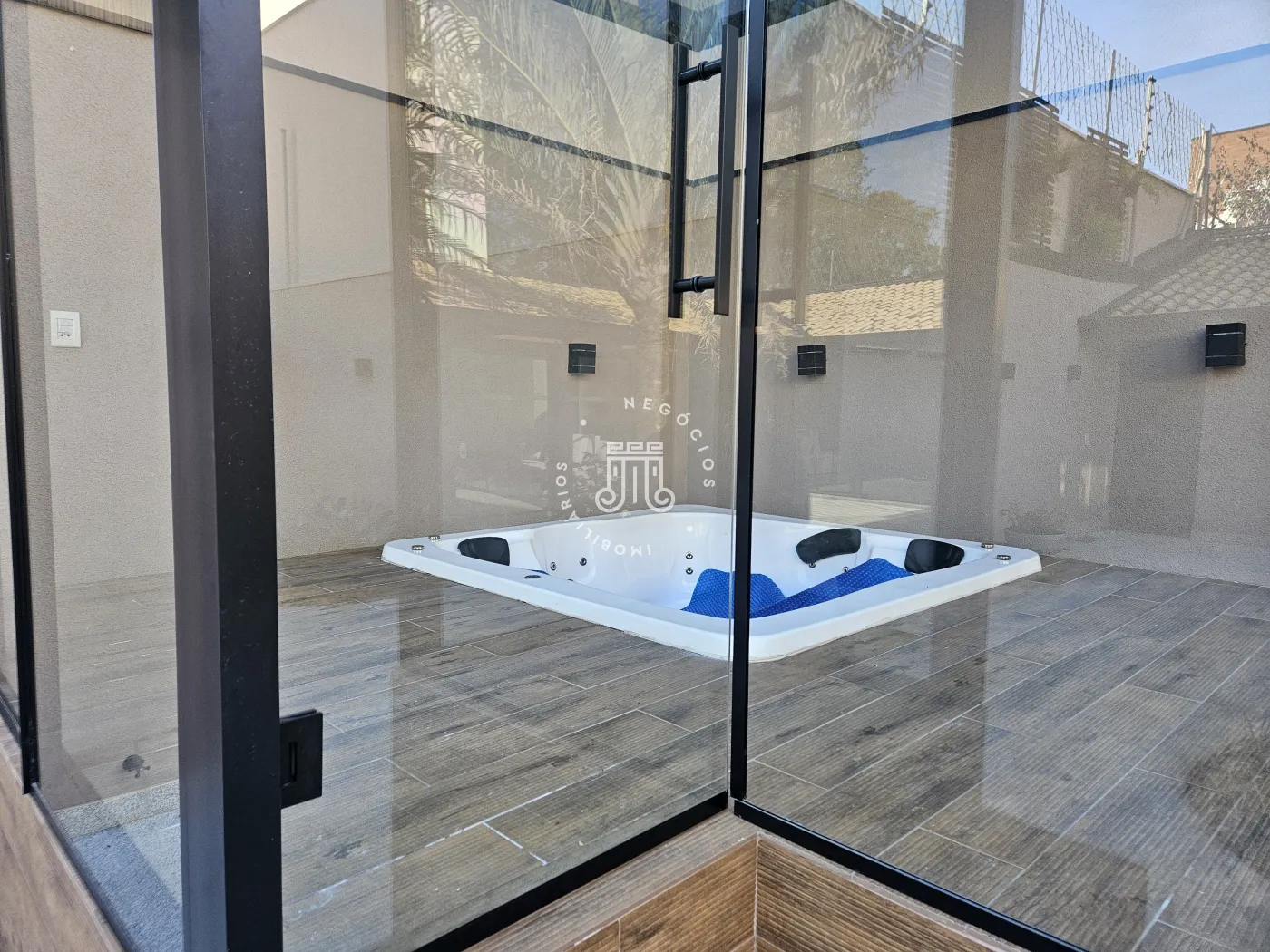 A área de lazer inclui espaço de convivência, churrasqueira e jacuzzi. Na parte externa, há estrutura destinada a reuniões e encontros.