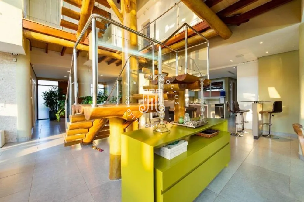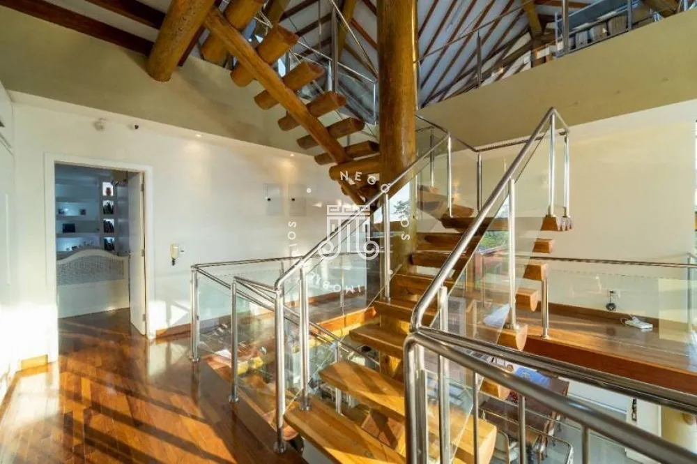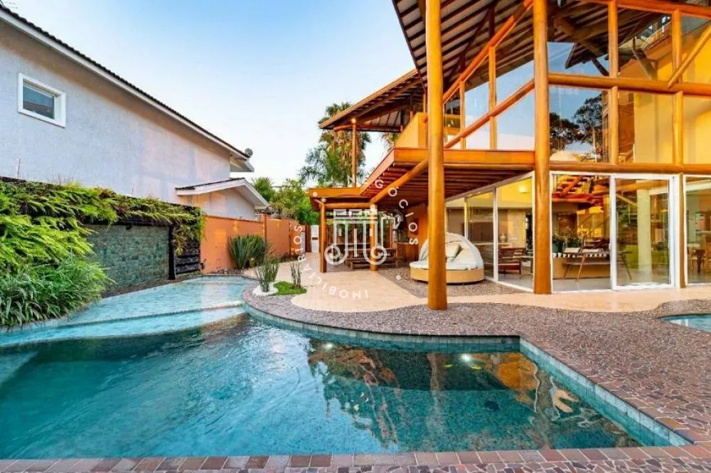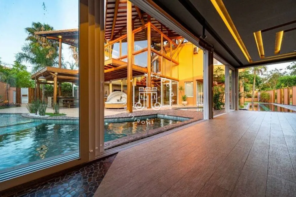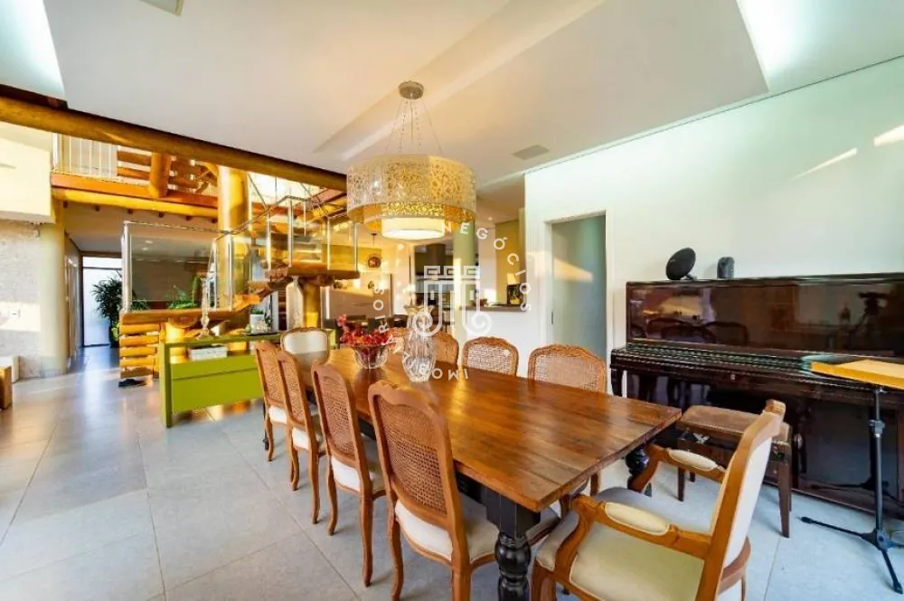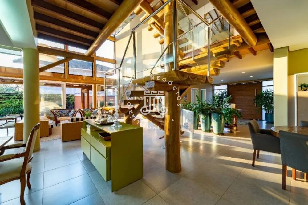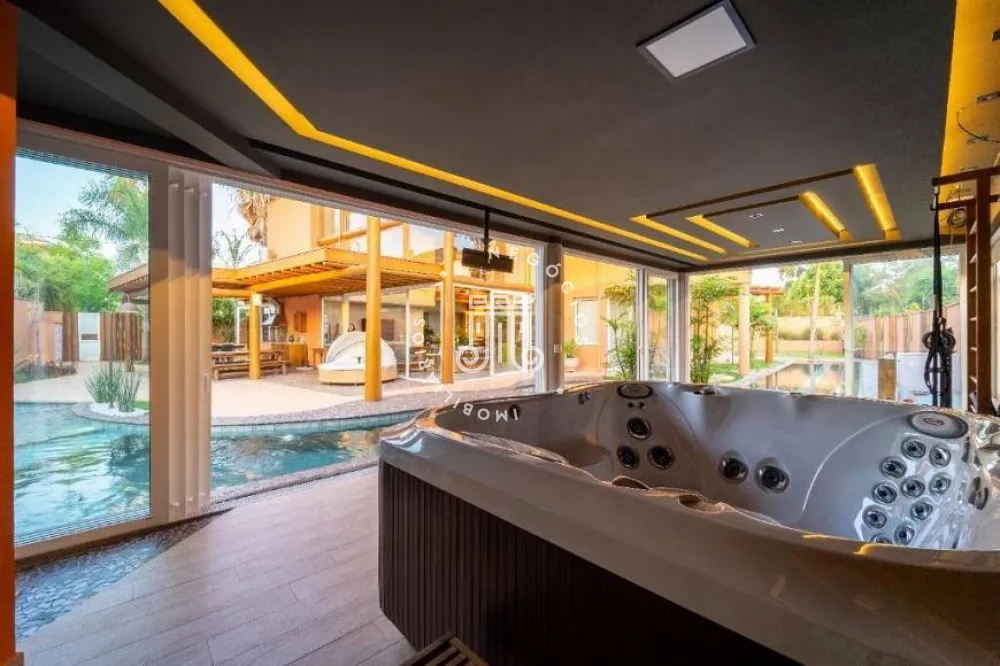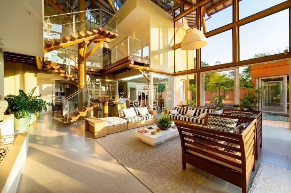Com 1.018 m² de área total e 865 m² de área construída. No piso superior, possui 3 suítes, sendo 1 suíte master com closet, sala de estar, penteadeira e hidro com vista para a mata e pôr do sol. No piso térreo, conta com 1 suíte, sala íntima de cinema, home office, lavabo, amplo living com sala de TV, sala de jantar, home bar e cozinha americana planejada, todos em conceito aberto integrando os ambientes, além de área de serviço. A área externa oferece quintal amplo com área gourmet, sala de ginástica, sauna seca com banheiro e 2 piscinas, sendo 1 com raia de 15 m e outra com hidromassagem, cascatas e iluminação controlada por automação.