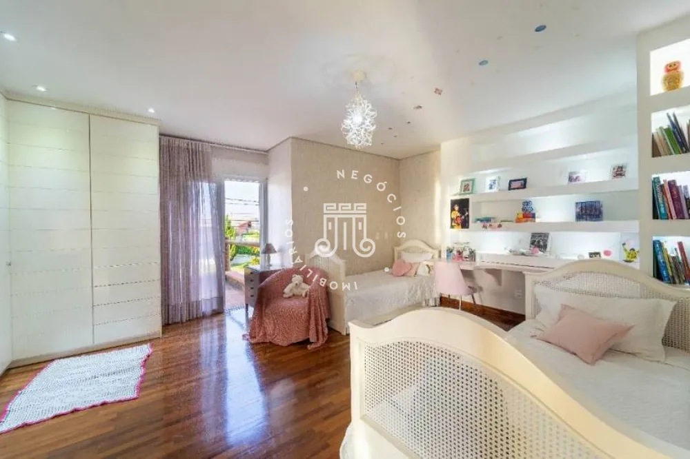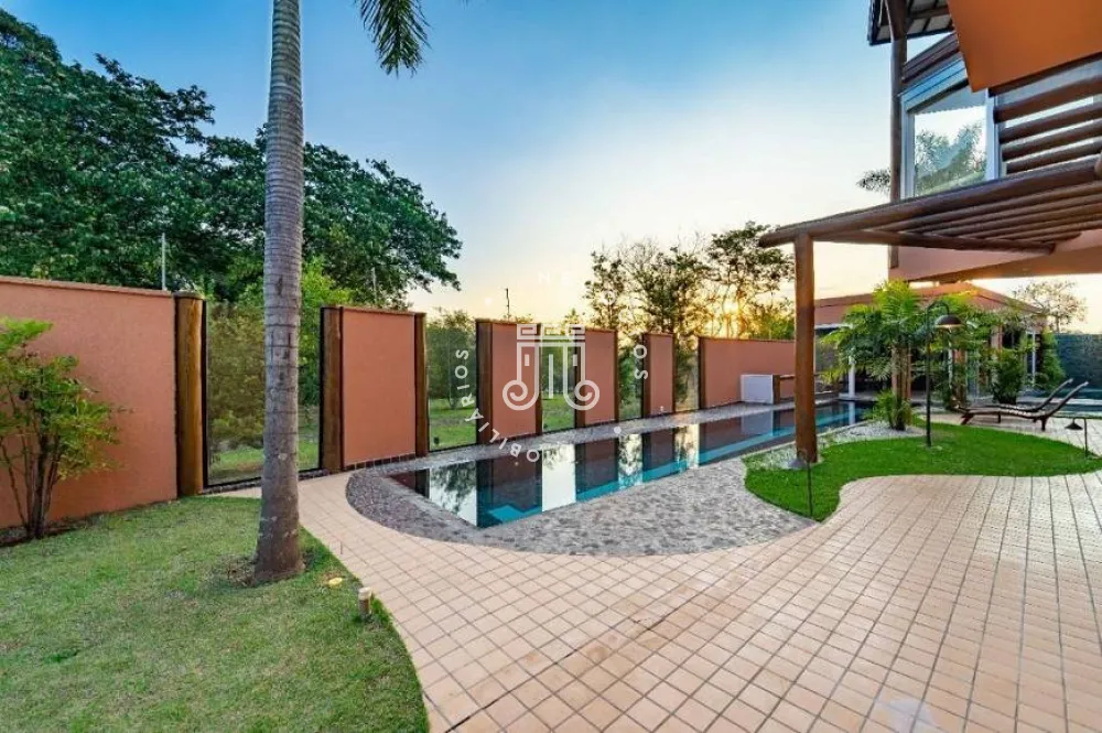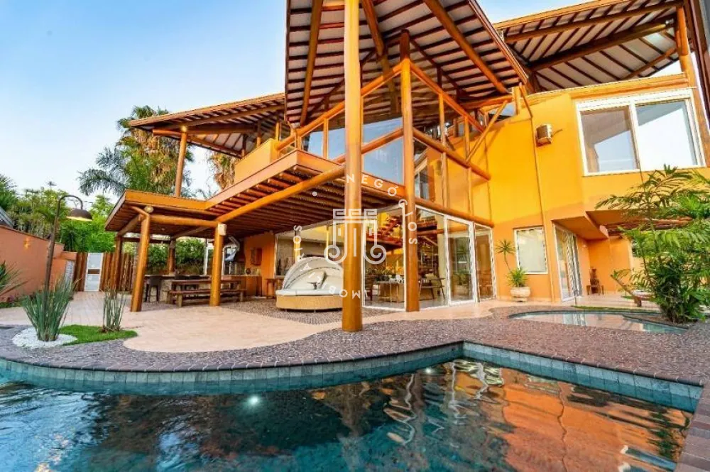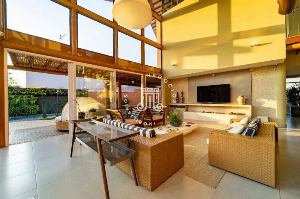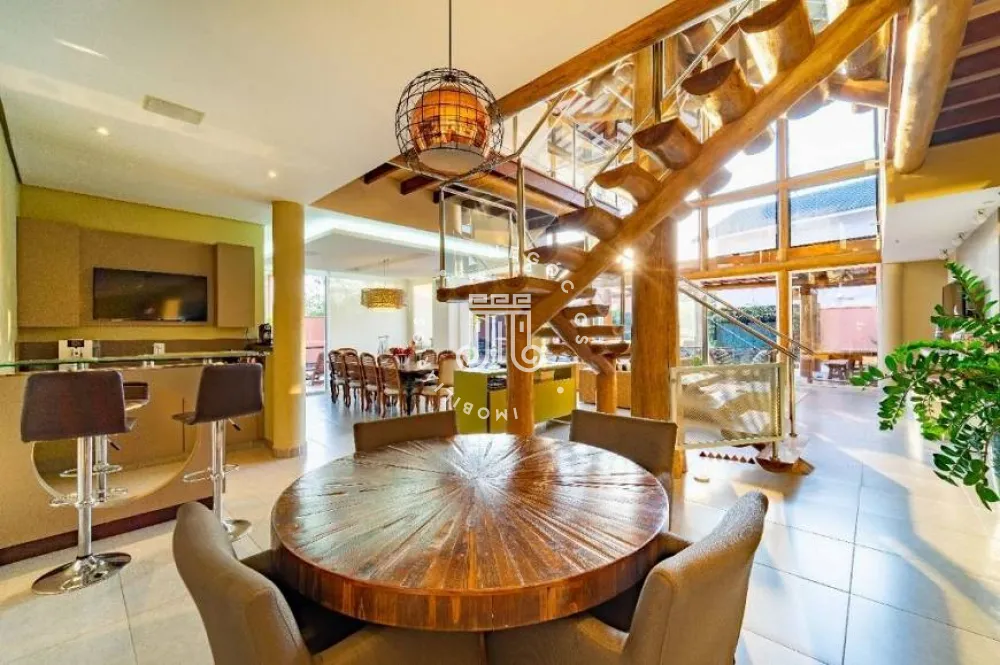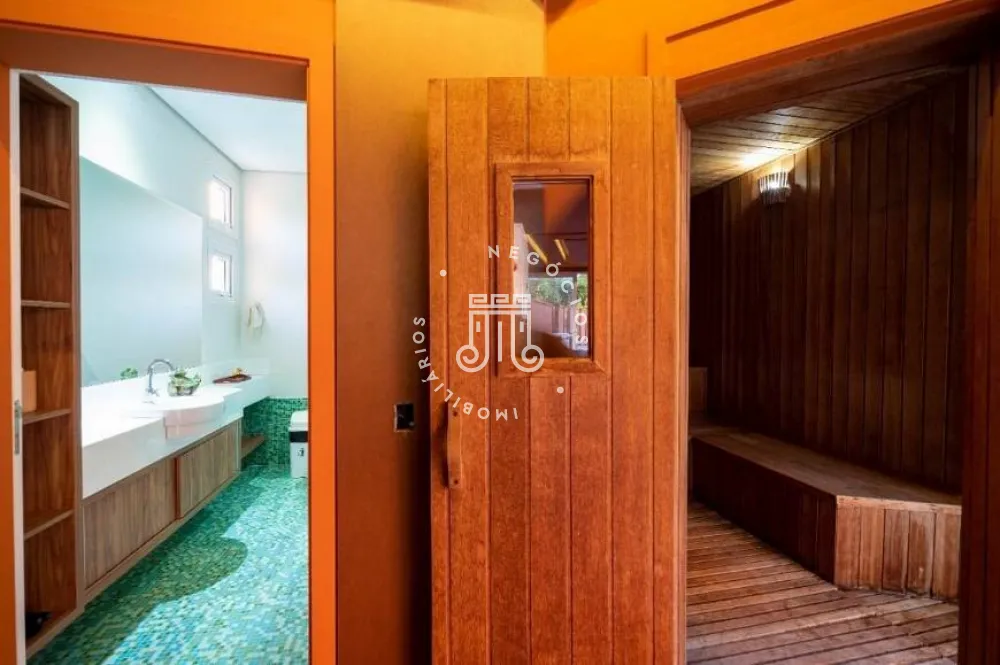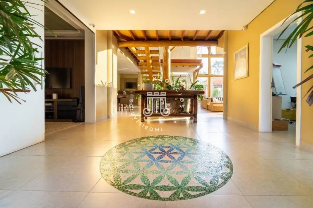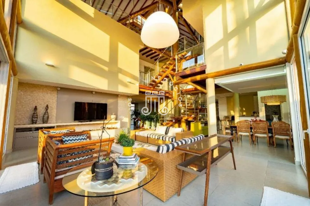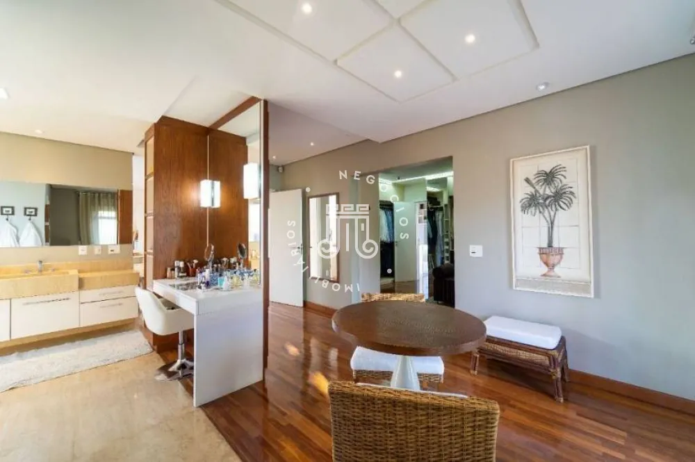 Com 1.018 m² de área total e 865 m² de área construída. No piso superior, possui 3 suítes, sendo 1 suíte master com closet, sala de estar, penteadeira e hidro com vista para a mata e pôr do sol. No piso térreo, conta com 1 suíte, sala íntima de cinema, home office, lavabo, amplo living com sala de TV, sala de jantar, home bar e cozinha americana planejada, todos em conceito aberto integrando os ambientes, além de área de serviço. A área externa oferece quintal amplo com área gourmet, sala de ginástica, sauna seca com banheiro e 2 piscinas, sendo 1 com raia de 15 m e outra com hidromassagem, cascatas e iluminação controlada por automação.