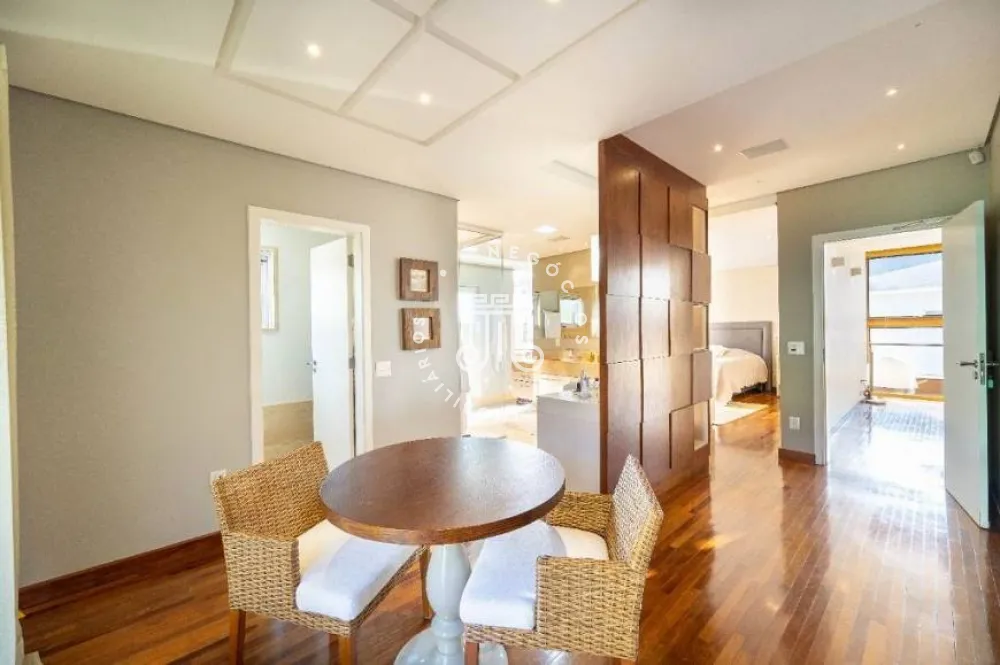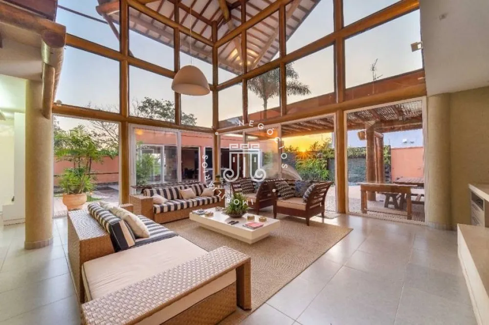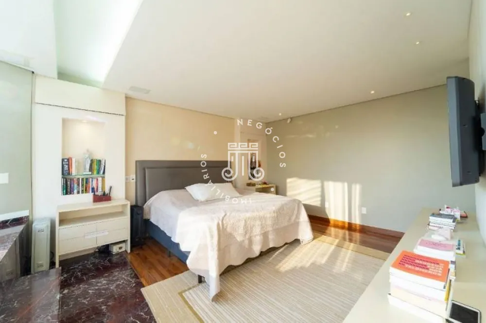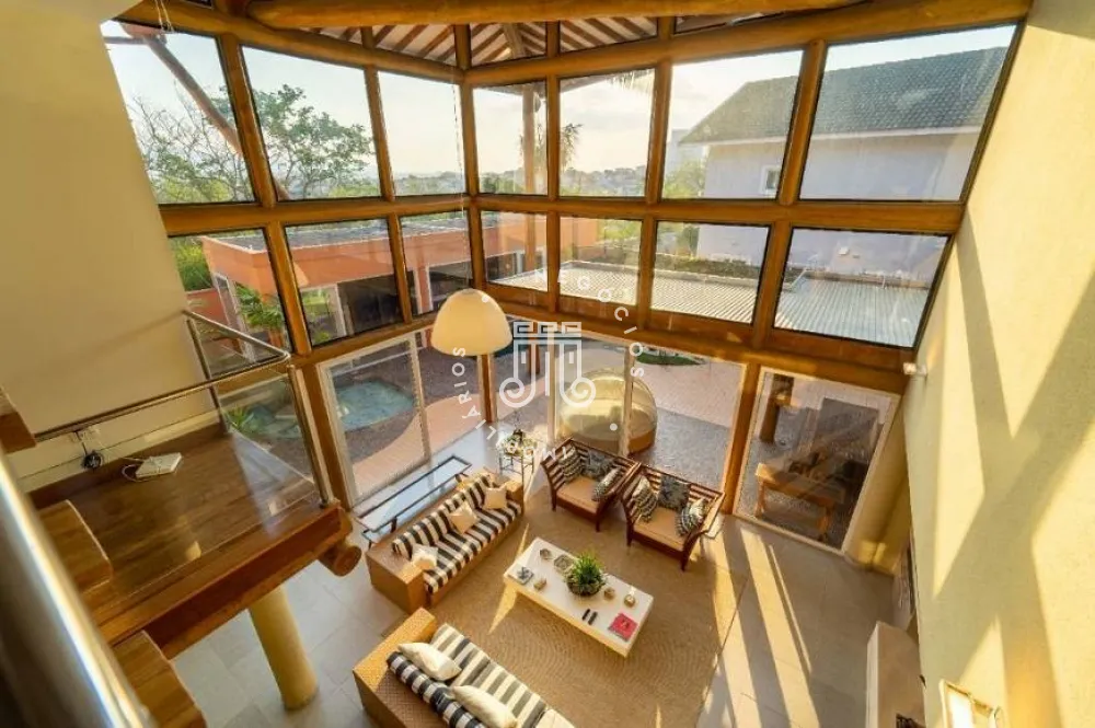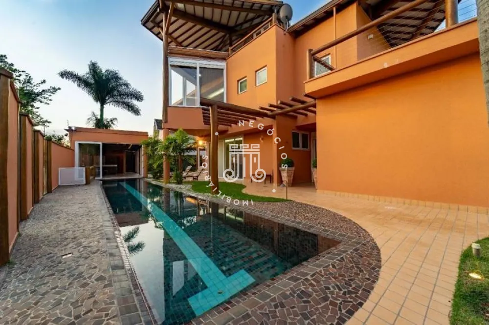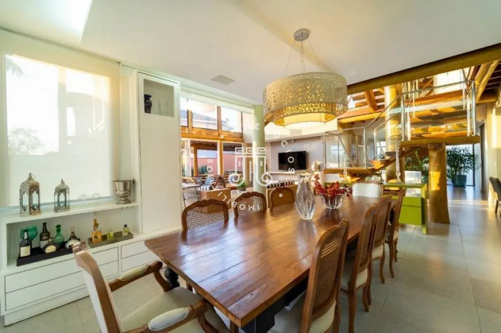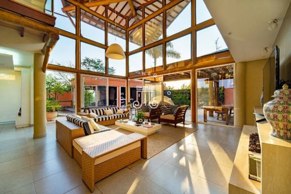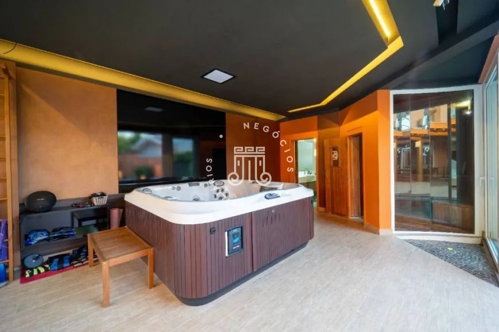 Com 1.018 m² de área total e 865 m² de área construída. No piso superior, possui 3 suítes, sendo 1 suíte master com closet, sala de estar, penteadeira e hidro com vista para a mata e pôr do sol. No piso térreo, conta com 1 suíte, sala íntima de cinema, home office, lavabo, amplo living com sala de TV, sala de jantar, home bar e cozinha americana planejada, todos em conceito aberto integrando os ambientes, além de área de serviço. A área externa oferece quintal amplo com área gourmet, sala de ginástica, sauna seca com banheiro e 2 piscinas, sendo 1 com raia de 15 m e outra com hidromassagem, cascatas e iluminação controlada por automação.