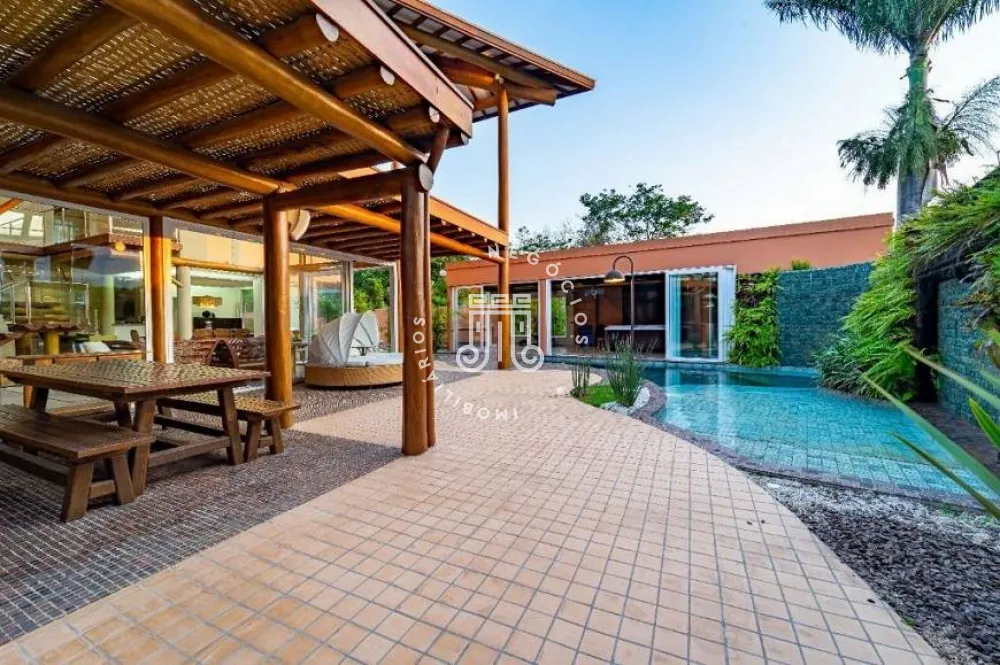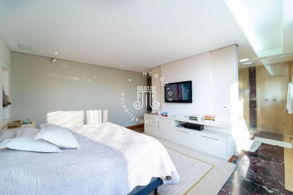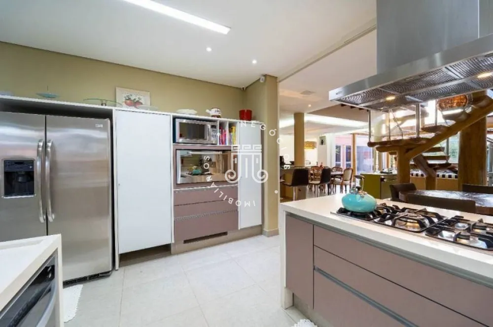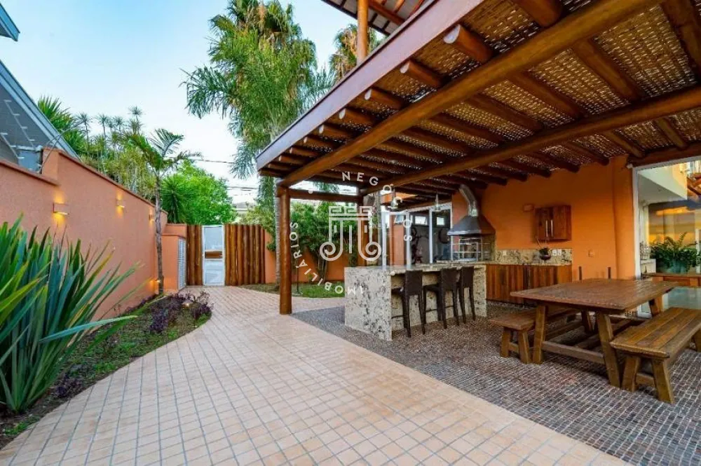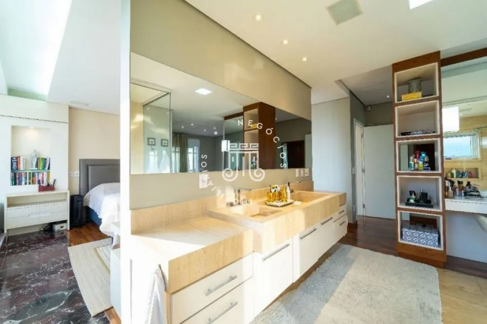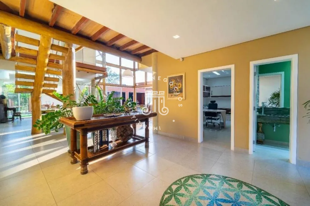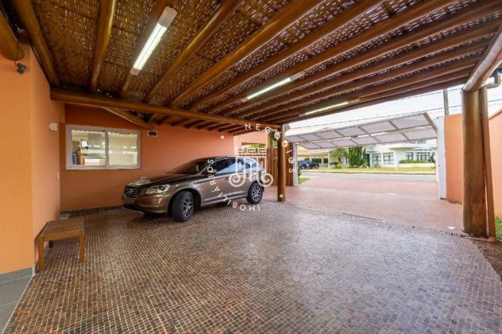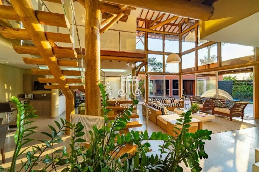 Com 1.018 m² de área total e 865 m² de área construída. No piso superior, possui 3 suítes, sendo 1 suíte master com closet, sala de estar, penteadeira e hidro com vista para a mata e pôr do sol. No piso térreo, conta com 1 suíte, sala íntima de cinema, home office, lavabo, amplo living com sala de TV, sala de jantar, home bar e cozinha americana planejada, todos em conceito aberto integrando os ambientes, além de área de serviço. A área externa oferece quintal amplo com área gourmet, sala de ginástica, sauna seca com banheiro e 2 piscinas, sendo 1 com raia de 15 m e outra com hidromassagem, cascatas e iluminação controlada por automação.
