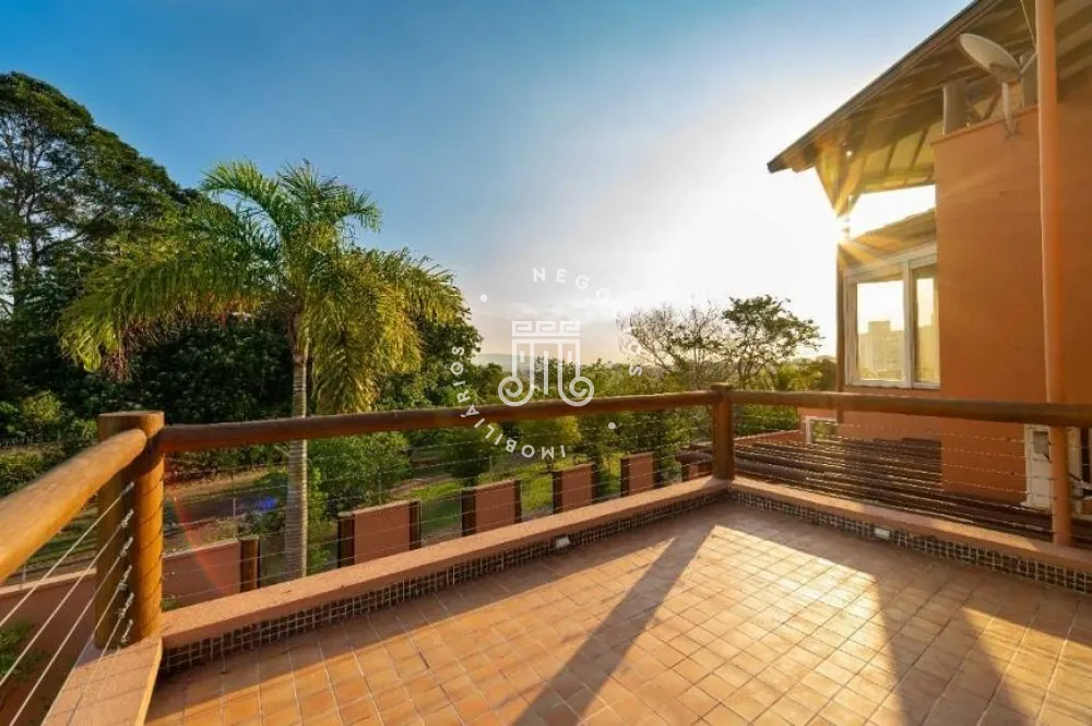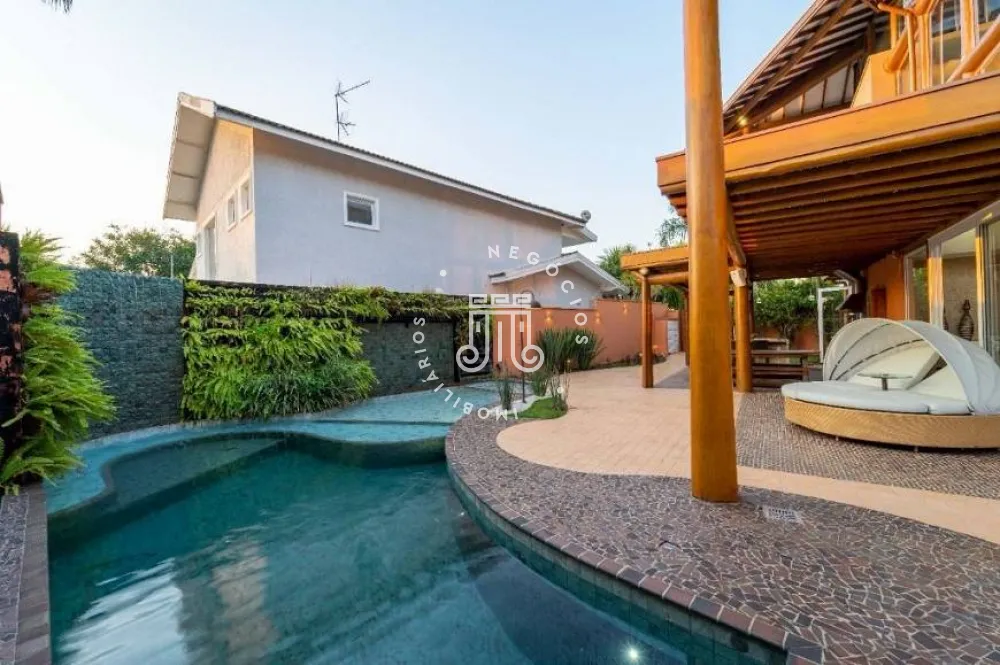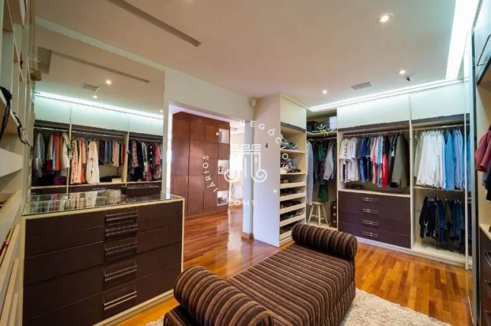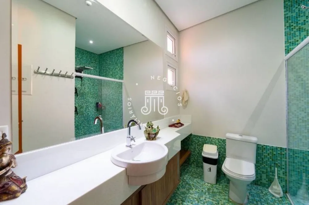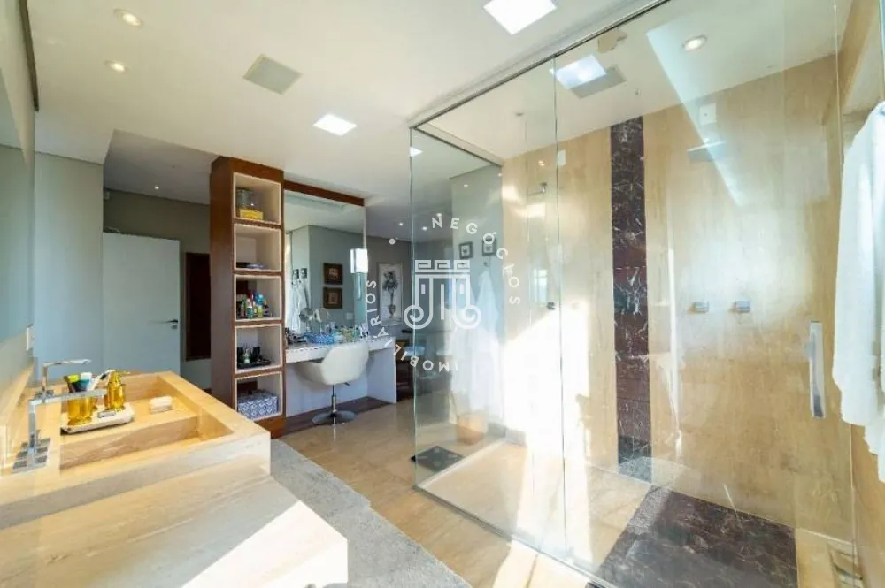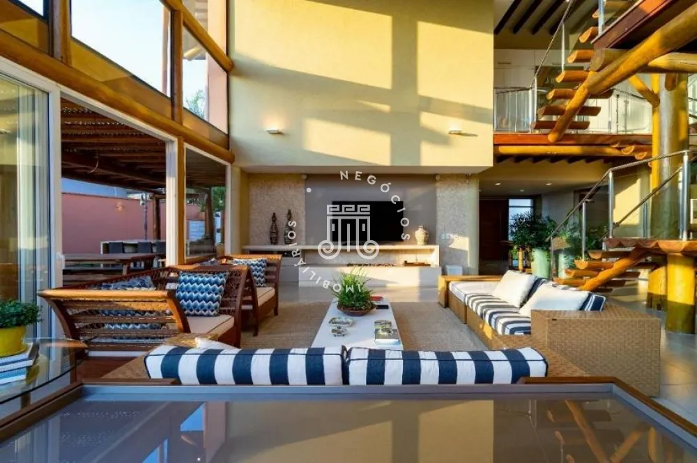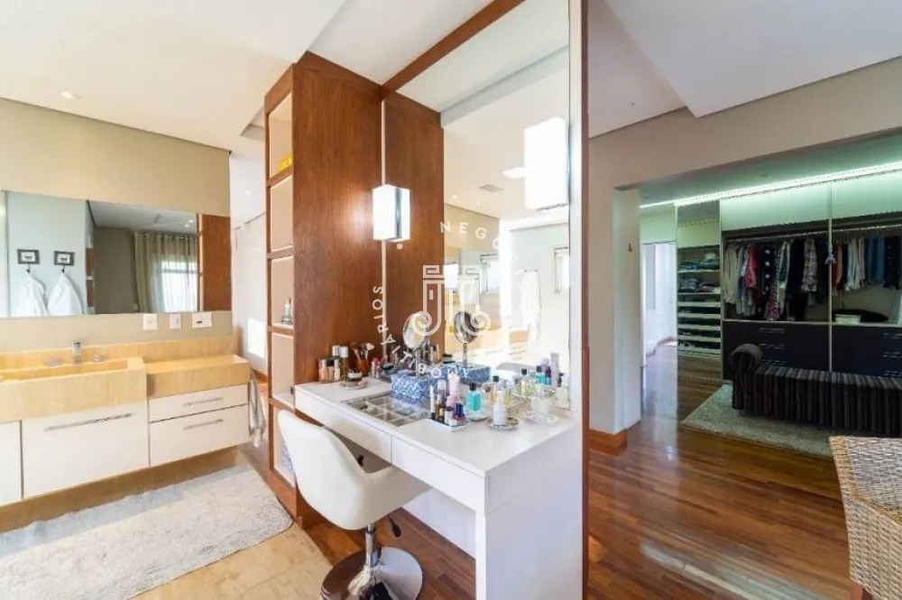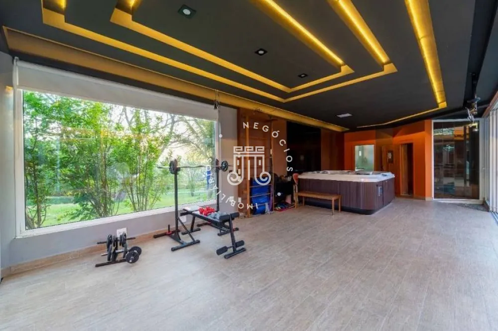 Com 1.018 m² de área total e 865 m² de área construída. No piso superior, possui 3 suítes, sendo 1 suíte master com closet, sala de estar, penteadeira e hidro com vista para a mata e pôr do sol. No piso térreo, conta com 1 suíte, sala íntima de cinema, home office, lavabo, amplo living com sala de TV, sala de jantar, home bar e cozinha americana planejada, todos em conceito aberto integrando os ambientes, além de área de serviço. A área externa oferece quintal amplo com área gourmet, sala de ginástica, sauna seca com banheiro e 2 piscinas, sendo 1 com raia de 15 m e outra com hidromassagem, cascatas e iluminação controlada por automação.