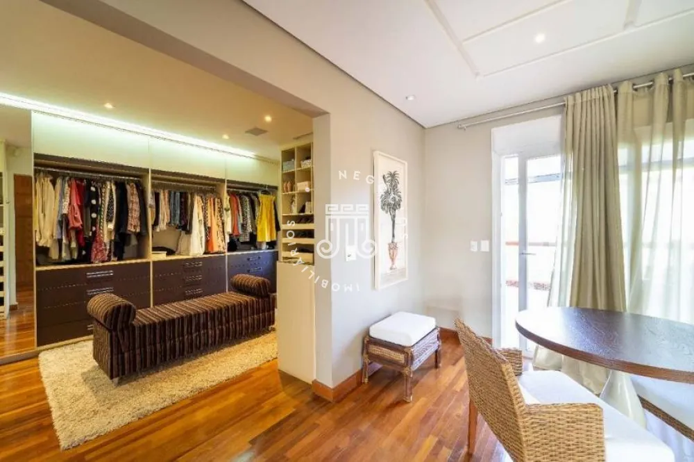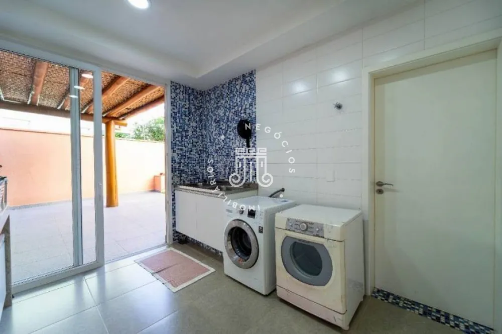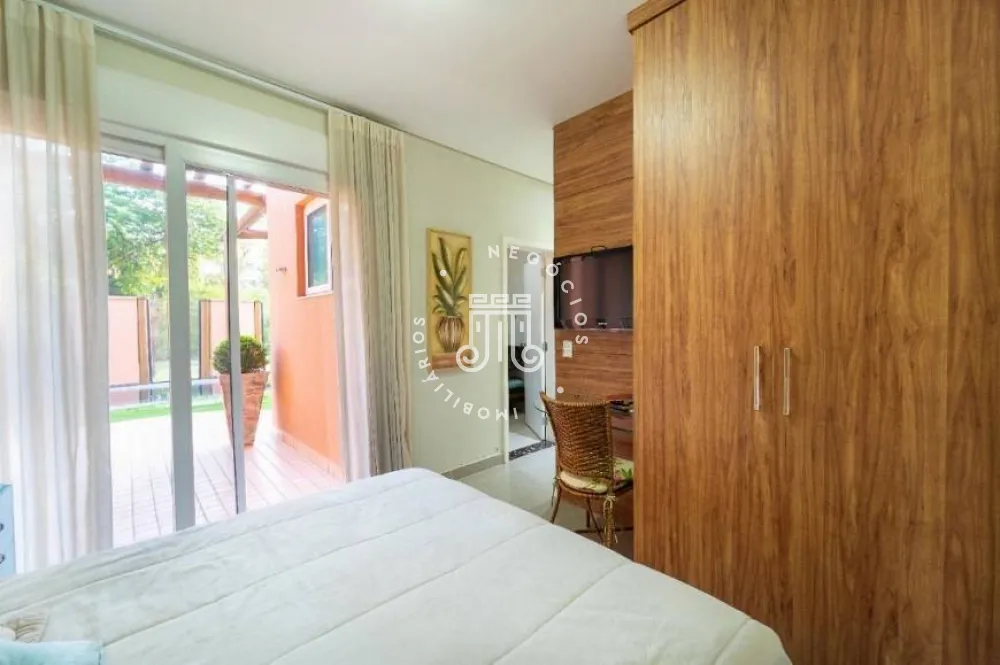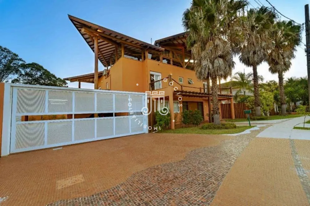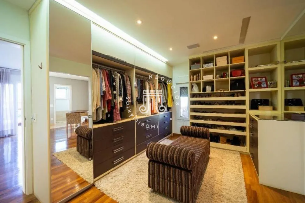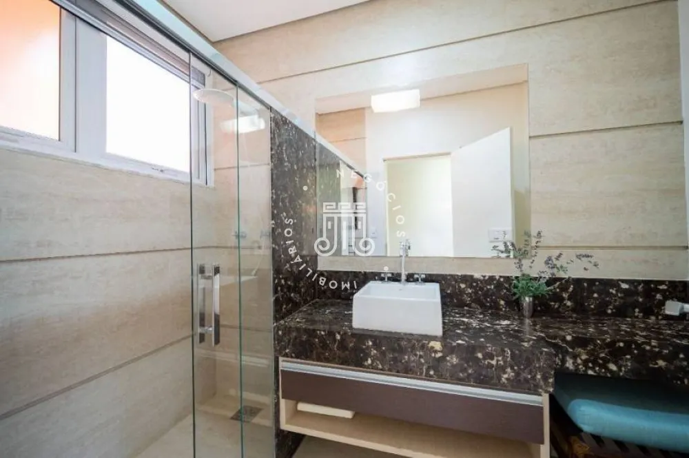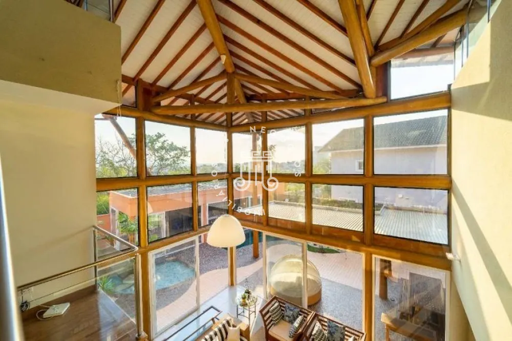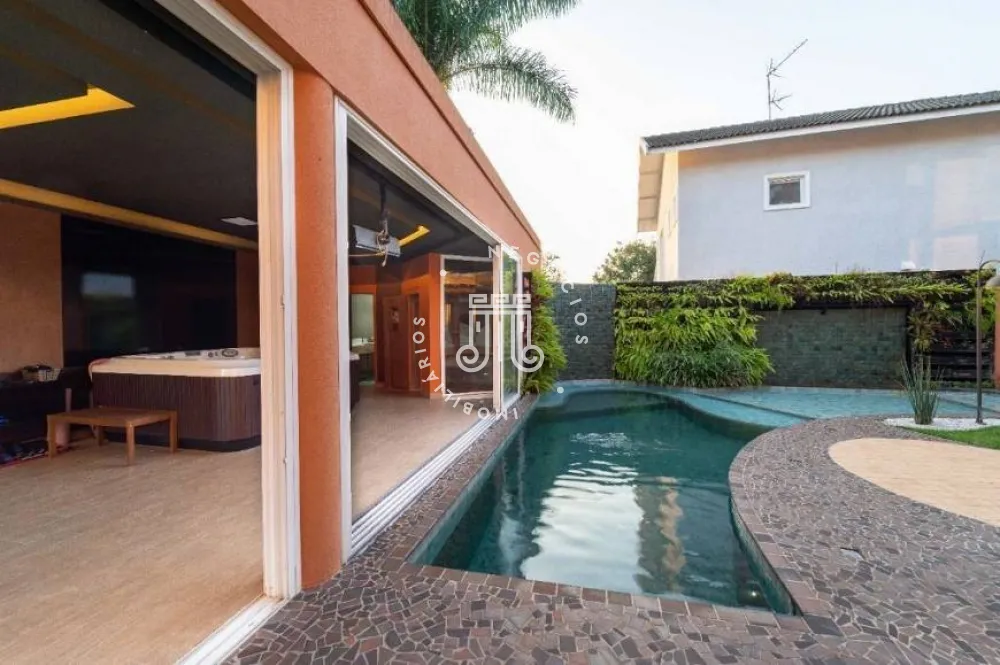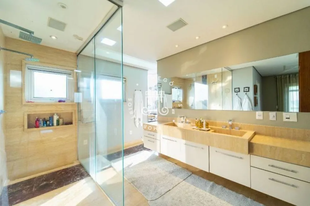 Com 1.018 m² de área total e 865 m² de área construída. No piso superior, possui 3 suítes, sendo 1 suíte master com closet, sala de estar, penteadeira e hidro com vista para a mata e pôr do sol. No piso térreo, conta com 1 suíte, sala íntima de cinema, home office, lavabo, amplo living com sala de TV, sala de jantar, home bar e cozinha americana planejada, todos em conceito aberto integrando os ambientes, além de área de serviço. A área externa oferece quintal amplo com área gourmet, sala de ginástica, sauna seca com banheiro e 2 piscinas, sendo 1 com raia de 15 m e outra com hidromassagem, cascatas e iluminação controlada por automação.