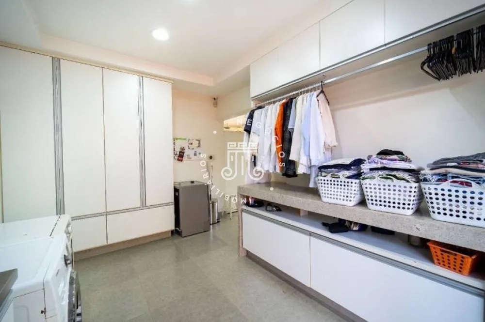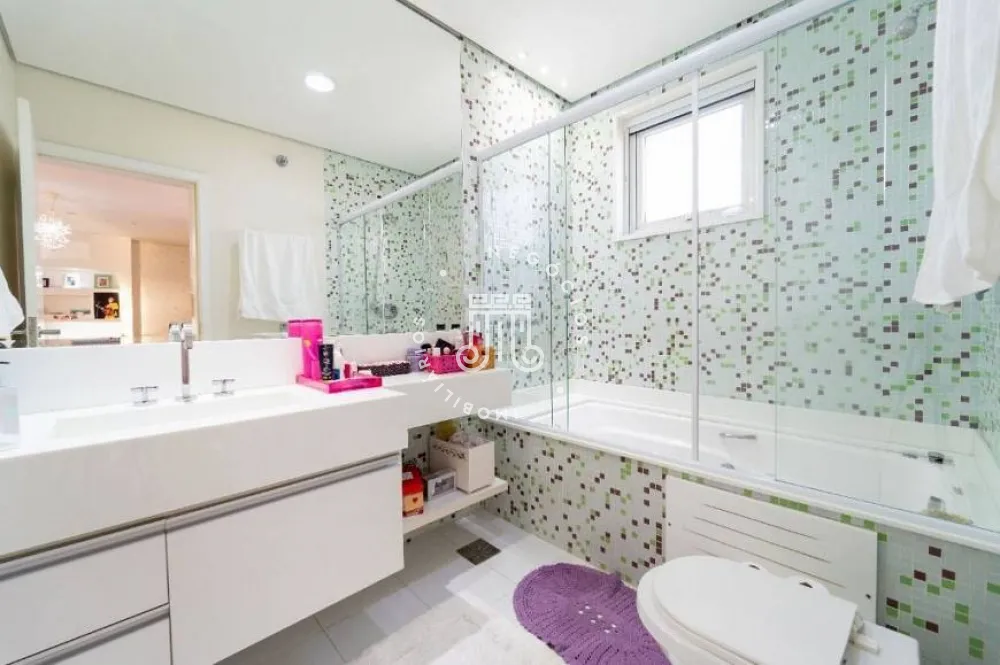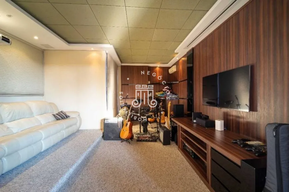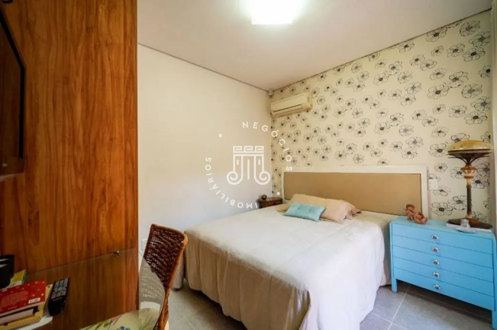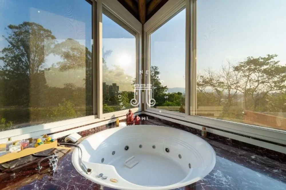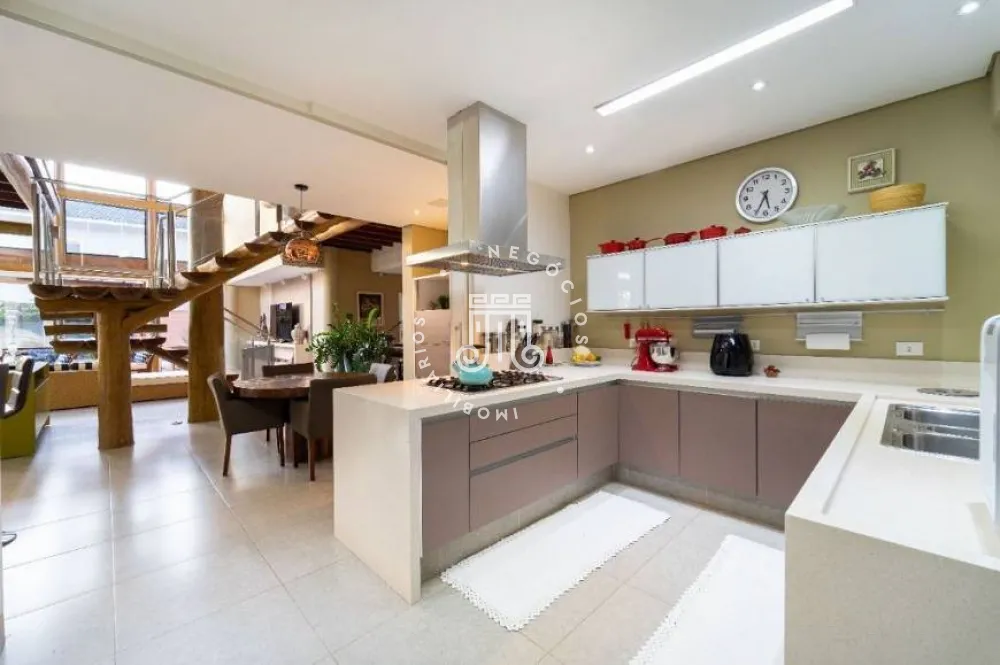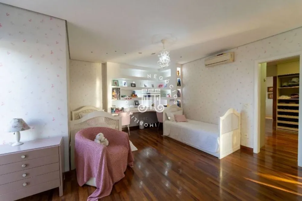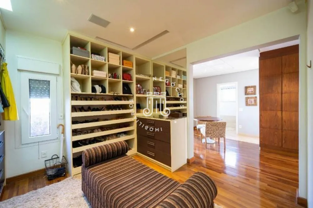 Com 1.018 m² de área total e 865 m² de área construída. No piso superior, possui 3 suítes, sendo 1 suíte master com closet, sala de estar, penteadeira e hidro com vista para a mata e pôr do sol. No piso térreo, conta com 1 suíte, sala íntima de cinema, home office, lavabo, amplo living com sala de TV, sala de jantar, home bar e cozinha americana planejada, todos em conceito aberto integrando os ambientes, além de área de serviço. A área externa oferece quintal amplo com área gourmet, sala de ginástica, sauna seca com banheiro e 2 piscinas, sendo 1 com raia de 15 m e outra com hidromassagem, cascatas e iluminação controlada por automação.