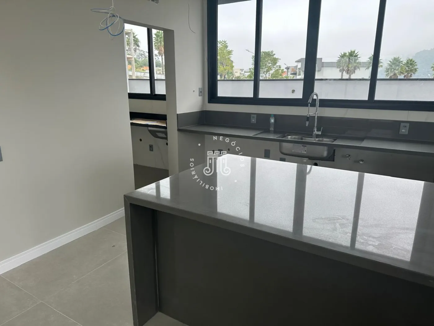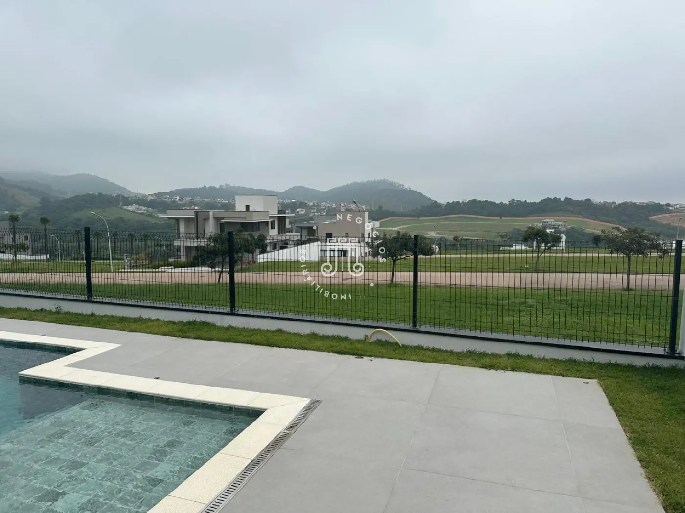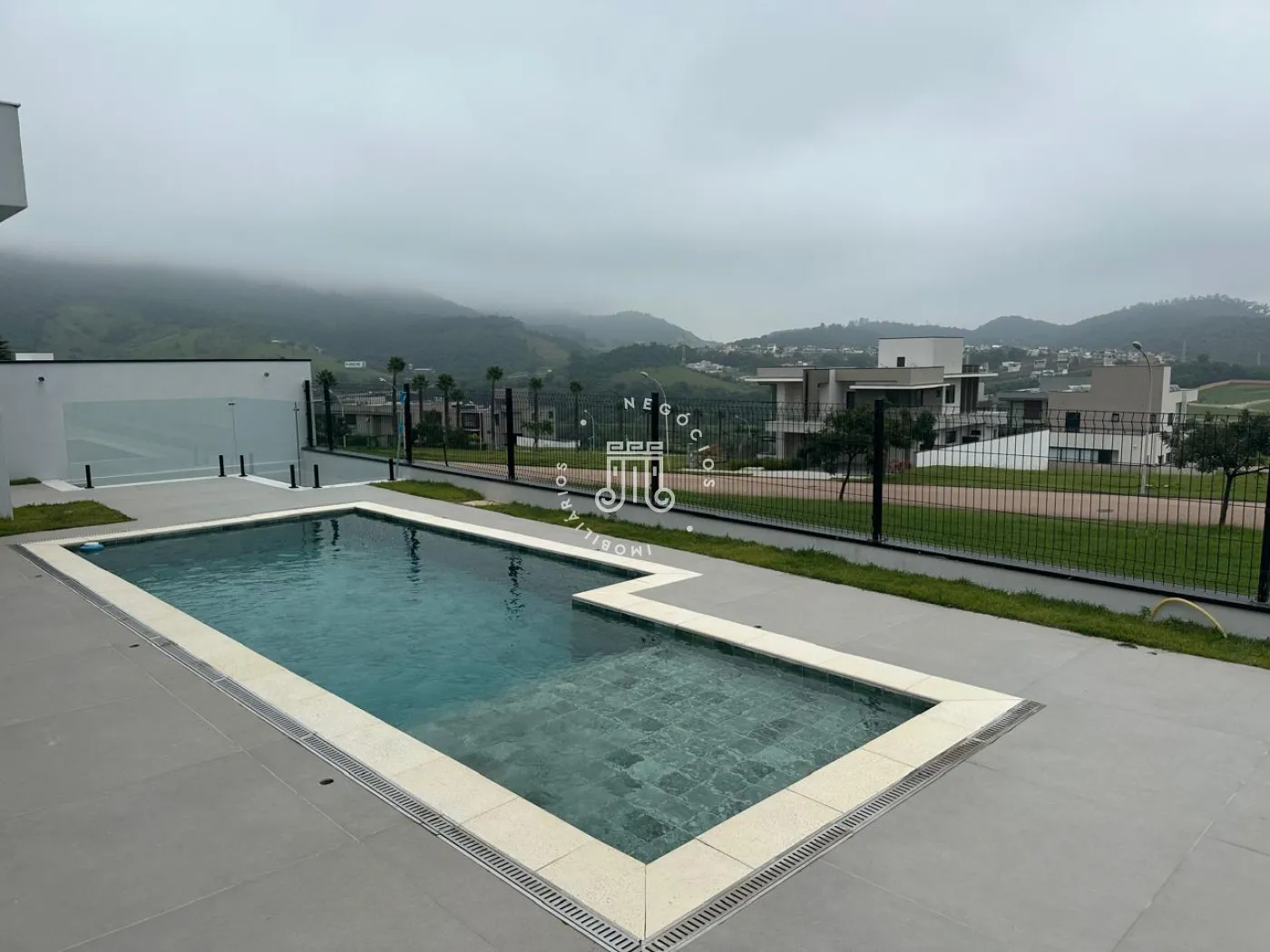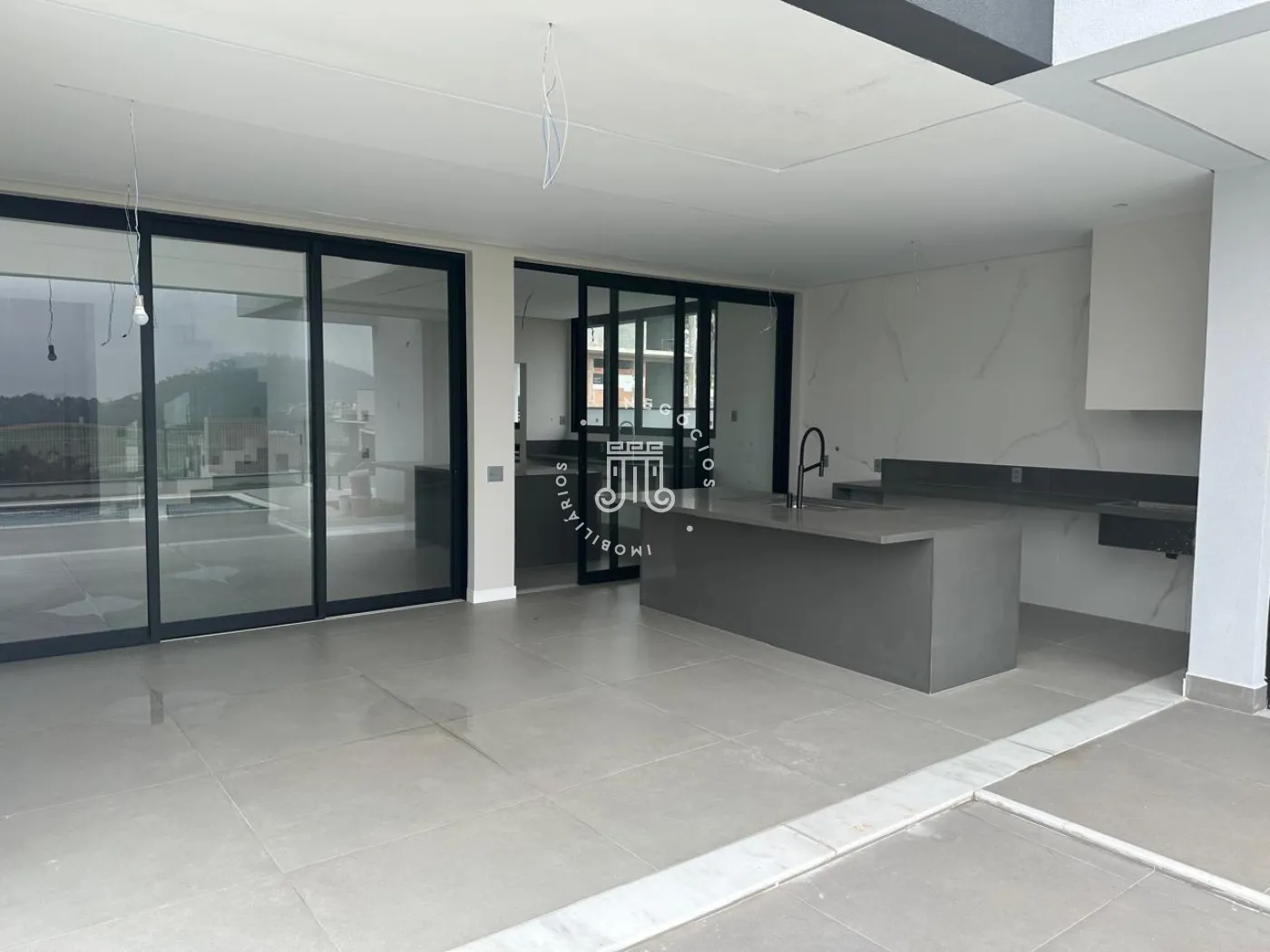 O imóvel possui área útil de 328 metros quadrados. Conta com quatro suítes no pavimento superior e uma suíte no térreo, destinada a escritório. Dispõe de quatro vagas de garagem. A área externa inclui piscina com previsão para sistema de aquecimento por energia fotovoltaica.