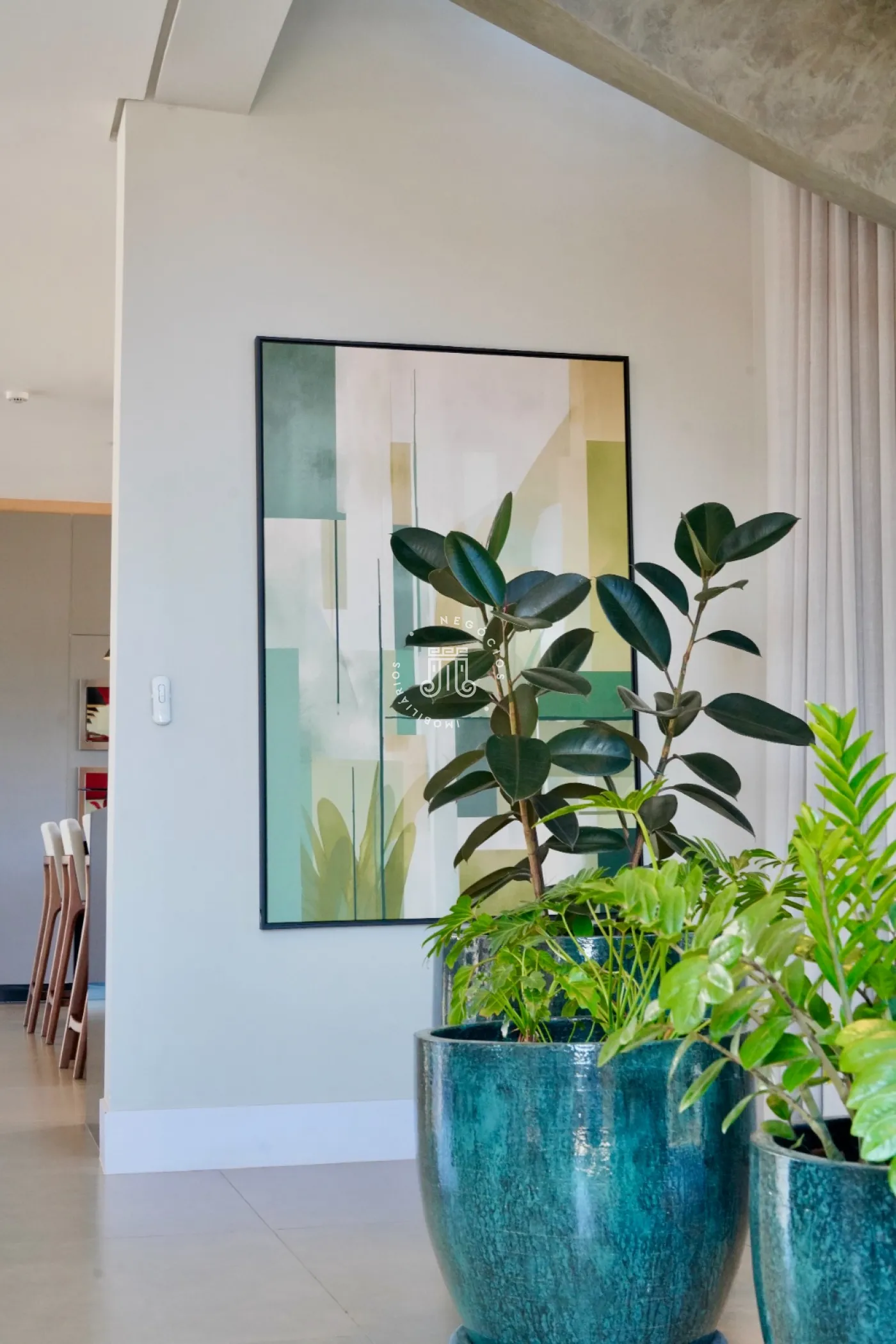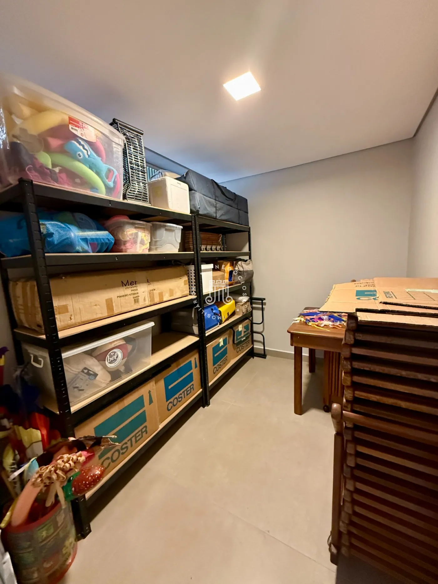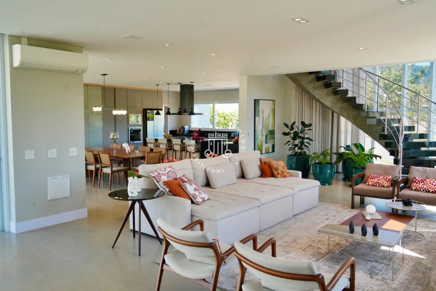 A casa possui automação integrada à Alexa, que controla iluminação, persianas e cortinas elétricas. A infraestrutura de rede é composta por switch central, cabeamento em todos os cômodos e quatro access points, o que garante conectividade em toda a área. Há ainda sistema de som ambiente dividido em cinco zonas independentes, abrangendo os espaços sociais internos e a piscina.