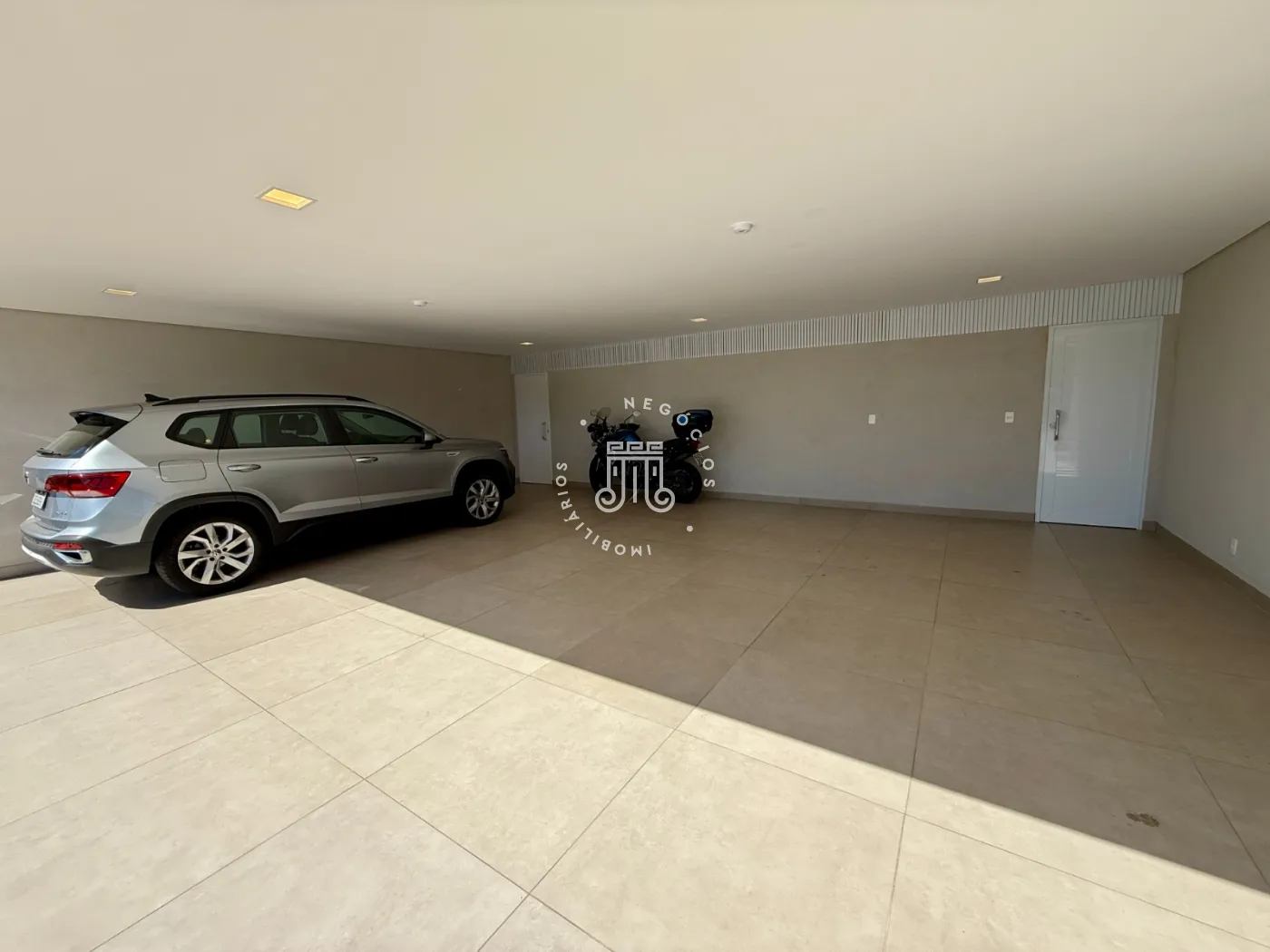 A garagem comporta seis veículos, sendo três vagas cobertas. Há infraestrutura para instalação de dois carregadores de carros elétricos. Uma rampa lateral possibilita o acesso de veículos pela entrada de serviços e cozinha. Dois depósitos privativos complementam a garagem, um com acesso interno e outro externo.