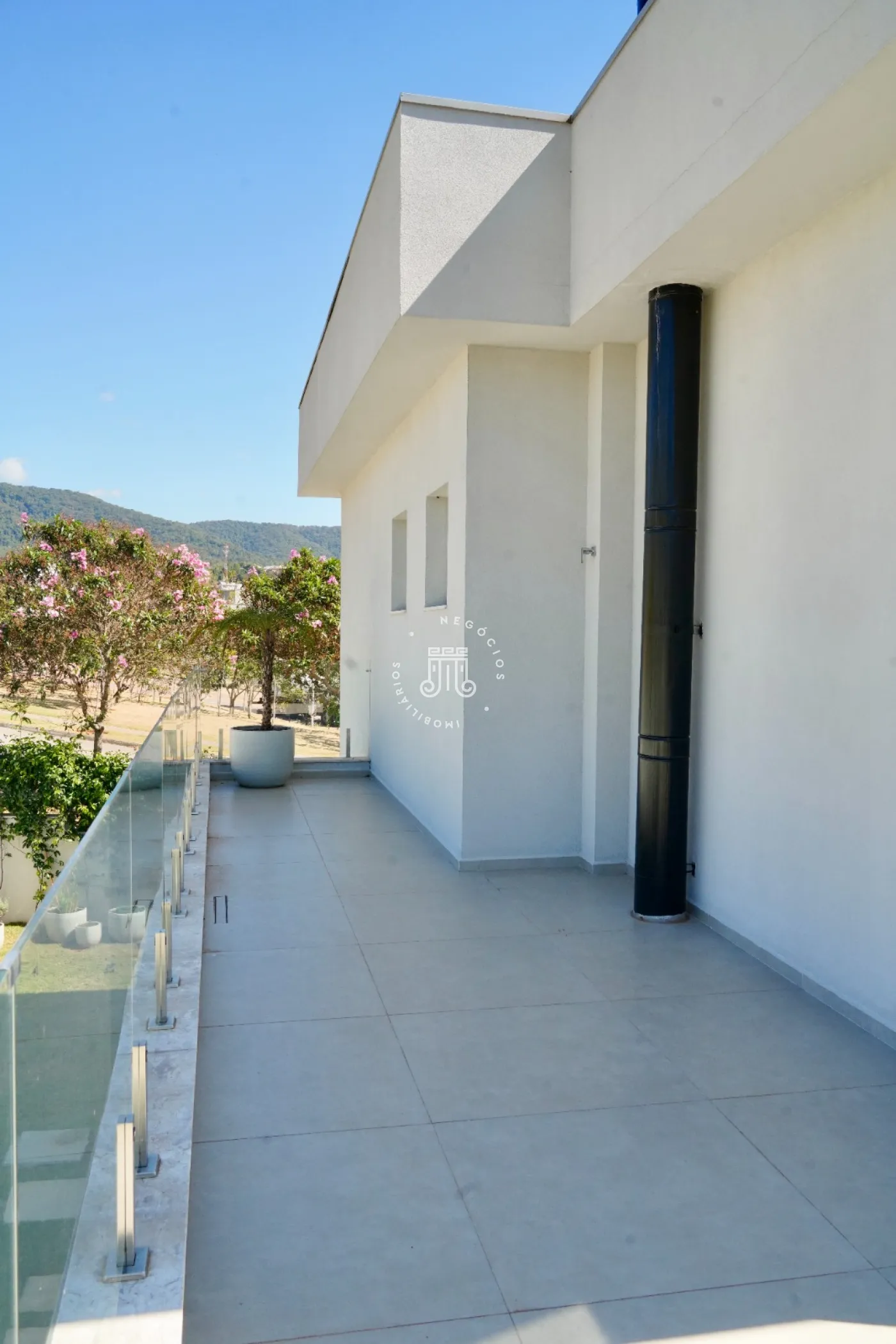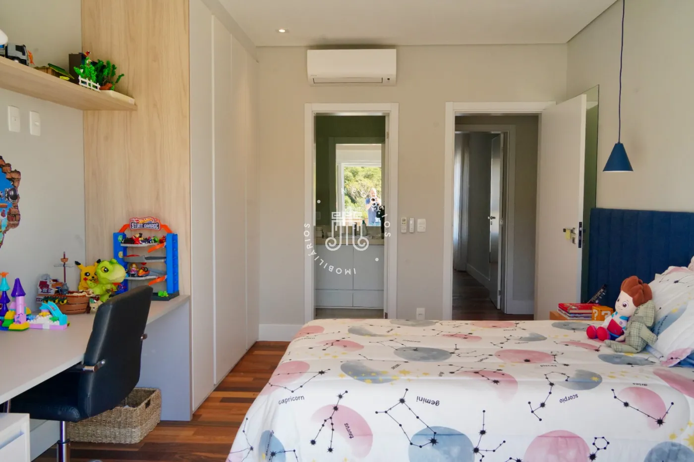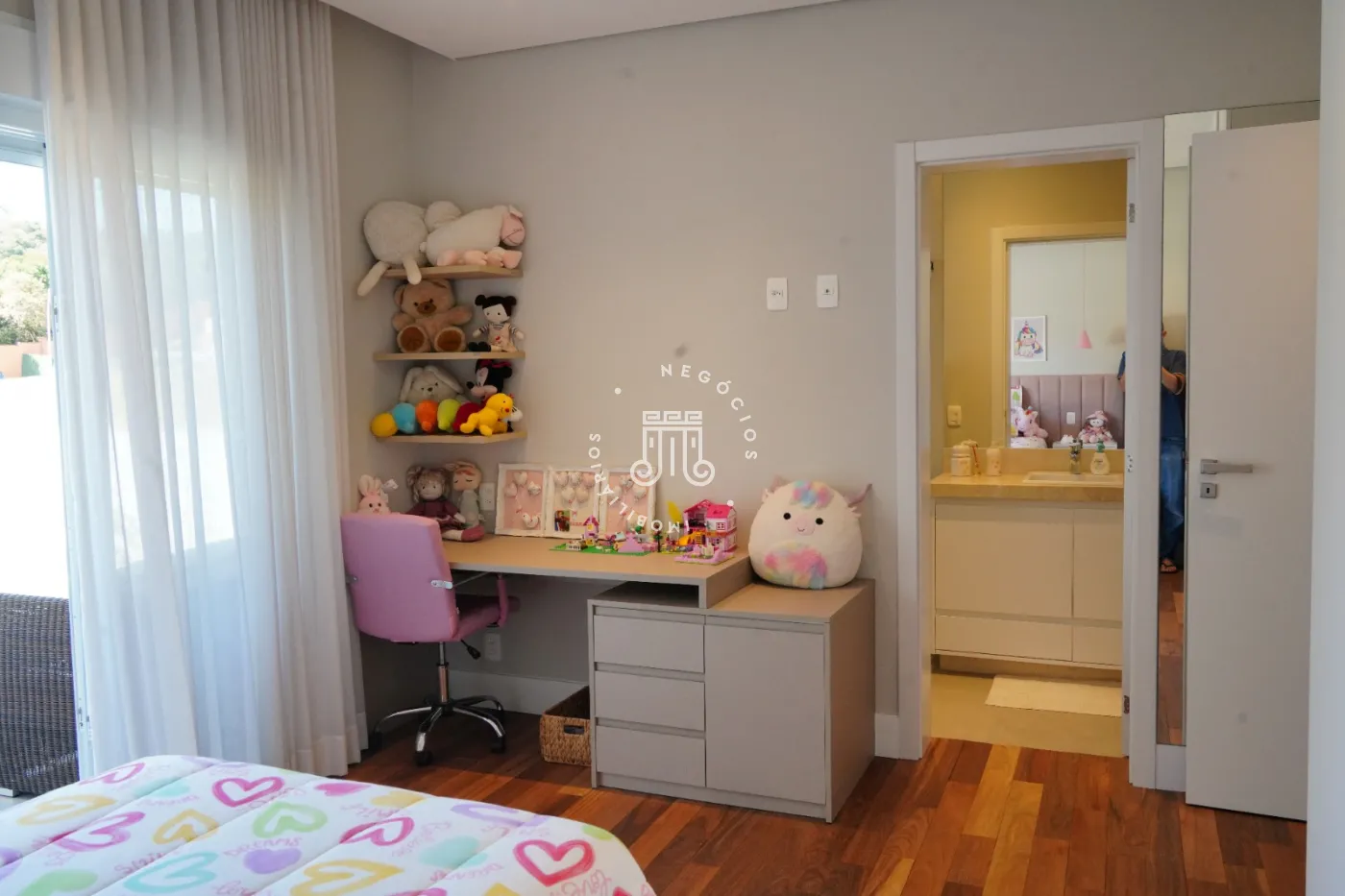 No pavimento superior, há cinco suítes, sendo uma delas a suíte master, equipada com lareira. Uma das suítes foi adaptada para escritório. O andar conta ainda com sala de TV ou home cinema e duas varandas com vista para a serra.