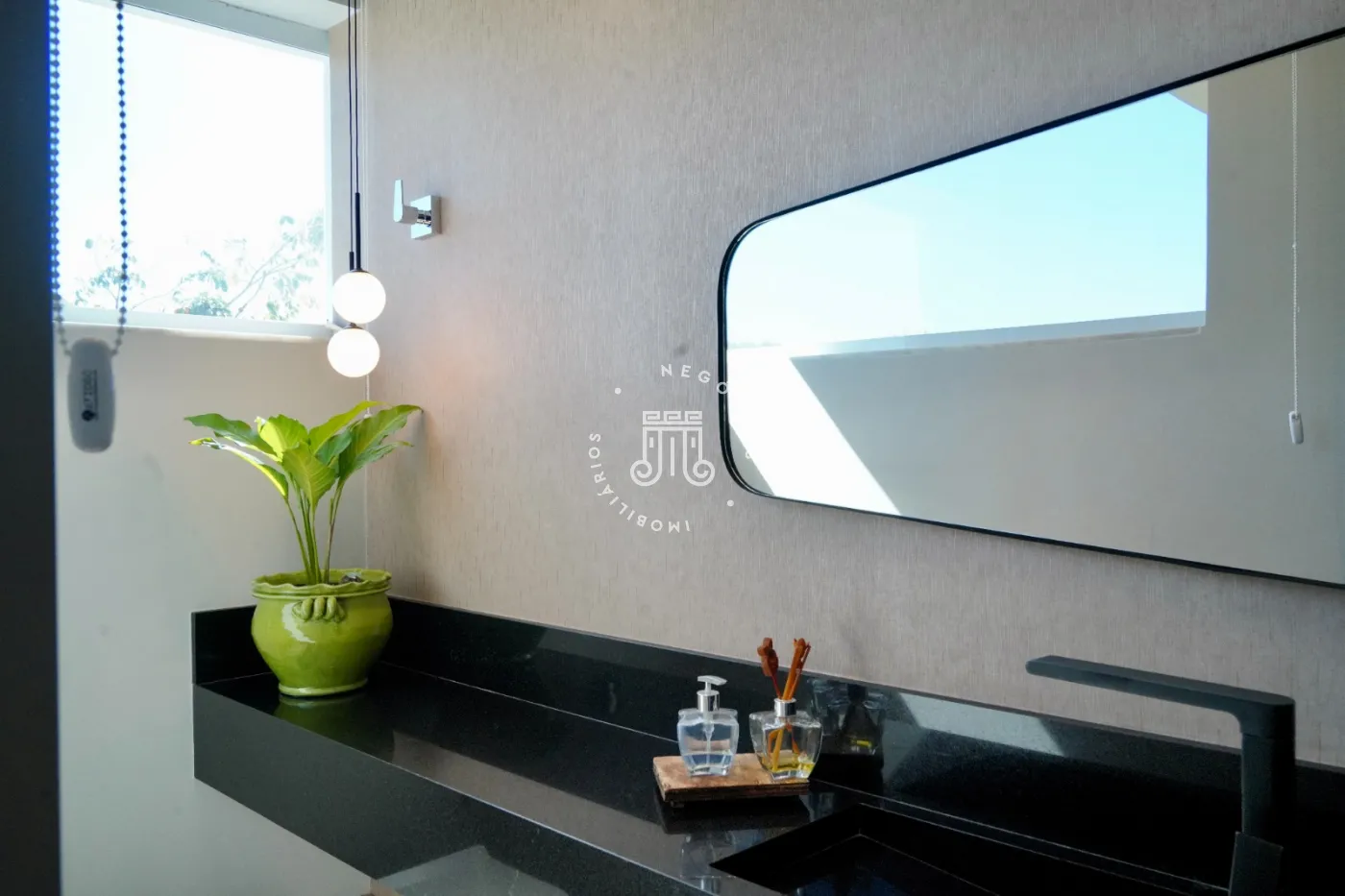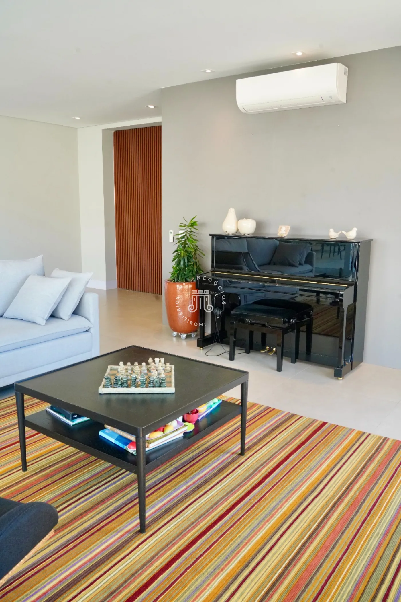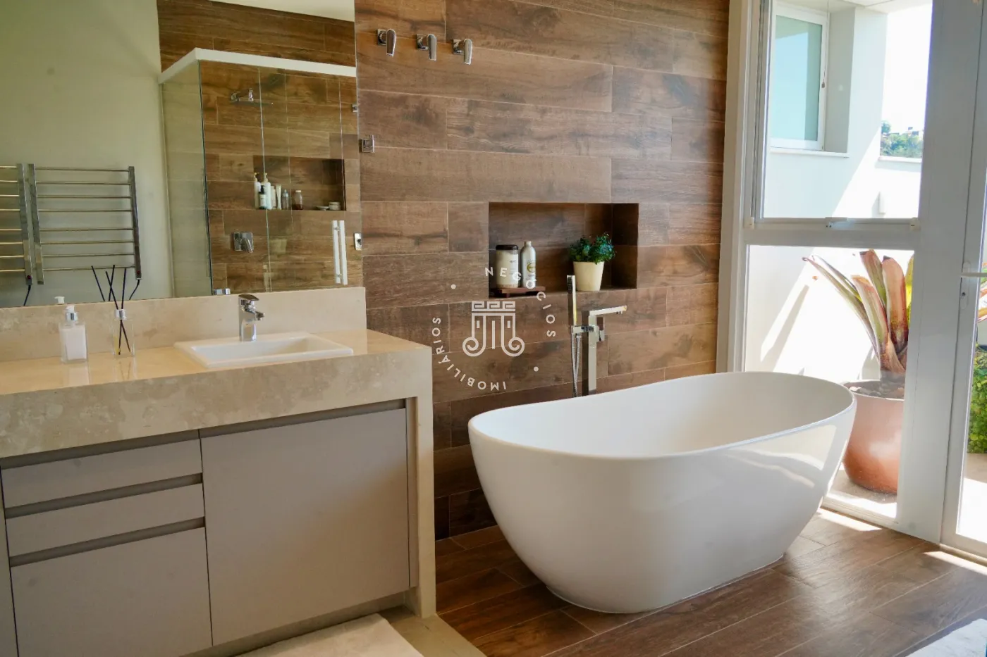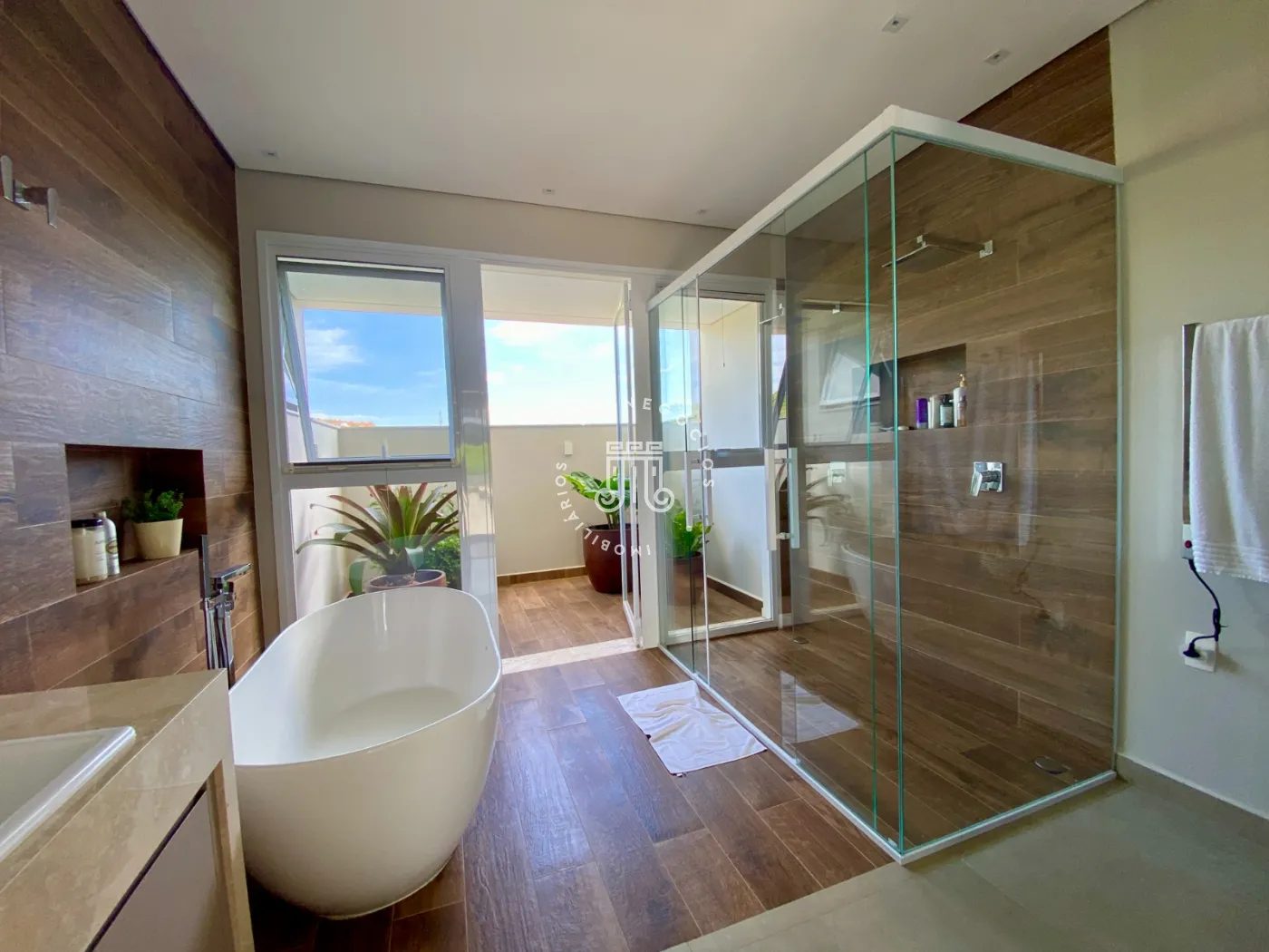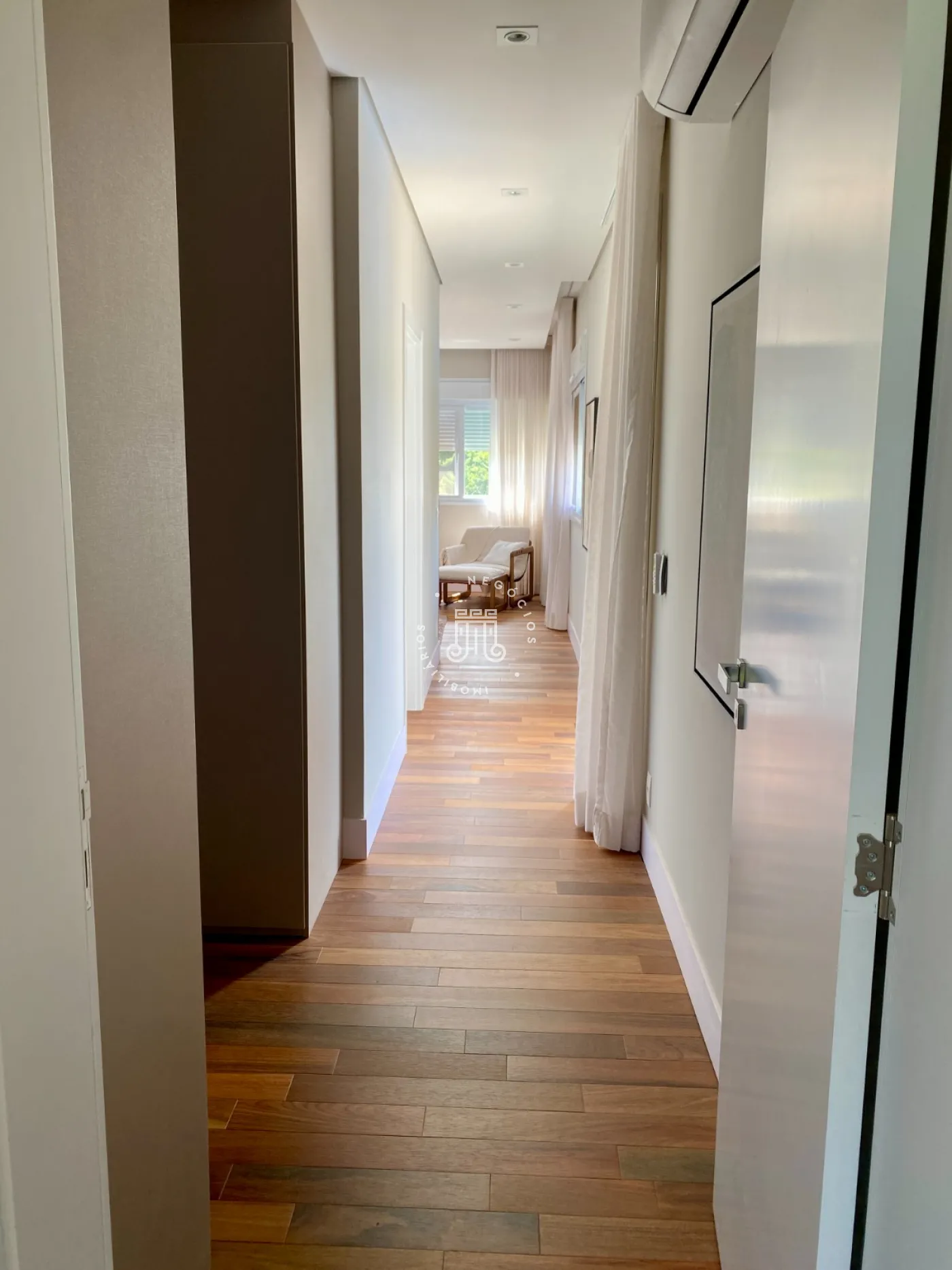 Os acabamentos incluem piso de madeira Cumaru no pavimento superior, porcelanato no térreo e quintal, e piso Fulget nas áreas externas. Todos os ambientes possuem armários planejados. O banheiro da suíte master conta com piso aquecido e os banheiros das demais suítes com toalheiros elétricos. Todos os cômodos possuem ar-condicionado quente e frio, e as esquadrias oferecem isolamento acústico.