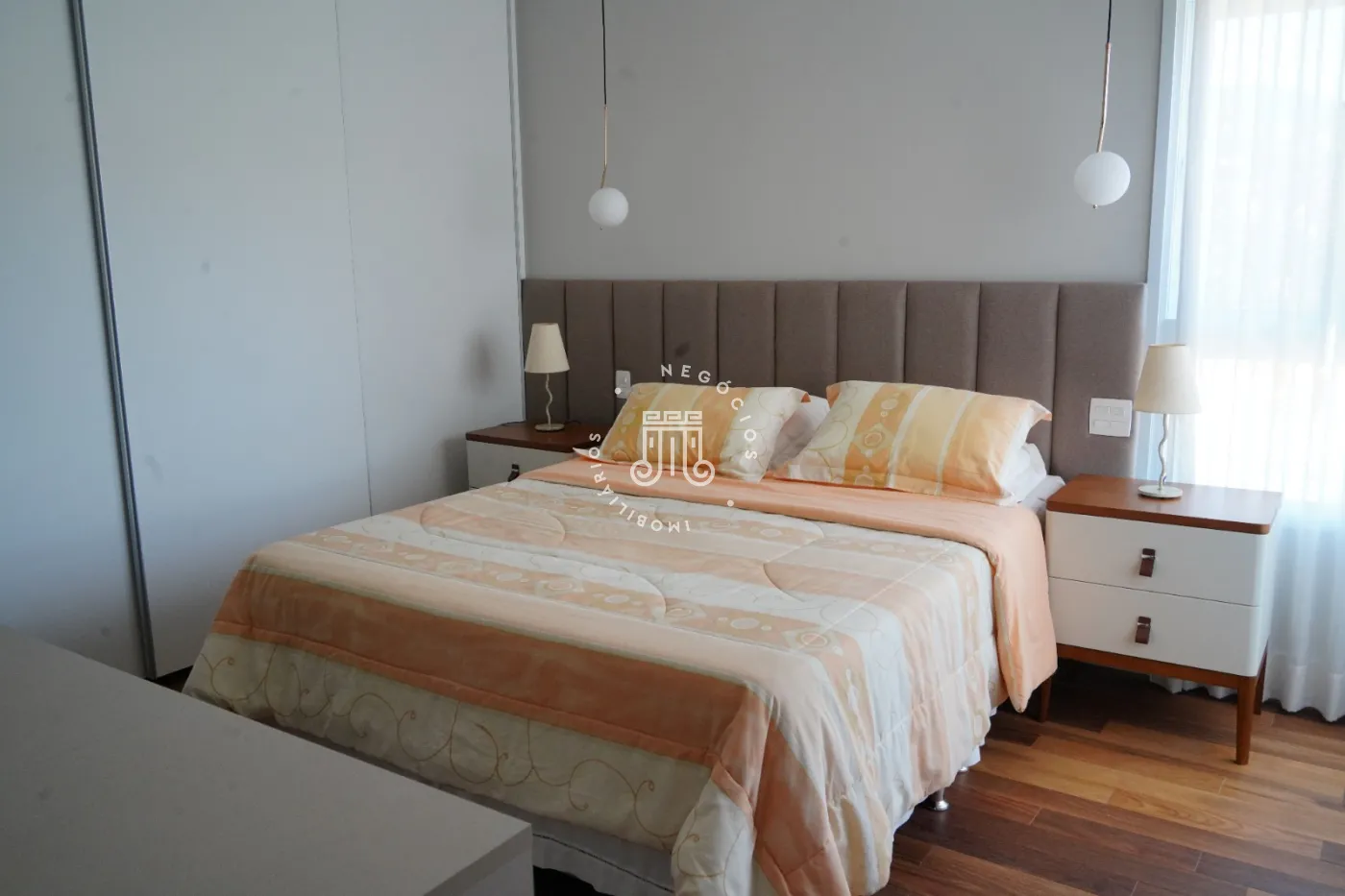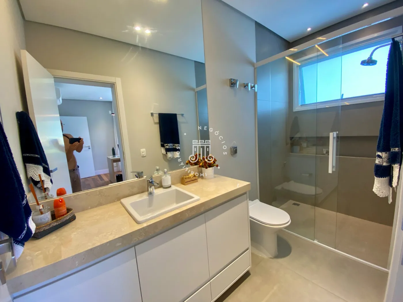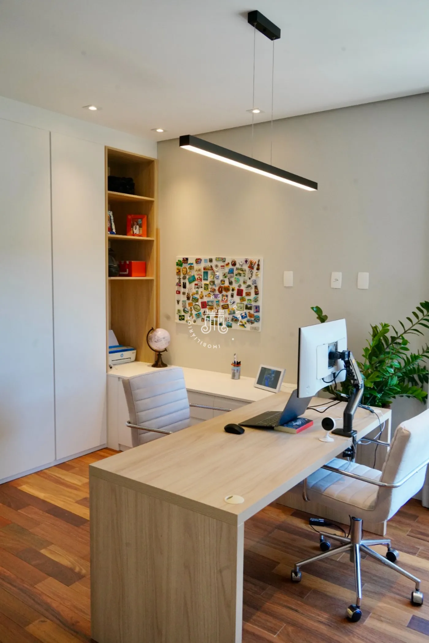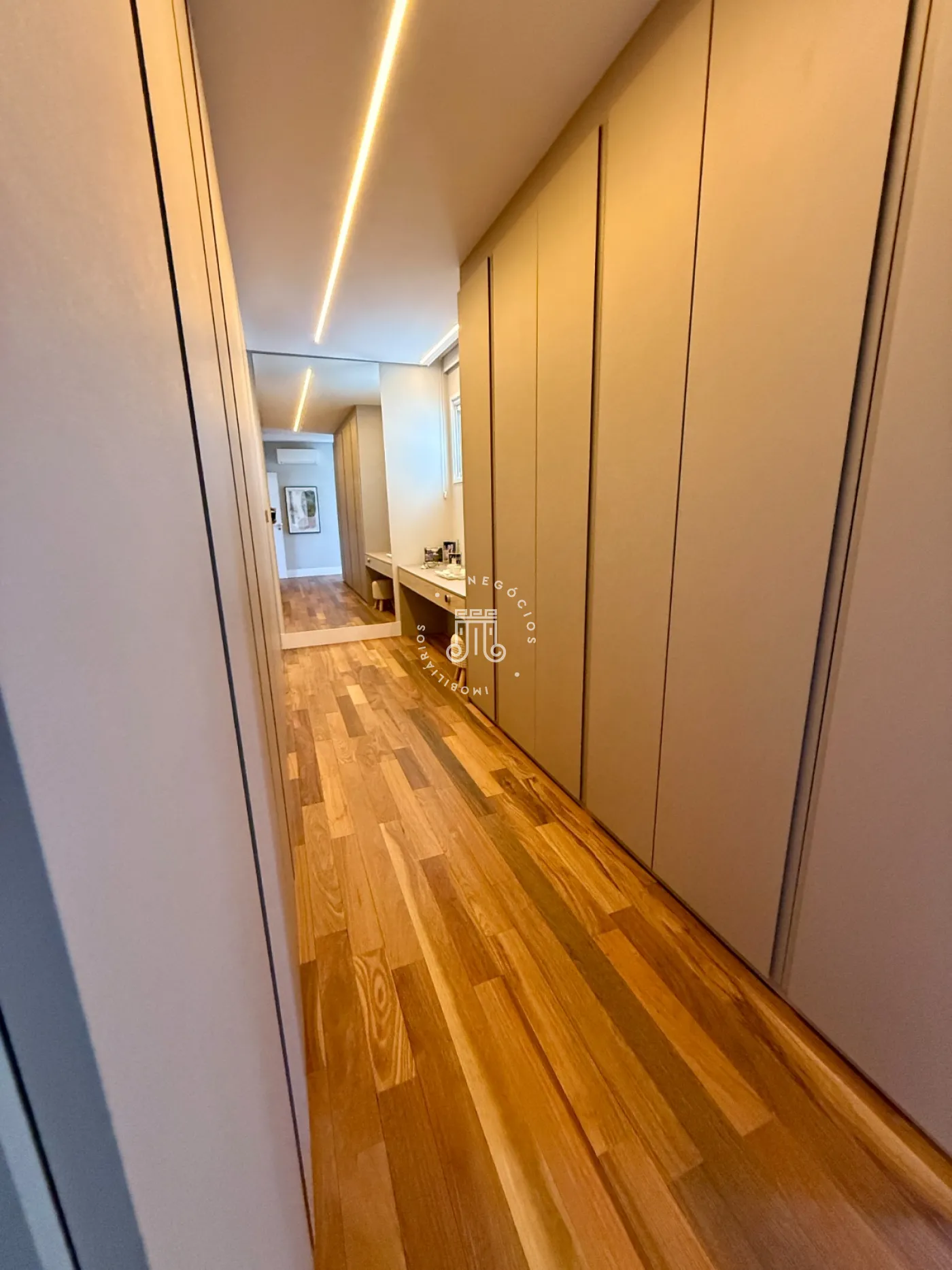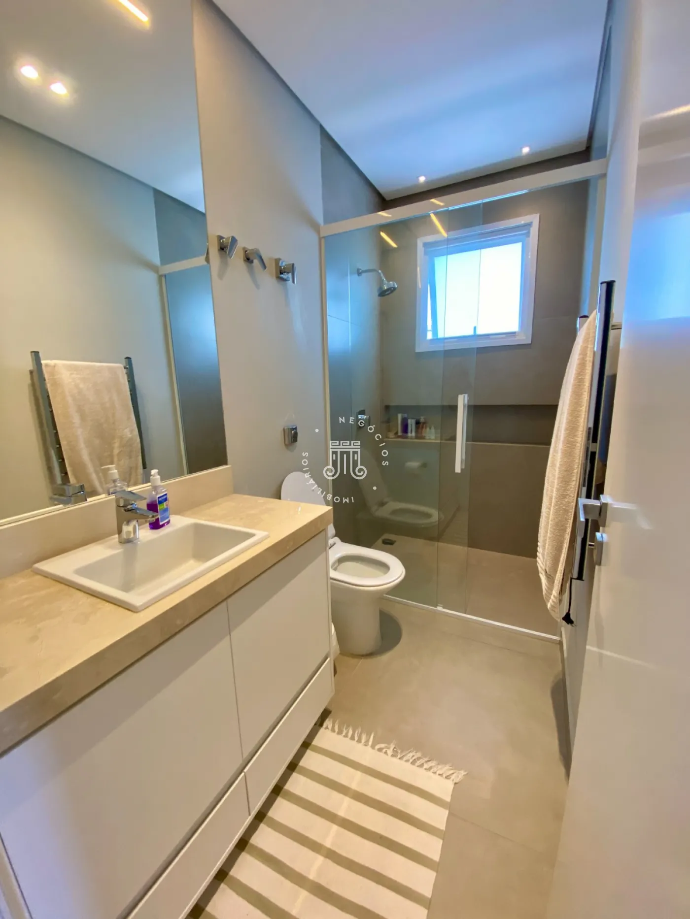 Os acabamentos incluem piso de madeira Cumaru no pavimento superior, porcelanato no térreo e quintal, e piso Fulget nas áreas externas. Todos os ambientes possuem armários planejados. O banheiro da suíte master conta com piso aquecido e os banheiros das demais suítes com toalheiros elétricos. Todos os cômodos possuem ar-condicionado quente e frio, e as esquadrias oferecem isolamento acústico.