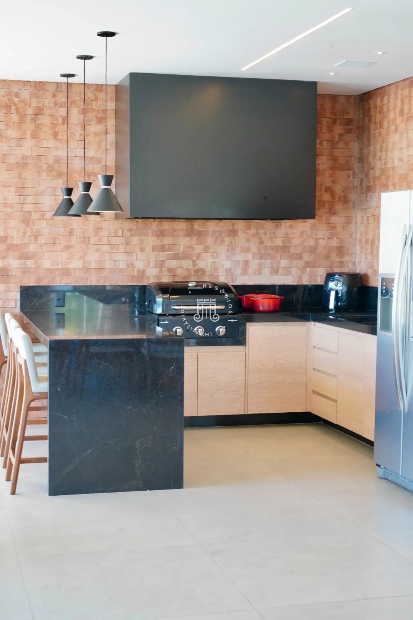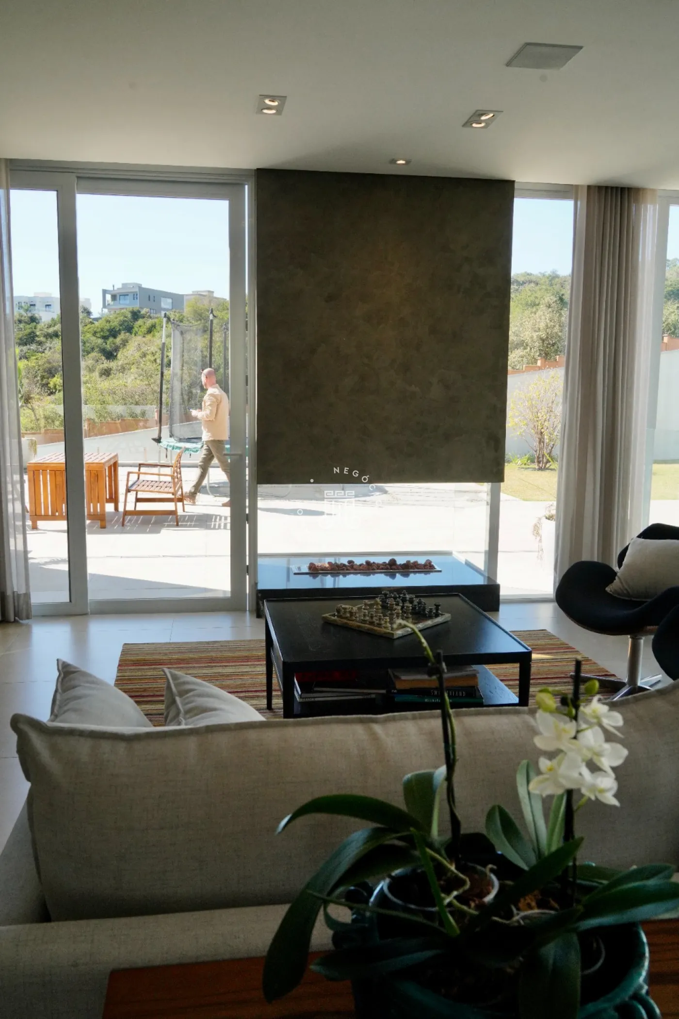 No pavimento térreo, a residência possui duas suítes, uma delas com possibilidade de uso como escritório, brinquedoteca ou acomodação para hóspedes. Há também uma suíte de serviço com entrada independente. O living comporta dois ambientes com lareira e é integrado à cozinha e ao espaço gourmet. A cozinha é conectada aos demais ambientes e equipada com cooktop por indução, recurso também presente no espaço gourmet, que dispõe ainda de churrasqueira a gás. As coifas da cozinha e do gourmet possuem motores externos.