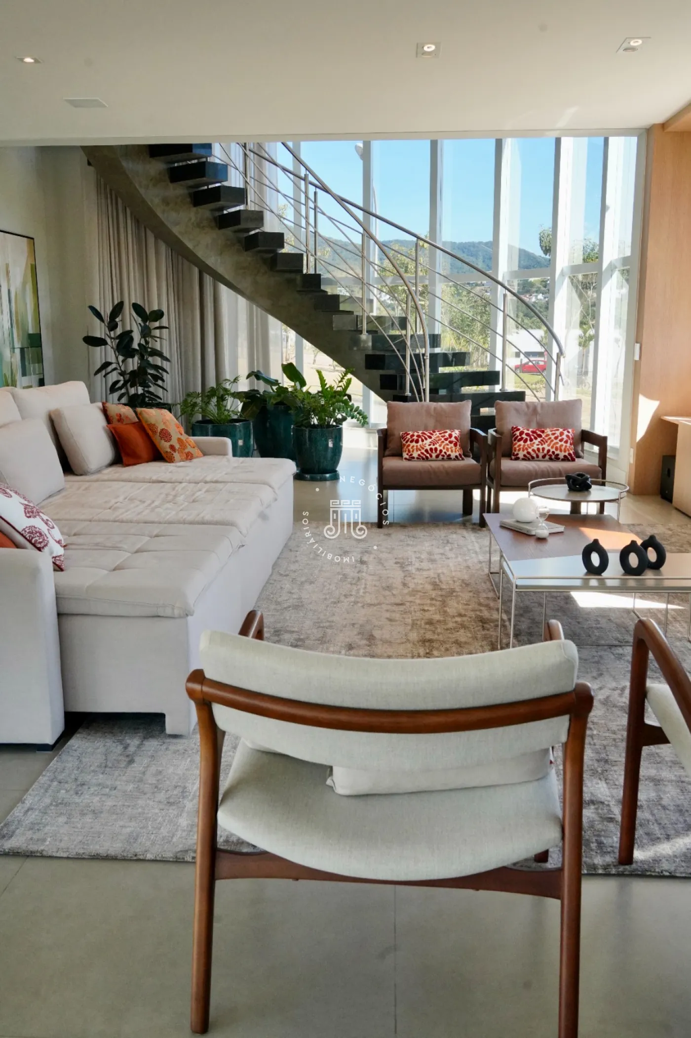 Sobrado com 608 m² de área construída em terreno plano de 1.108 m², localizado em esquina com vista permanente para a Serra do Japi. O projeto é assinado pelo arquiteto Carlos Porfírio e foi desenvolvido para integrar os ambientes do térreo e aproveitar a iluminação natural. A casa está posicionada em frente a uma praça e a uma área de preservação ambiental.