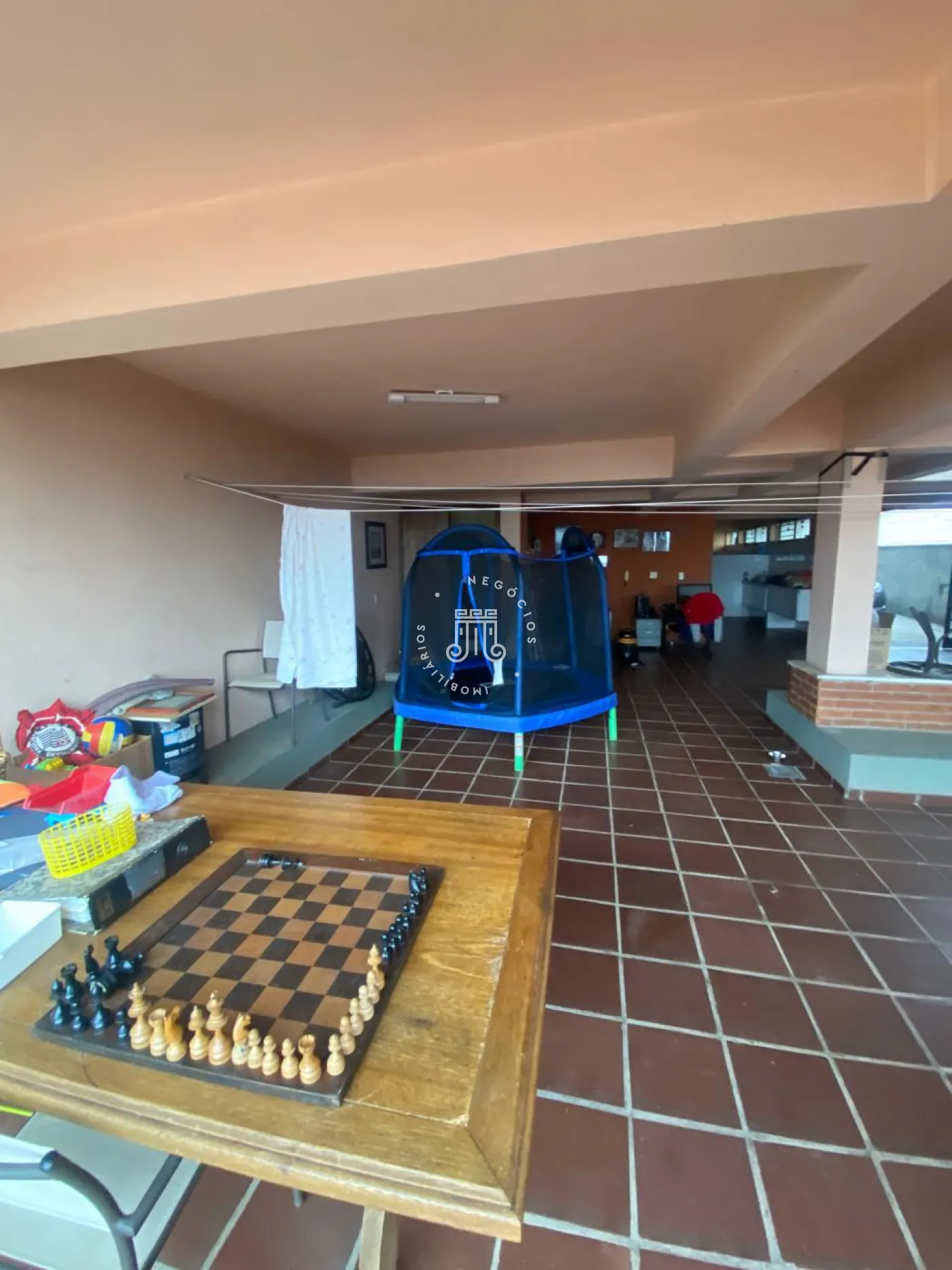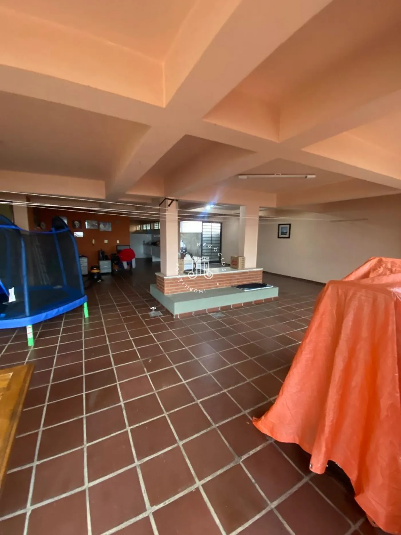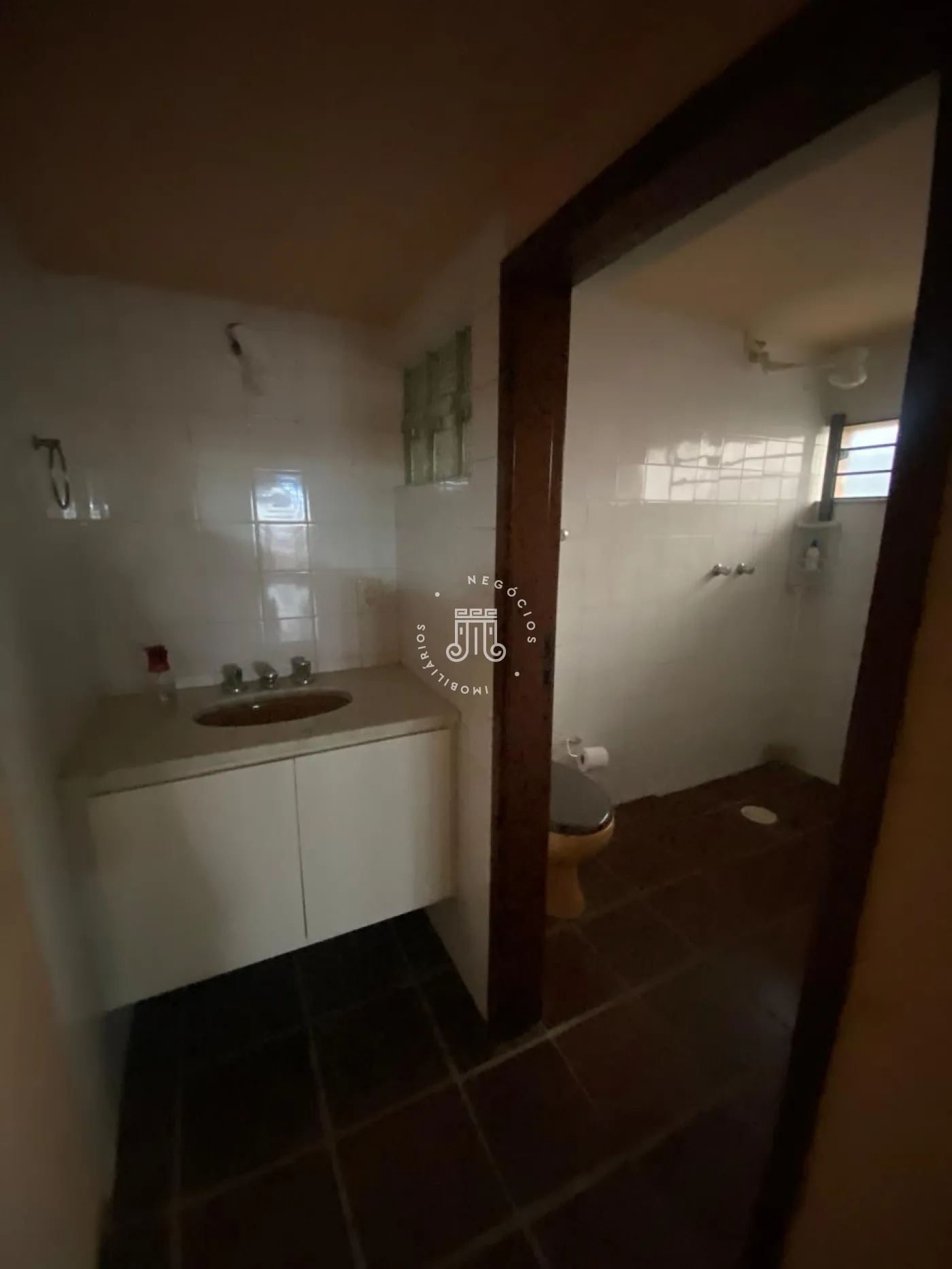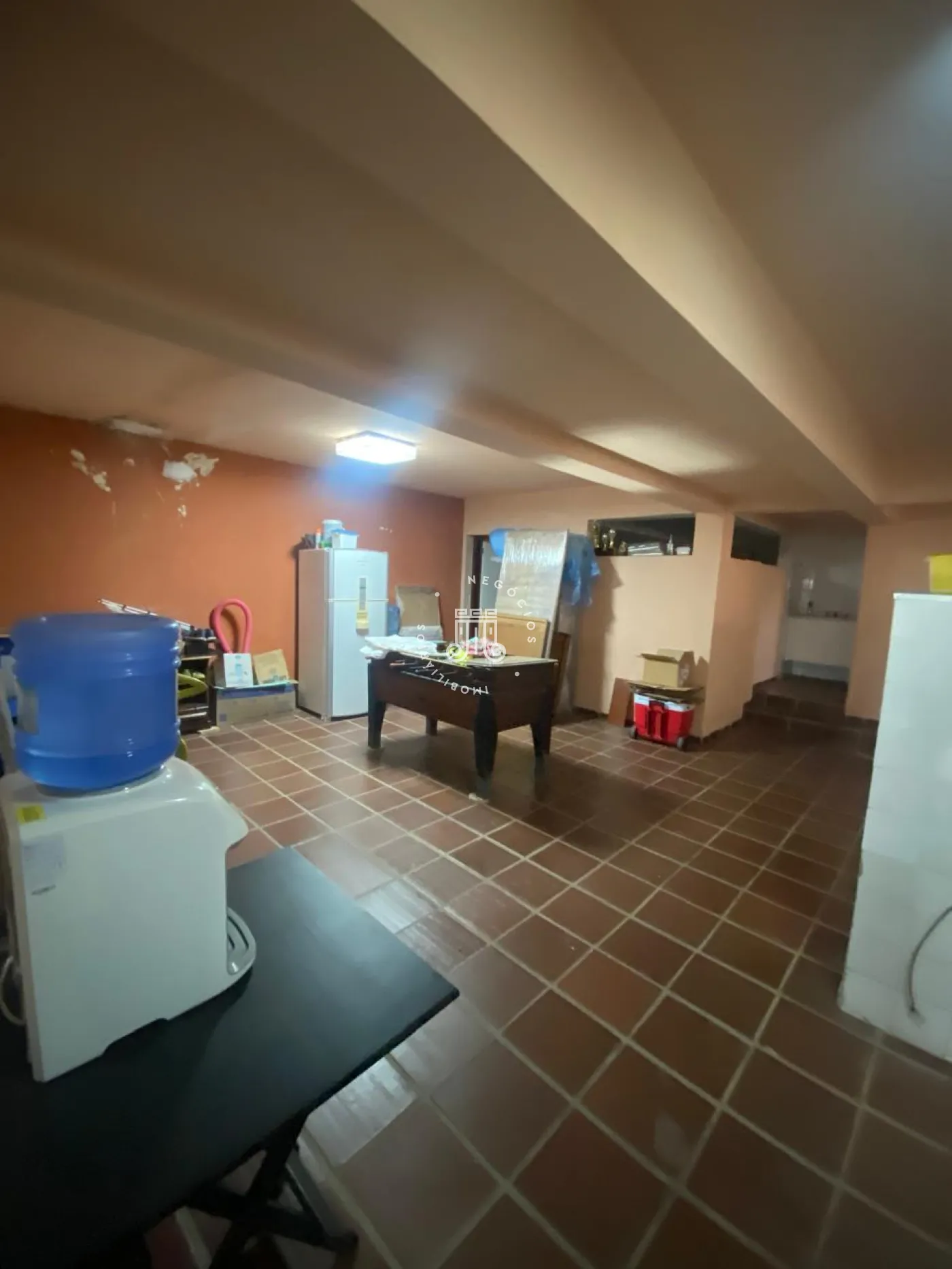 Parte inferior: Salão plano de 140 m², ideal para festas, escritório, laboratório ou consultórios. Se for residencial, há garagem coberta para 4 veículos e descoberta para 3, com acesso ao salão. Conta também com lavanderia, 1 banheiro, churrasqueira, quintal e portão eletrônico com grade de alumínio.