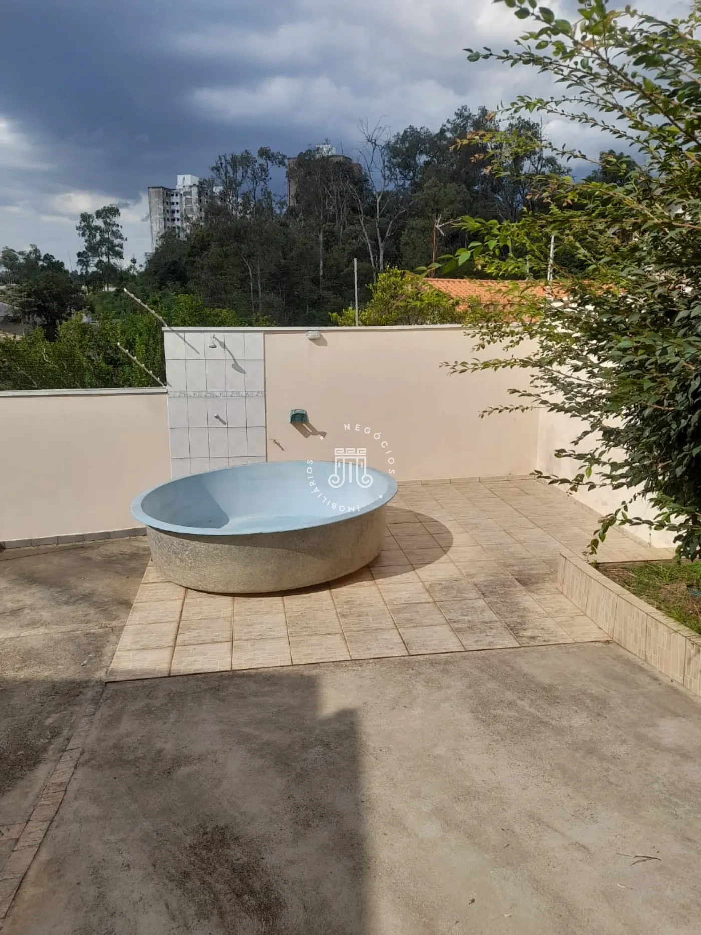 Um quintal amplo com ducha e jardim.