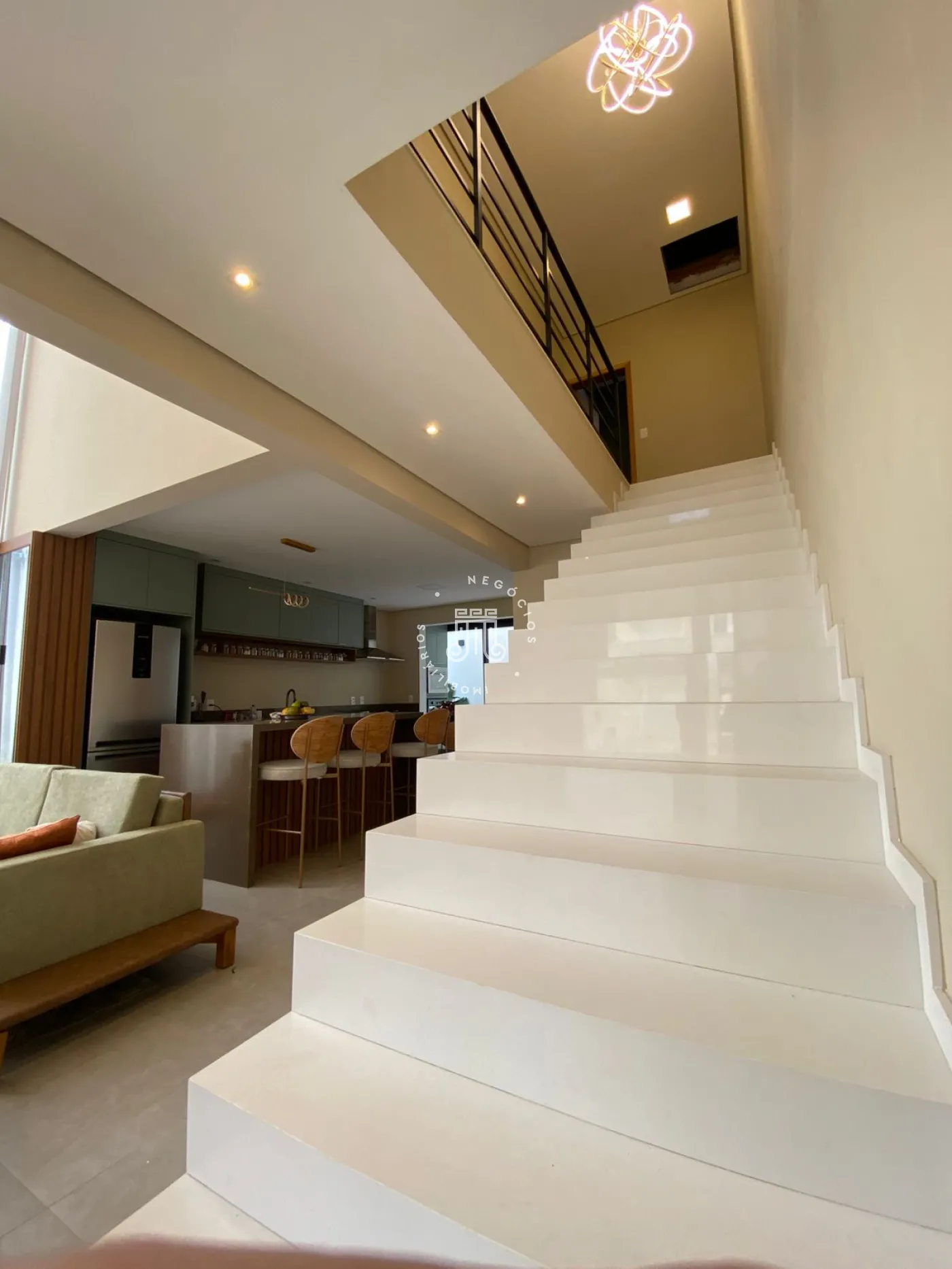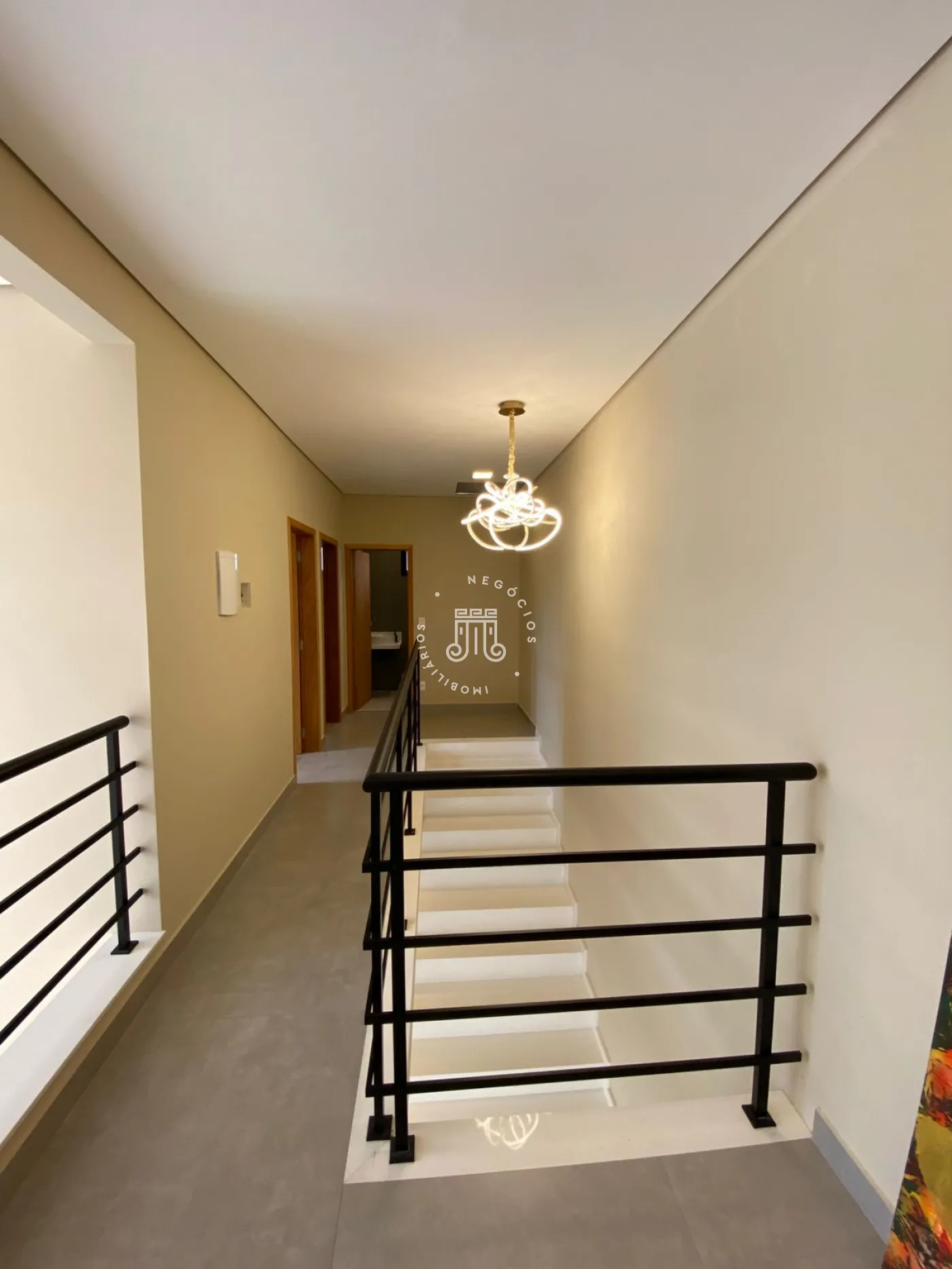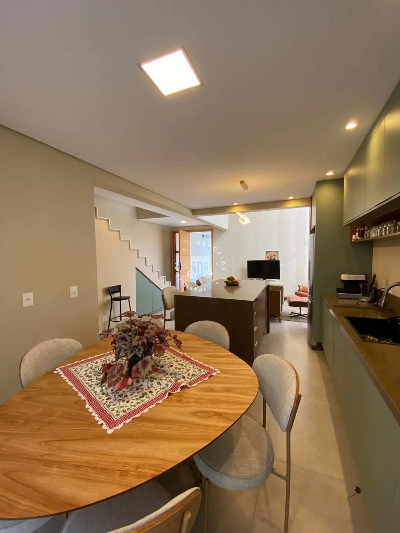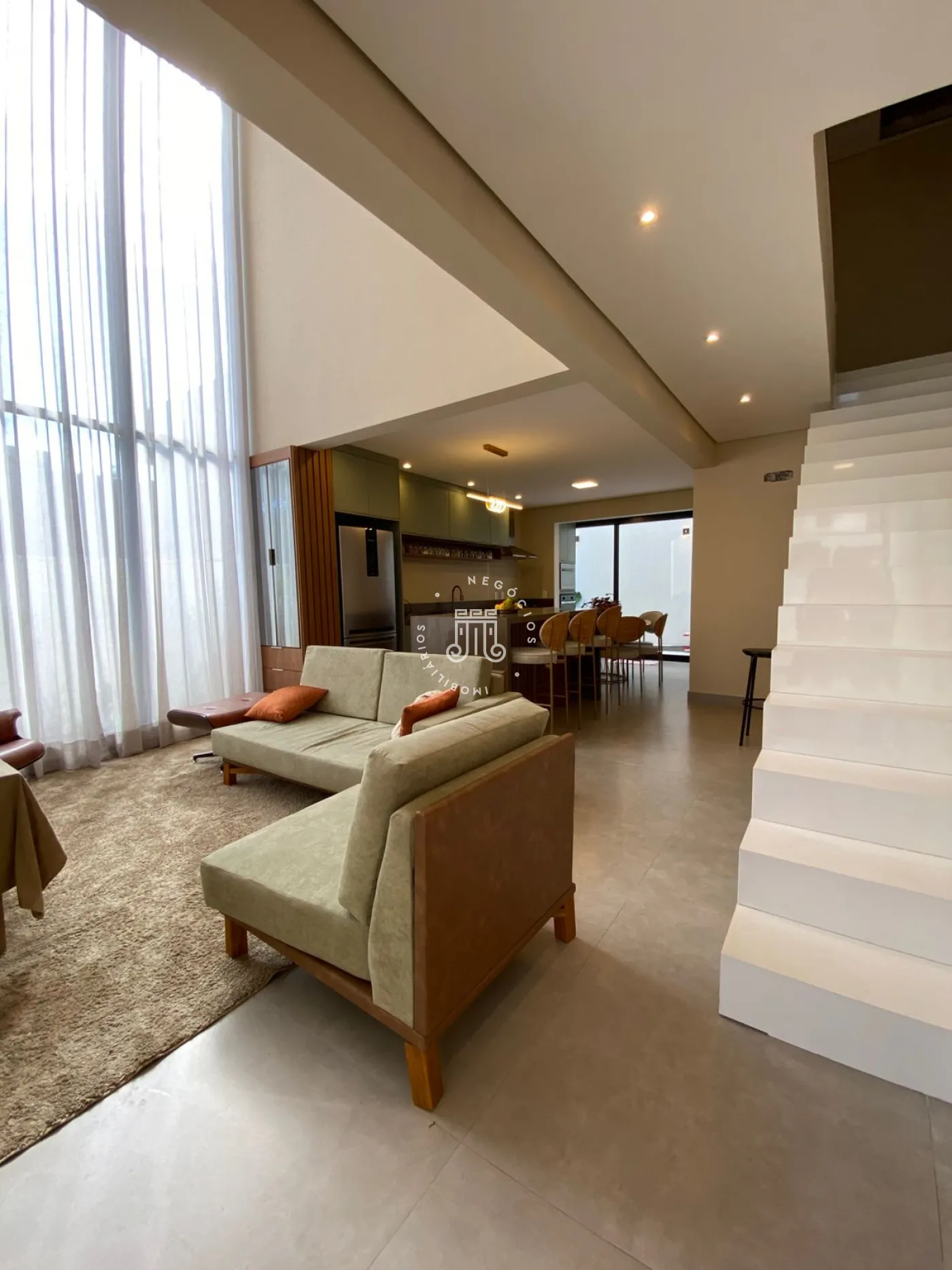 Com 3 dormitórios, sendo 1 deles suíte master com armário e sacada, janelas com persiana integrada, banheiro social com box, lavabo, sala de estar, com pé direito duplo, cozinha planejada com ilha em granito, área de serviço, quintal com jardim e 2 vagas de garagem cobertas com portão eletrônico.