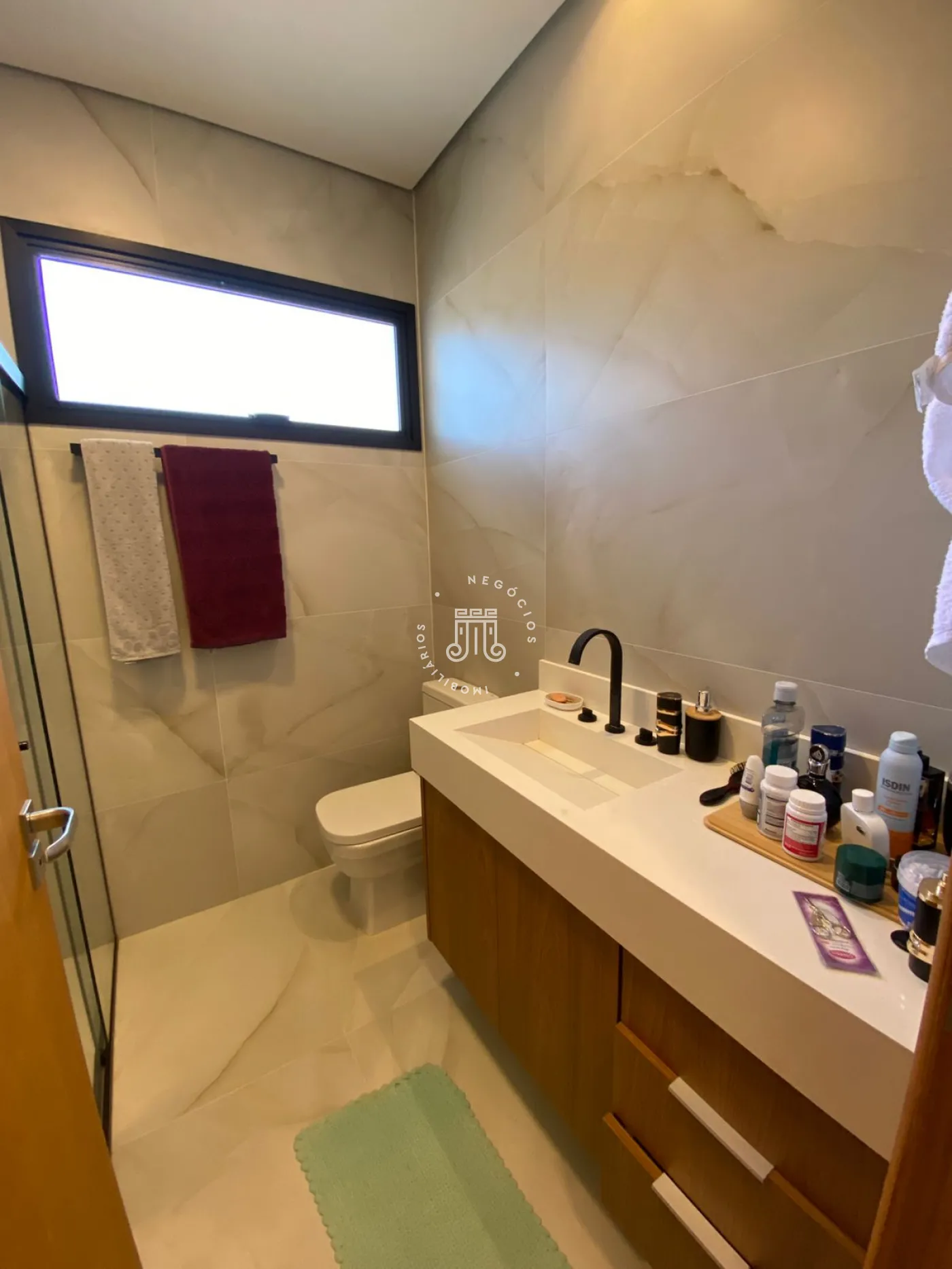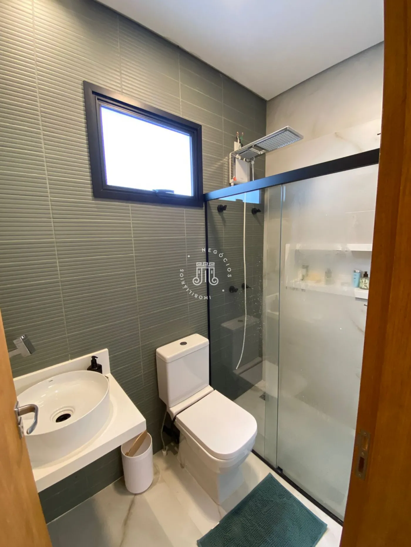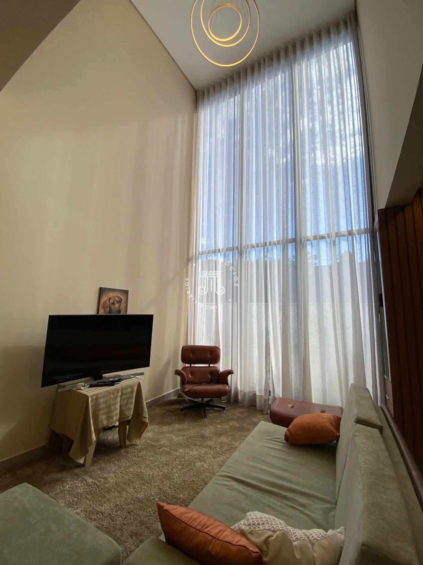 Com 3 dormitórios, sendo 1 deles suíte master com armário e sacada, janelas com persiana integrada, banheiro social com box, lavabo, sala de estar, com pé direito duplo, cozinha planejada com ilha em granito, área de serviço, quintal com jardim e 2 vagas de garagem cobertas com portão eletrônico.