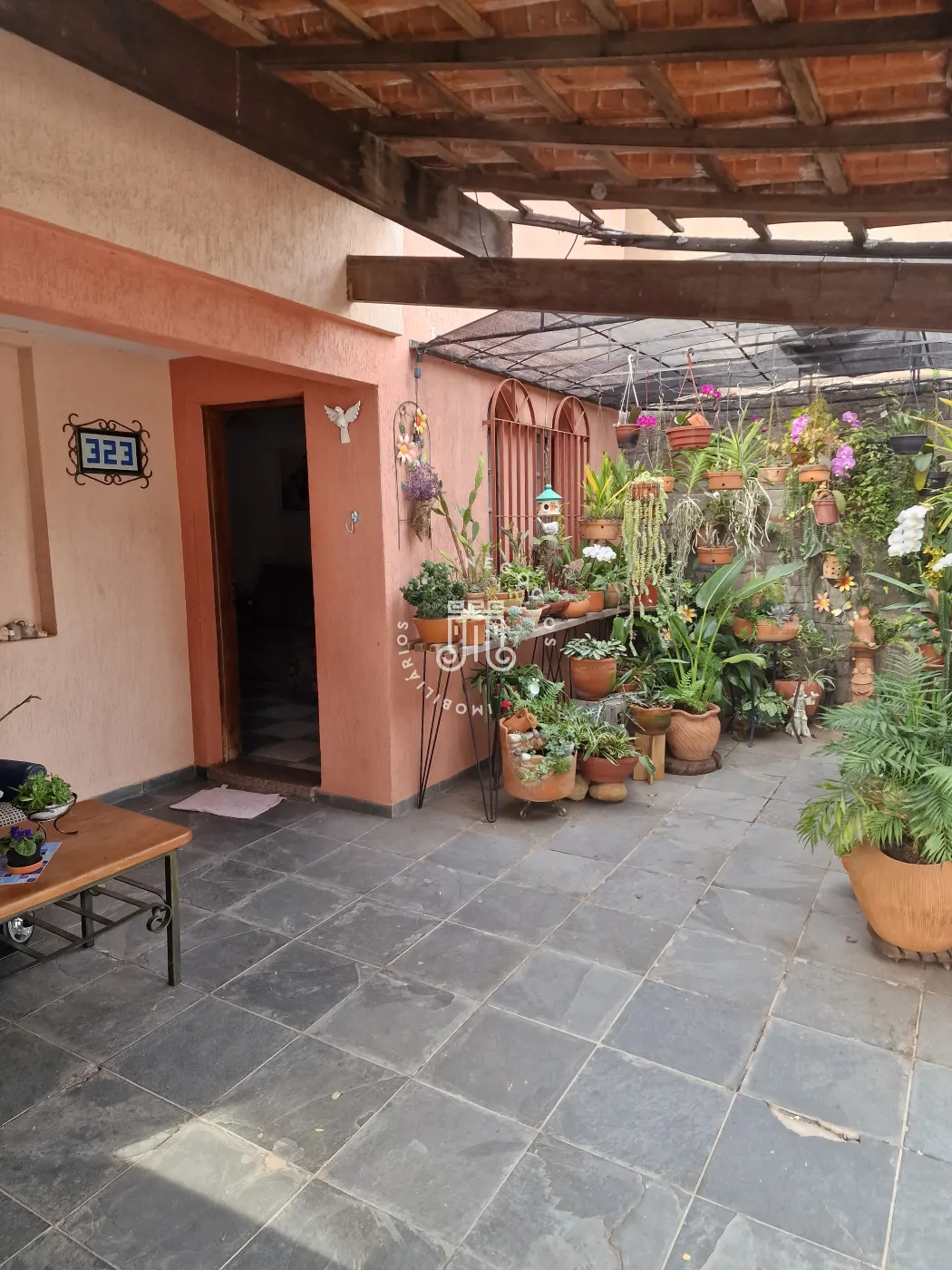 Casa térrea construída sobre terreno em declive bem aproveitado com suas 6 vagas de garagem e, sob ela, 2 porões, ao fundo dos quais se encontra amplo espaço.
