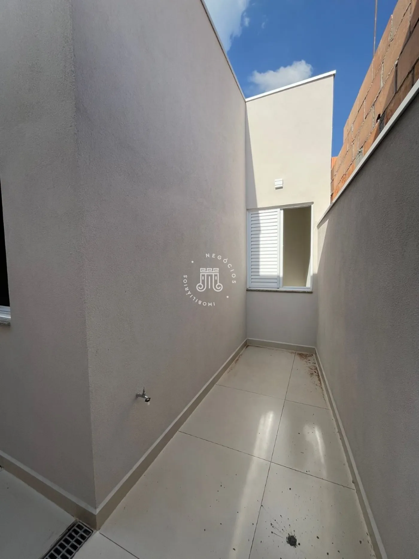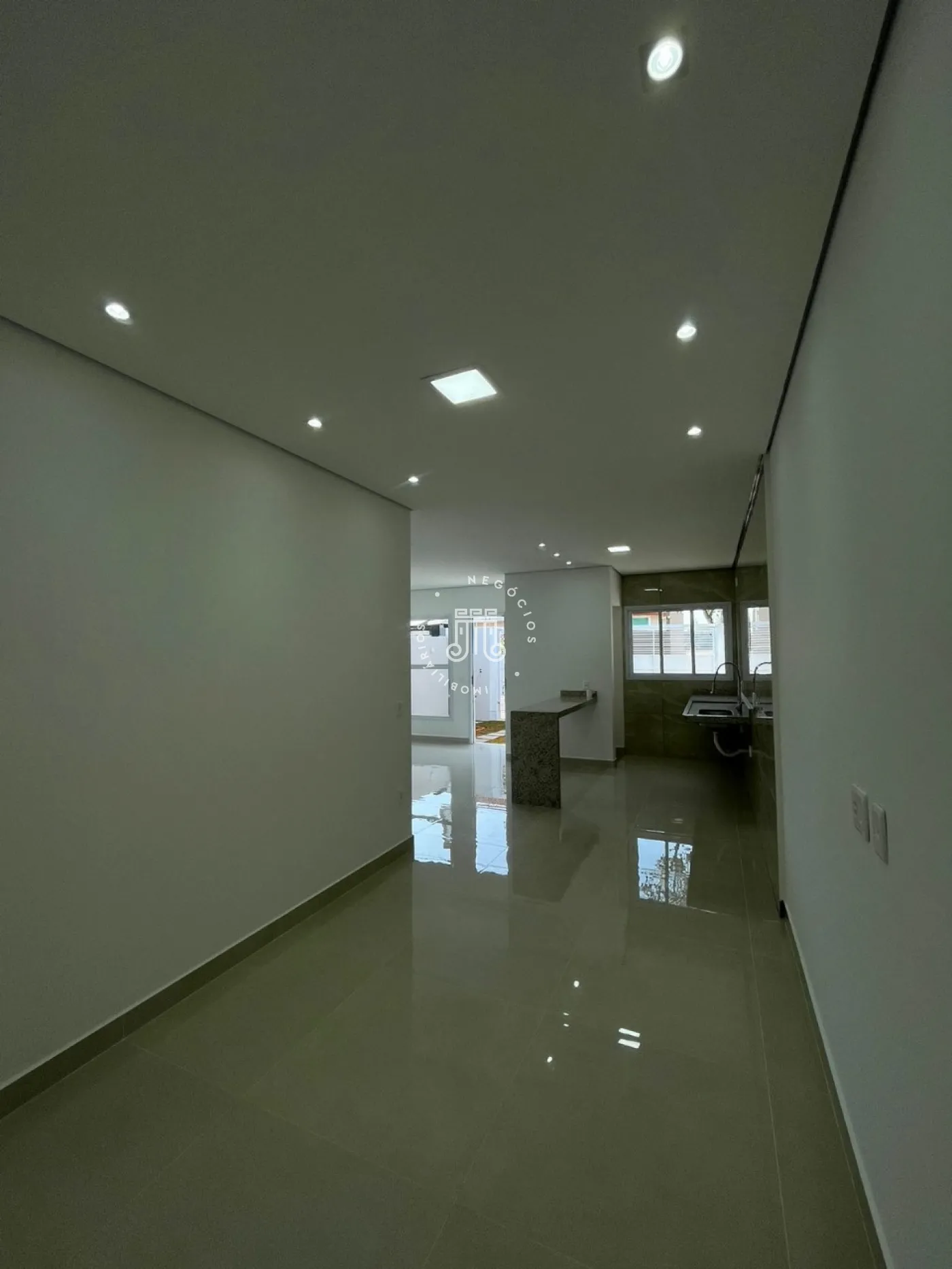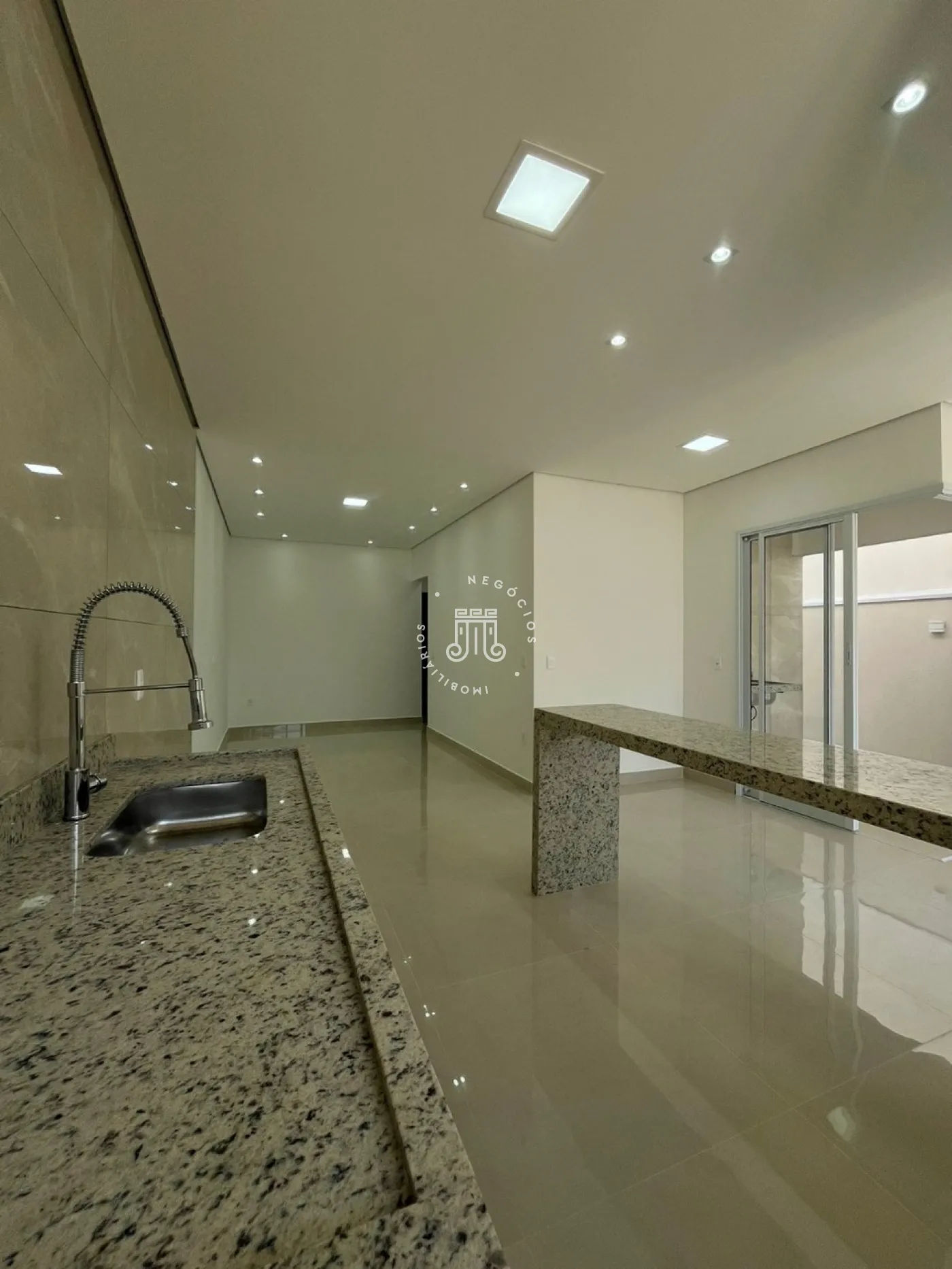 3 Quartos sendo duas suítes. Sala com pé direito duplo. Cozinha com fogão com cooktop instalado, ambiente integrado com a sala. 1 Banheiro Social. Área gourmet. Área de serviço com corredor lateral para quintal nos fundos. Vaga para dois carros.