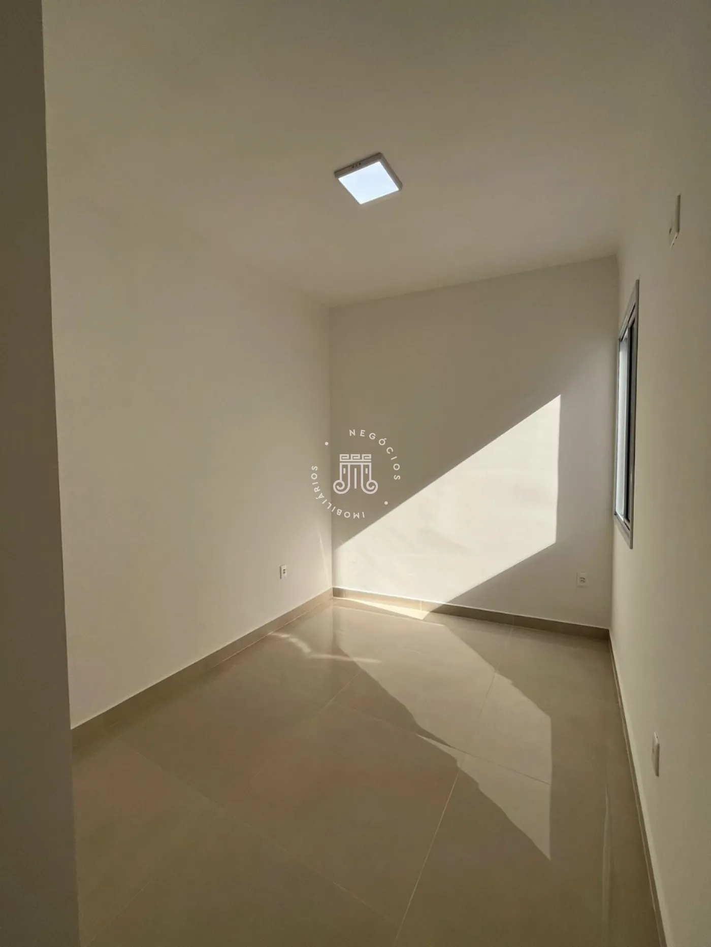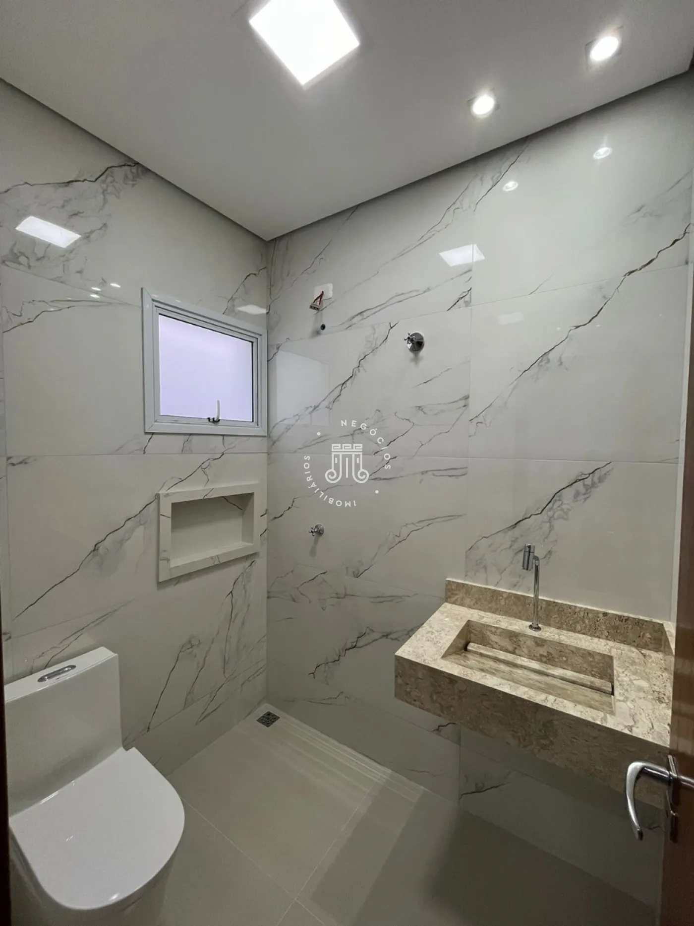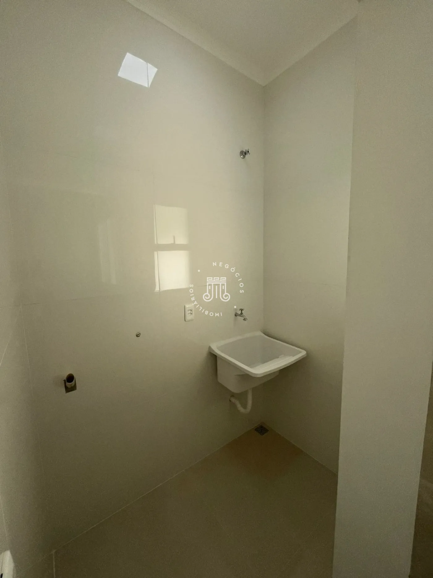 3 Quartos sendo duas suítes. Sala com pé direito duplo. Cozinha com fogão com cooktop instalado, ambiente integrado com a sala. 1 Banheiro Social. Área gourmet. Área de serviço com corredor lateral para quintal nos fundos. Vaga para dois carros.