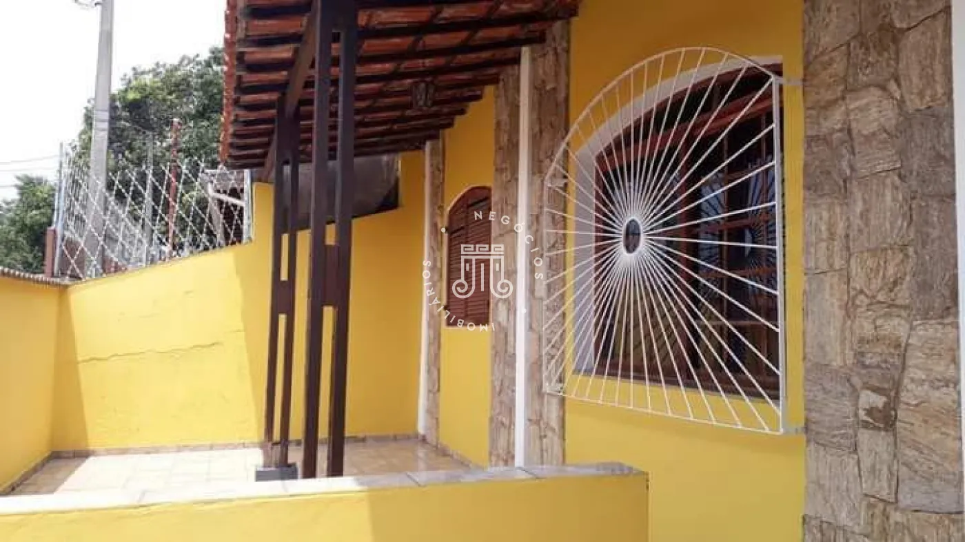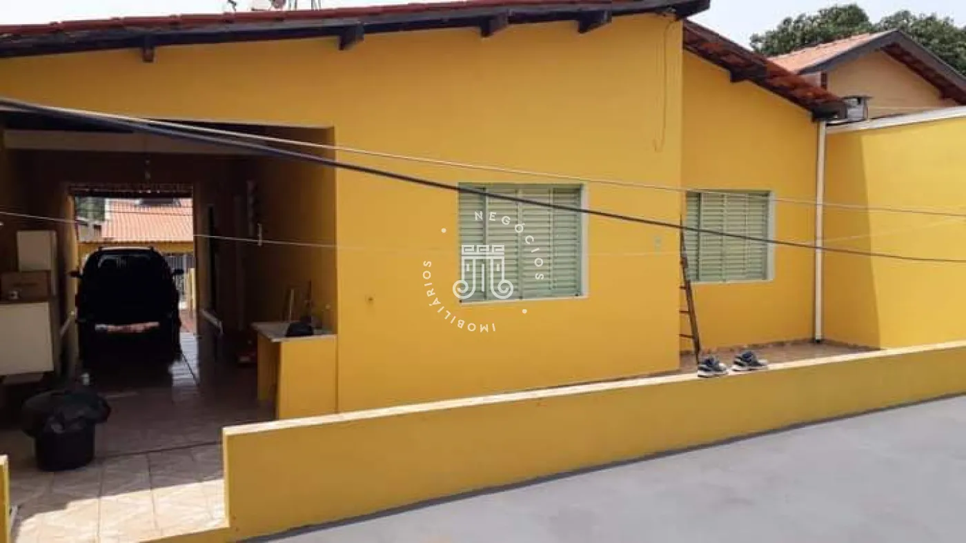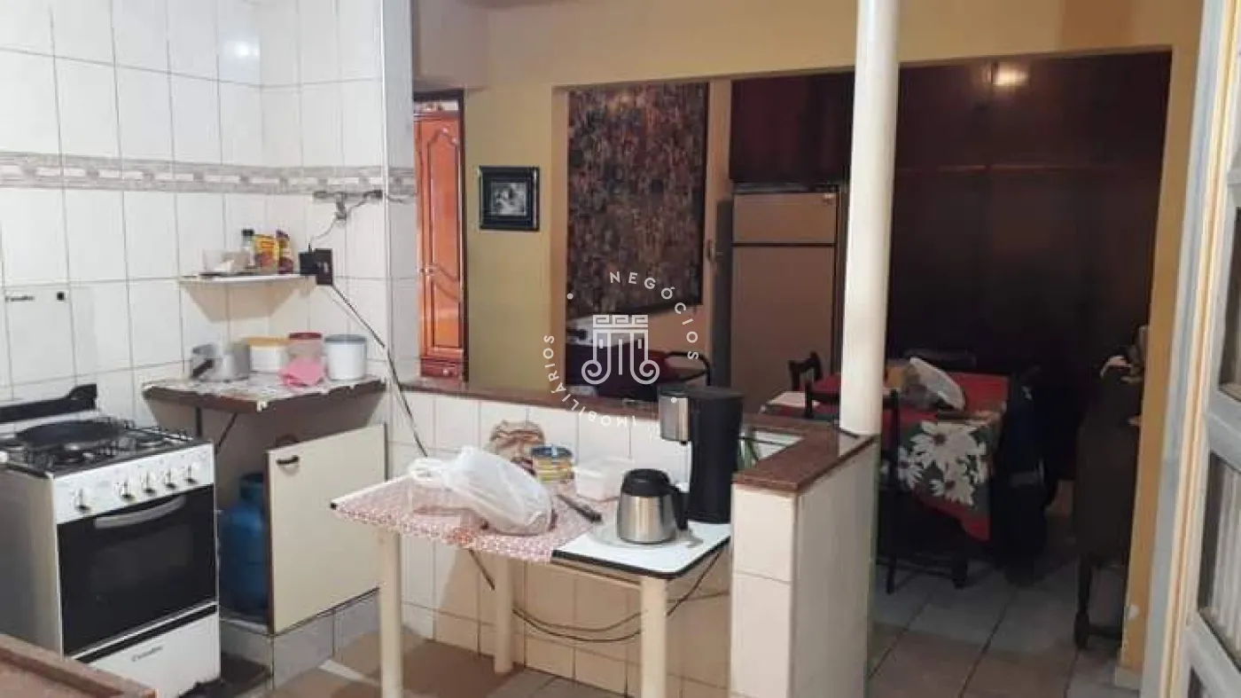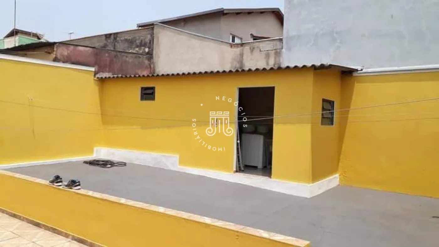 A casa possui três quartos, um banheiro, sala com dois ambientes, copa e cozinha. Há área de serviço, três vagas para veículos, sendo uma coberta em sistema de gaveta. Nos fundos, encontram-se um quintal, lavanderia e um banheiro adicional.