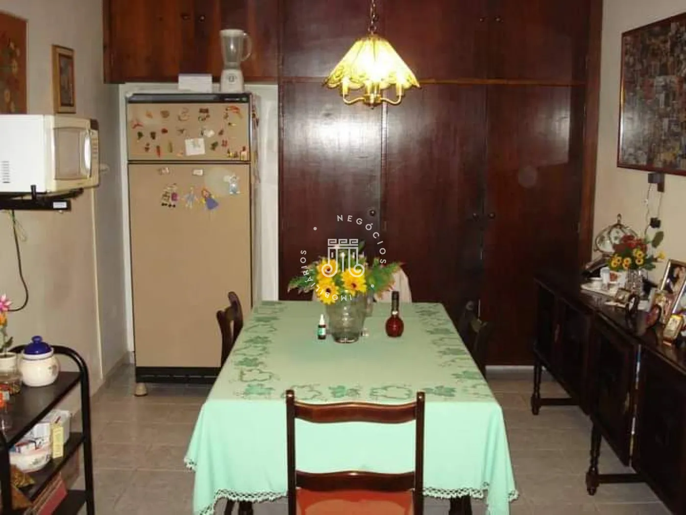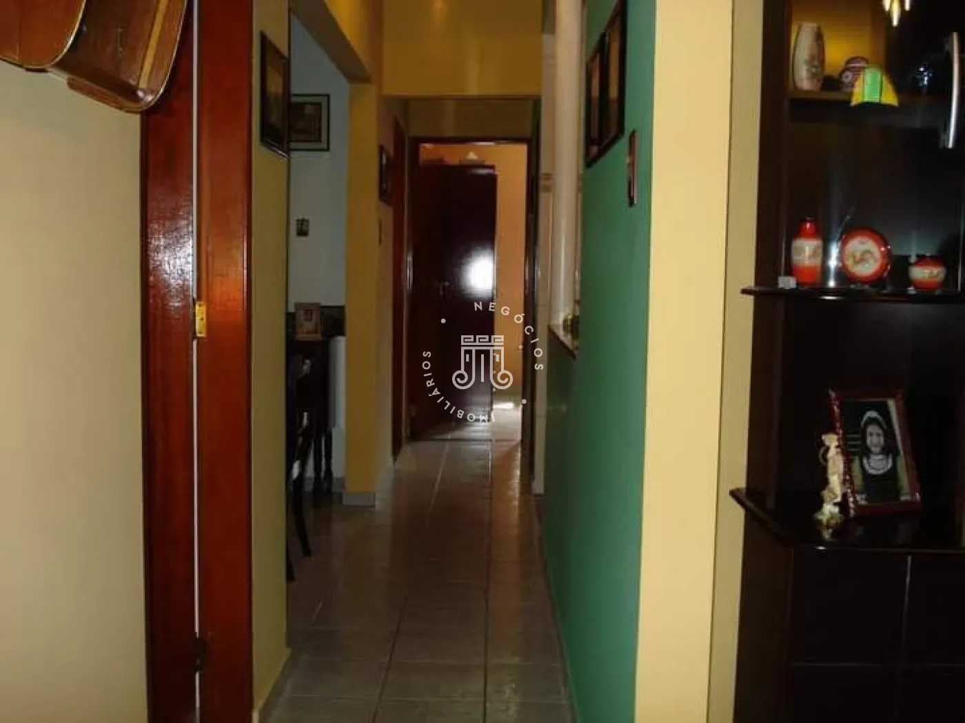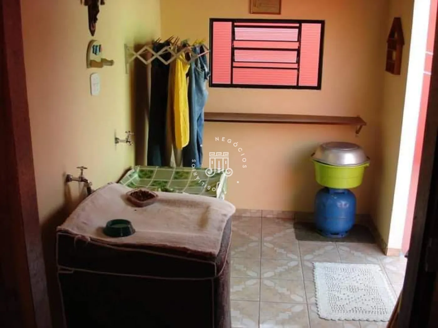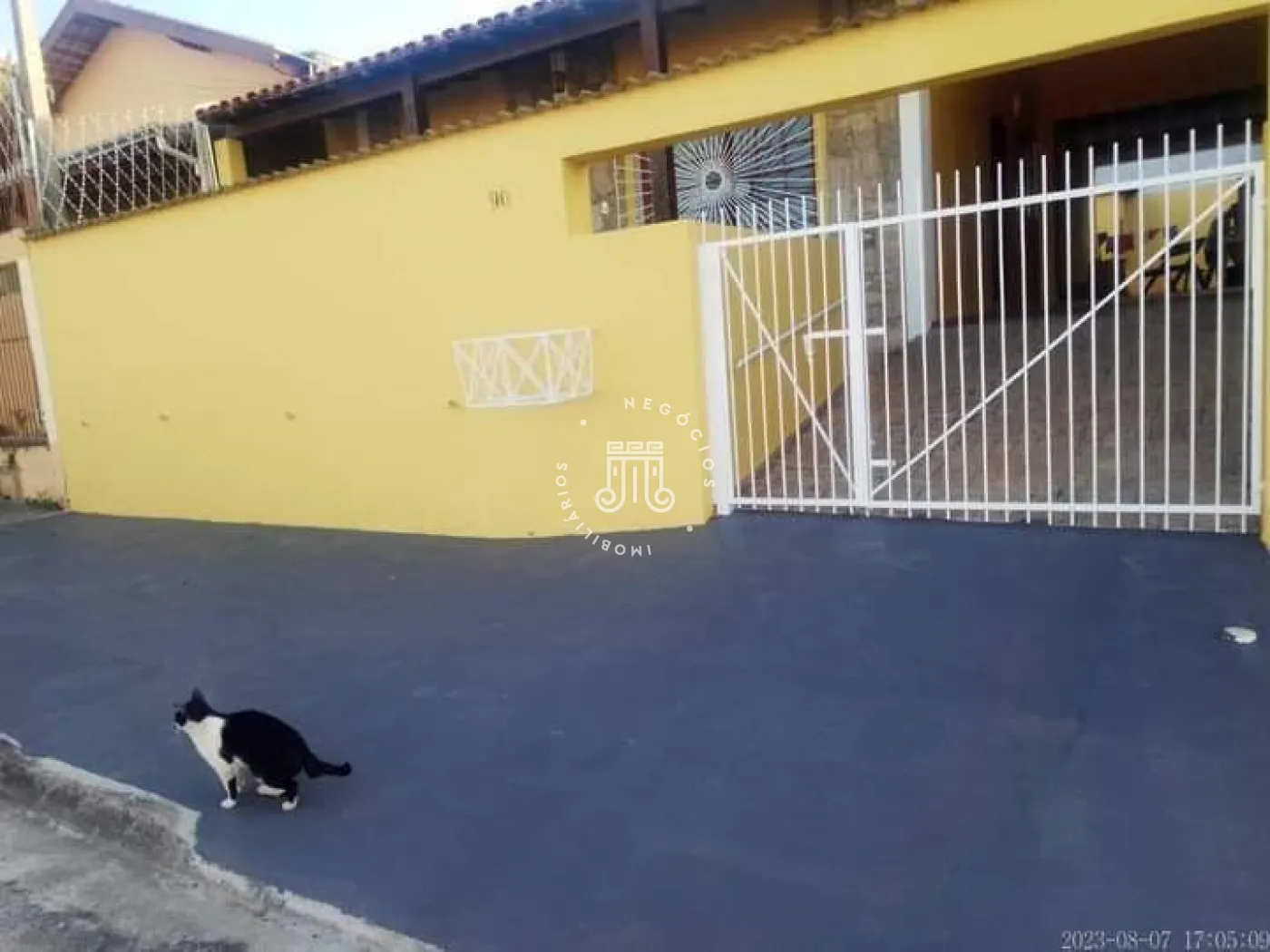 A casa possui três quartos, um banheiro, sala com dois ambientes, copa e cozinha. Há área de serviço, três vagas para veículos, sendo uma coberta em sistema de gaveta. Nos fundos, encontram-se um quintal, lavanderia e um banheiro adicional.