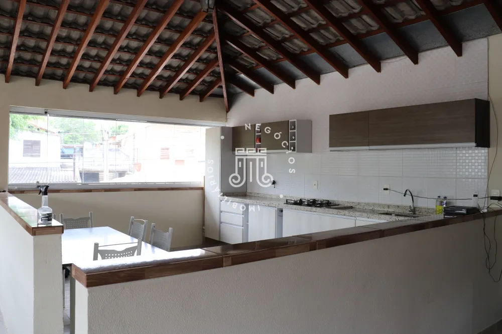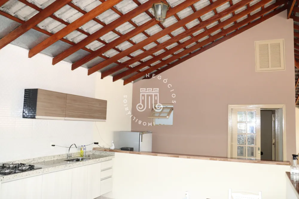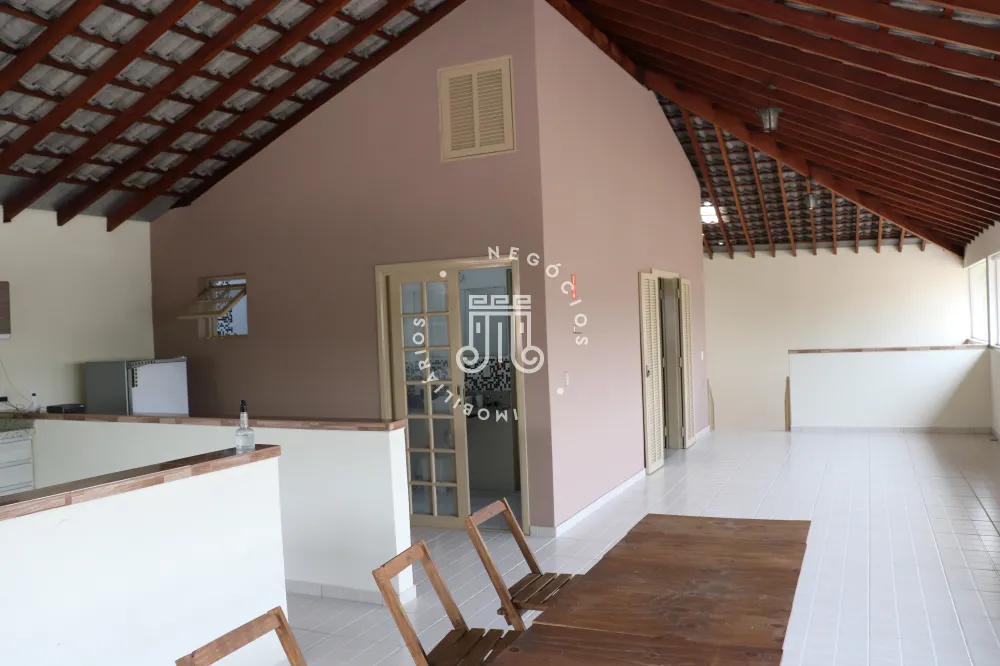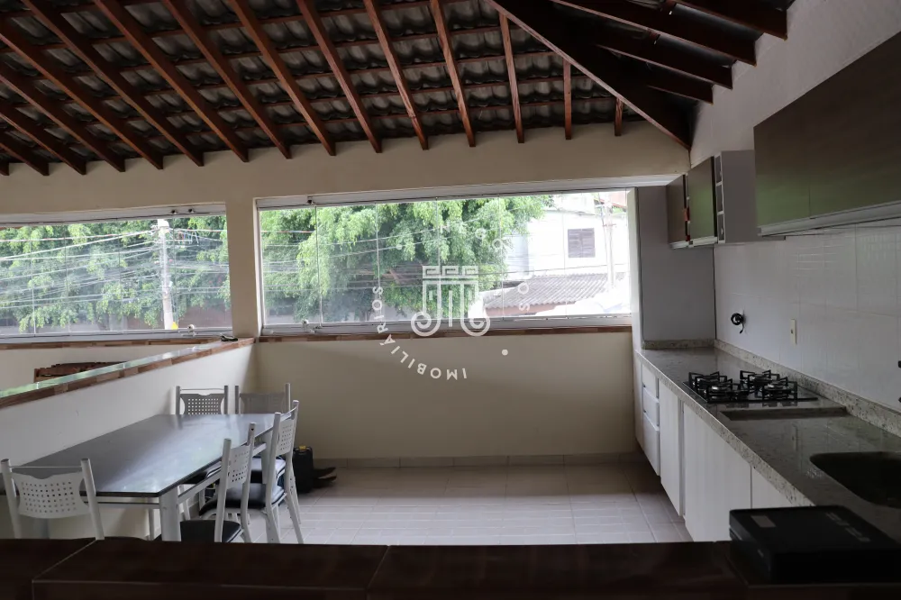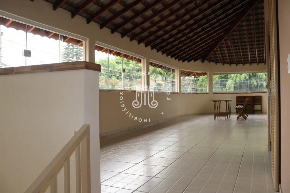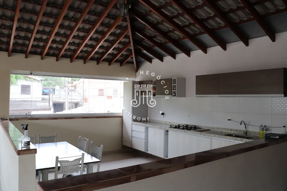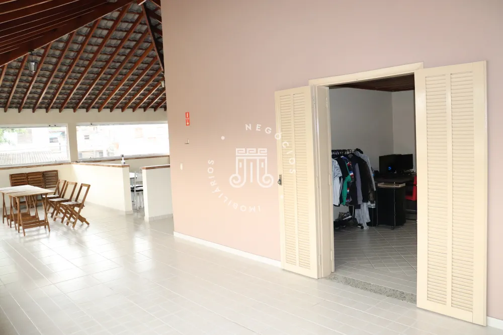 Possui 280 m² de área construída. No andar superior, há um salão com cozinha equipada com bancada e armários, além de uma suíte.