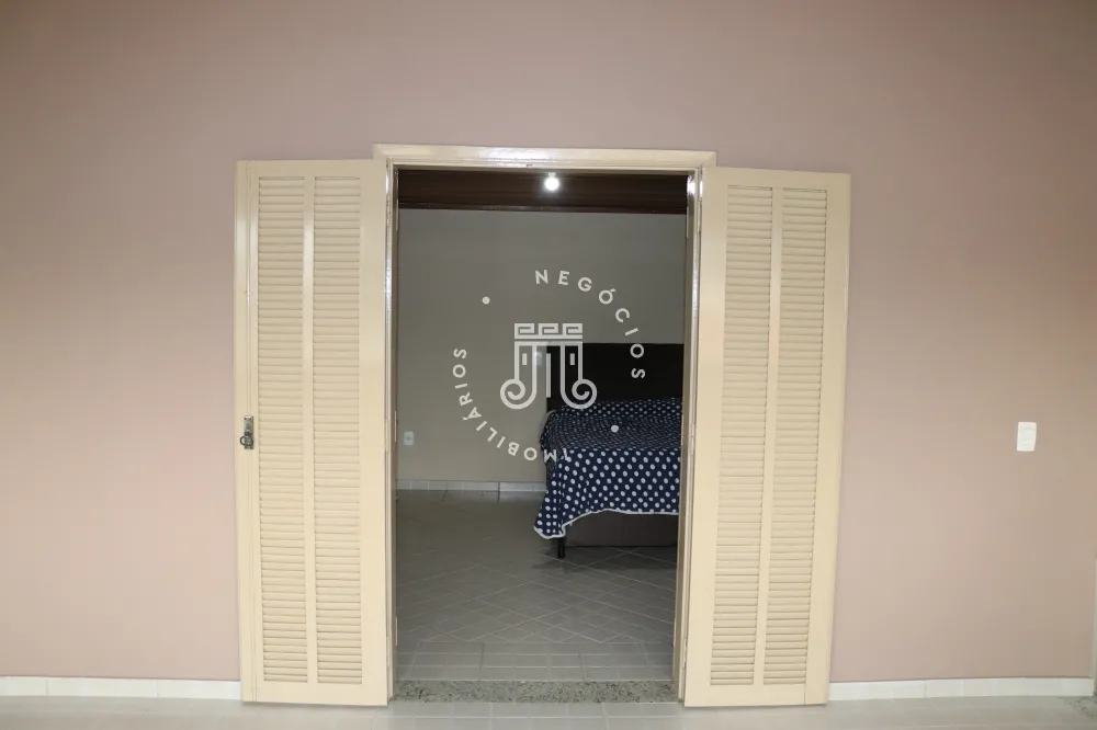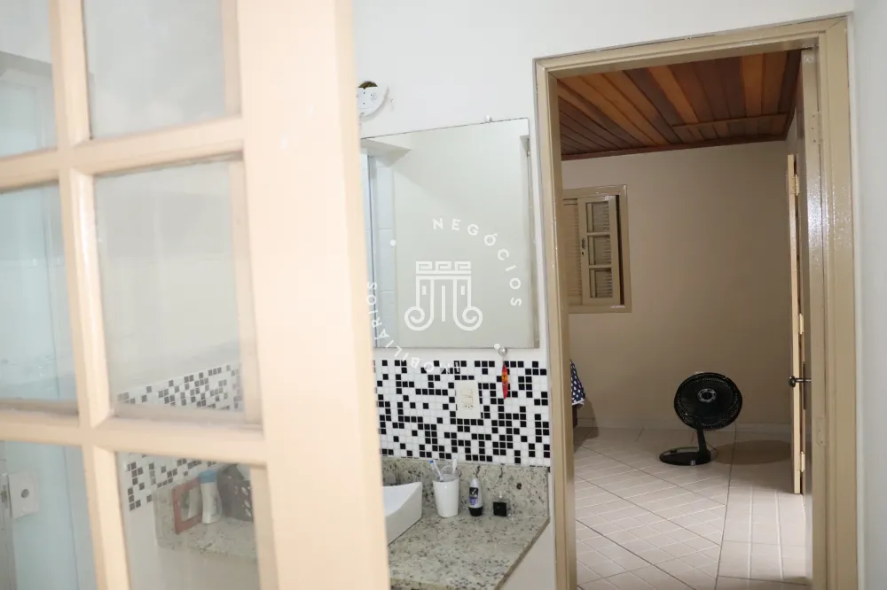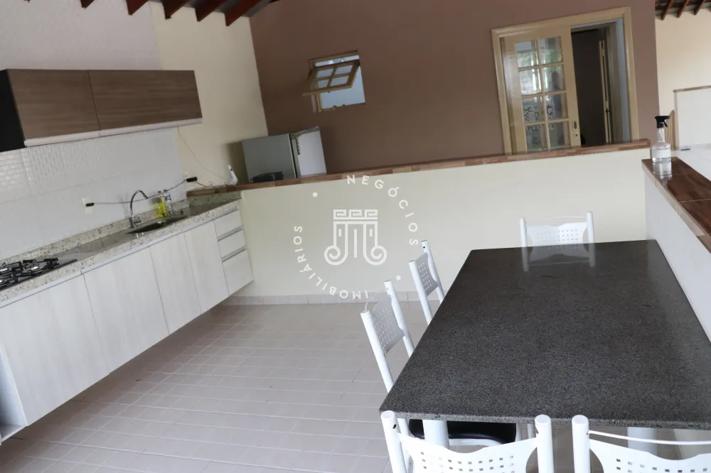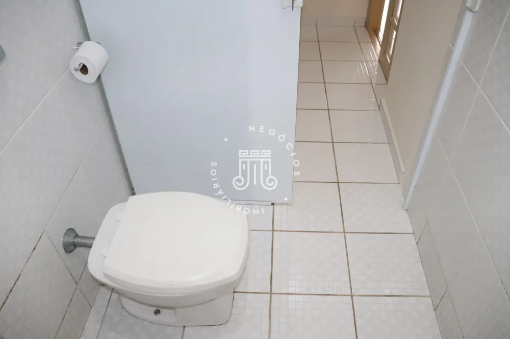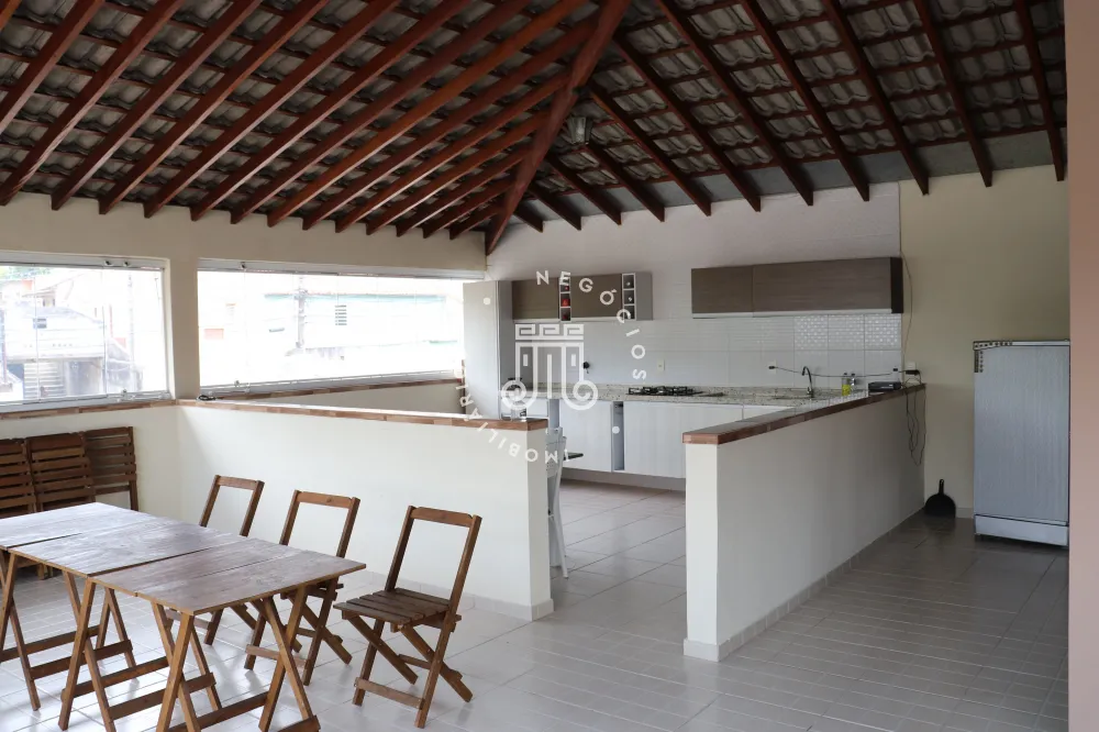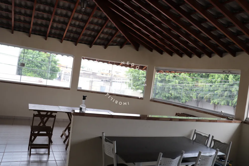 Possui 280 m² de área construída. No andar superior, há um salão com cozinha equipada com bancada e armários, além de uma suíte.