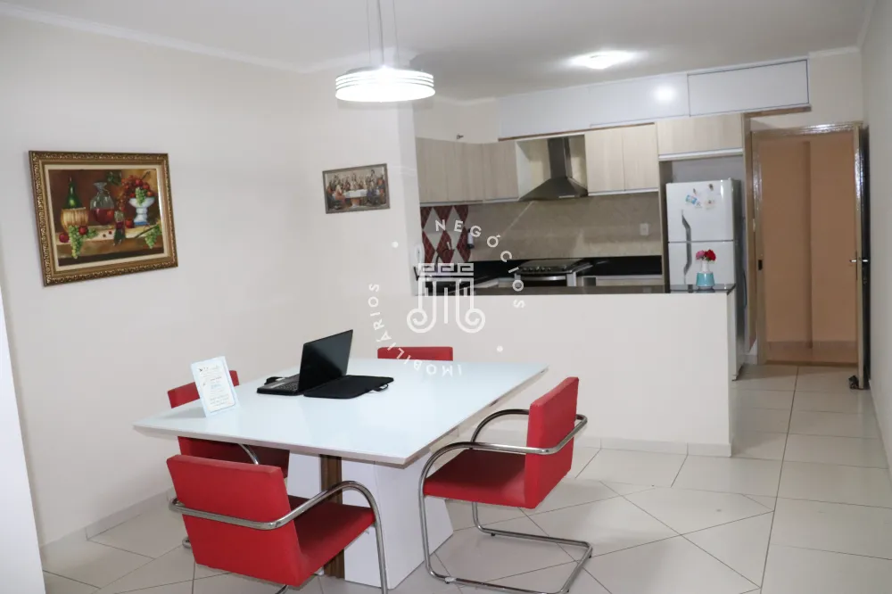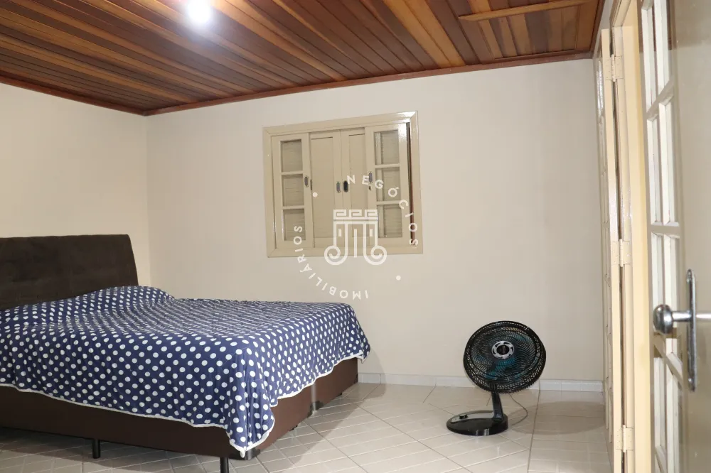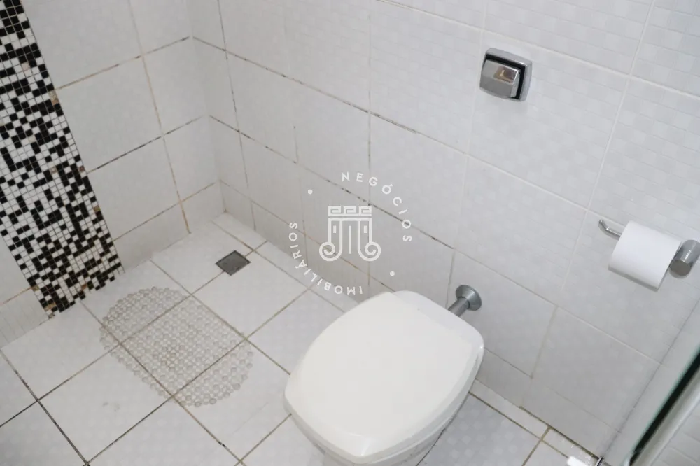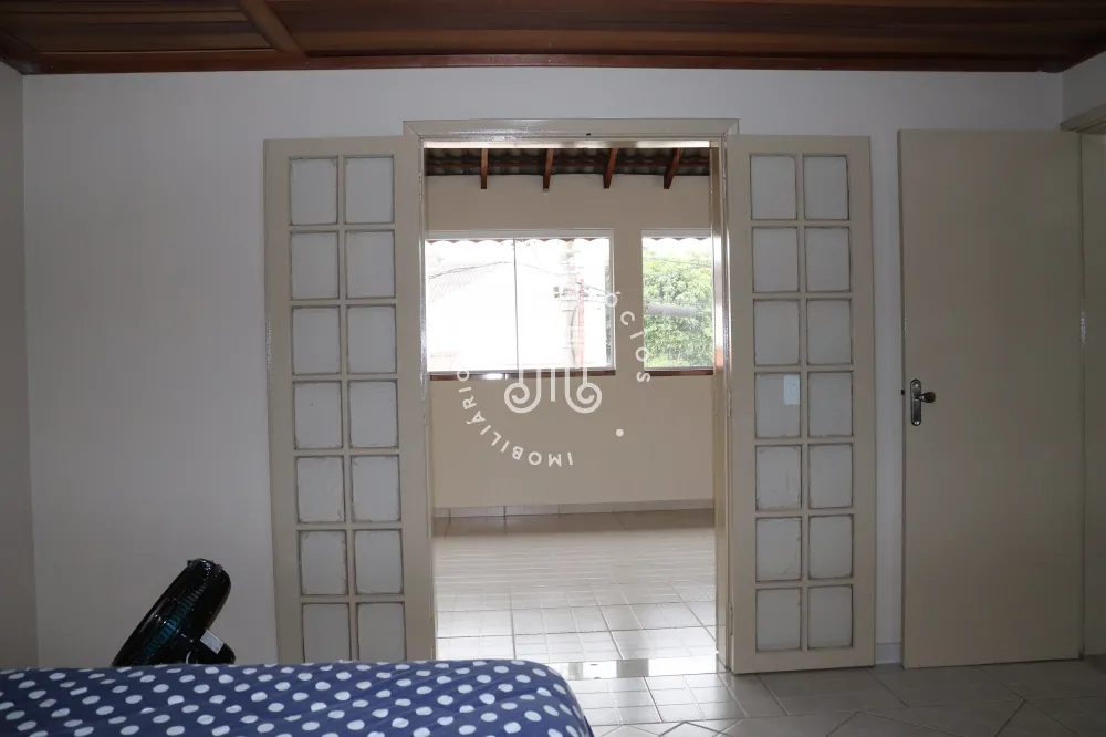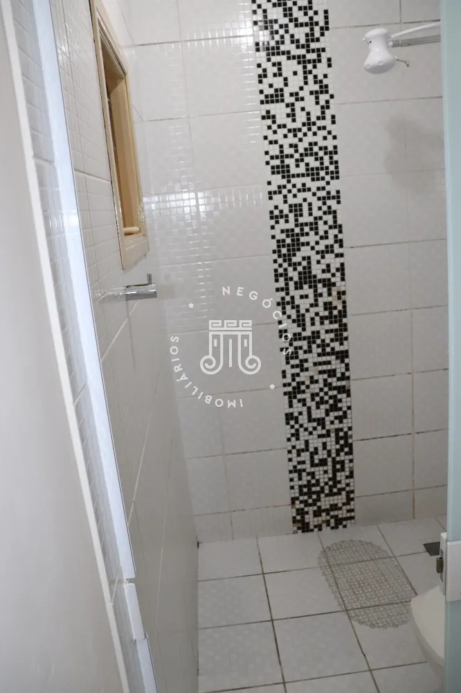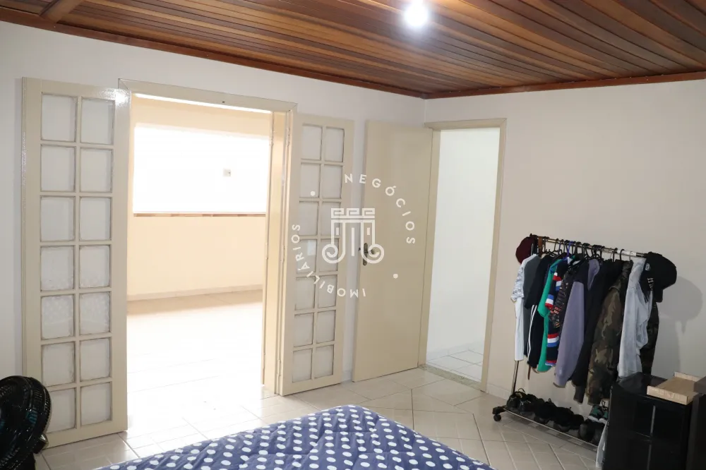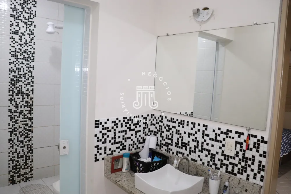 Possui 280 m² de área construída. No andar superior, há um salão com cozinha equipada com bancada e armários, além de uma suíte.