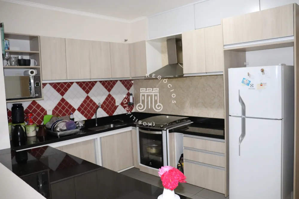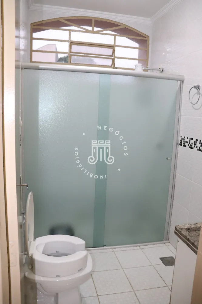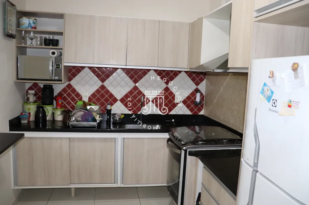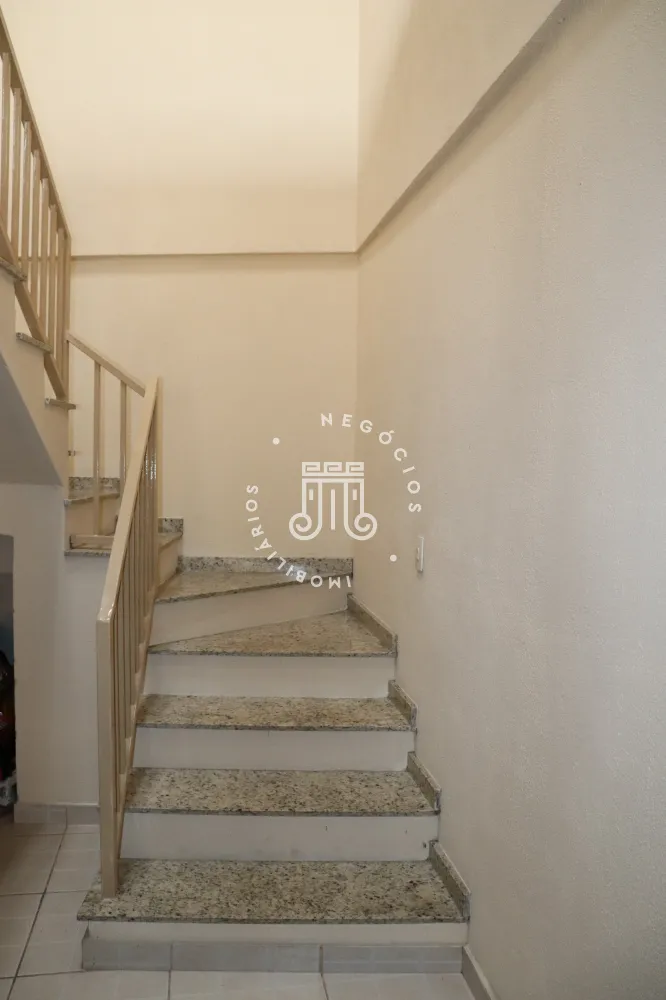 Todo o piso é frio. No andar inferior, há três dormitórios, um banheiro com box de vidro e bancada de granito, um lavabo, sala de estar, sala de jantar integrada à cozinha planejada com bancada, lavanderia, corredor lateral e jardim na área da frente.