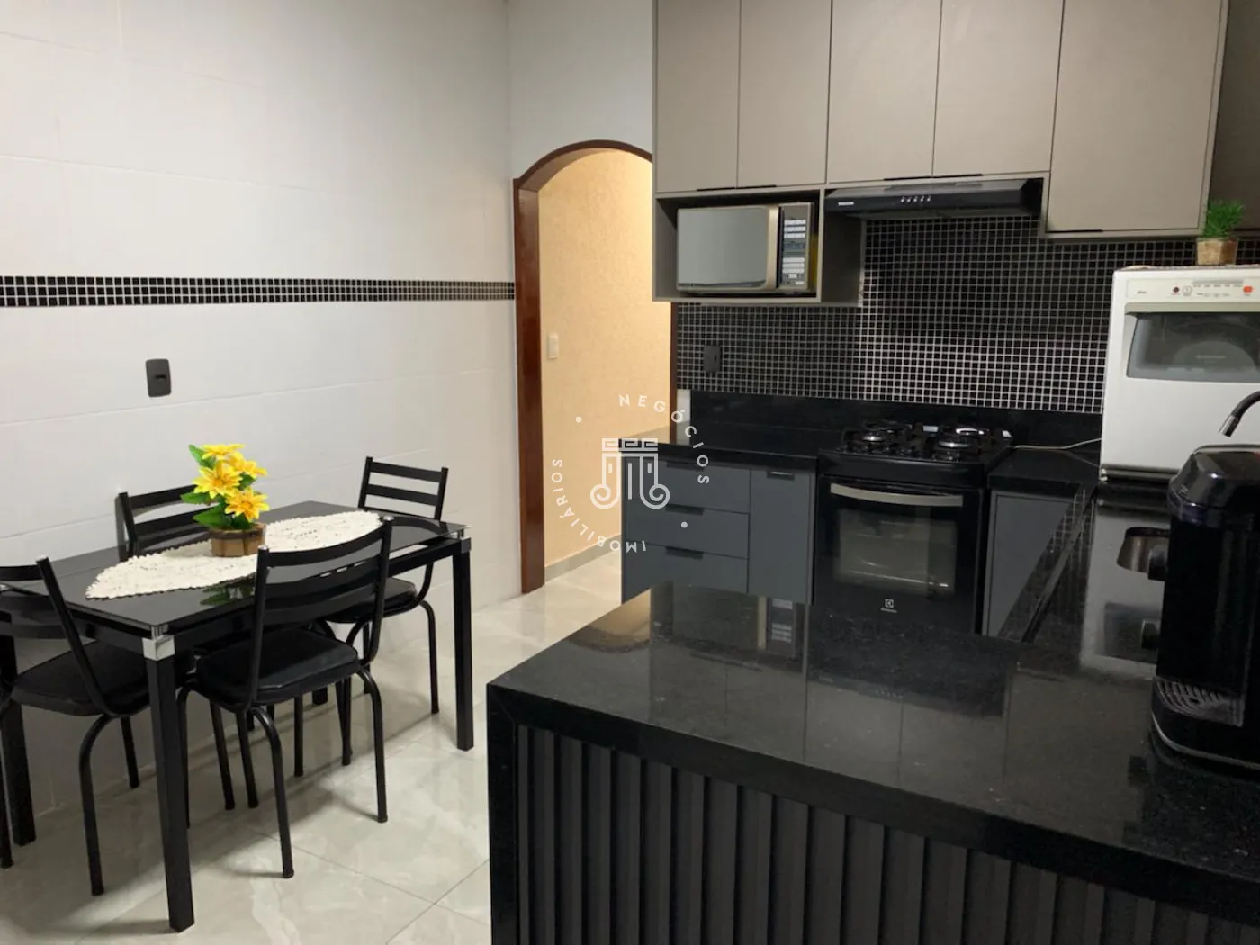 Imóvel possui 125m² de terreno, distribuídos em: 03 quartos, sendo 1 suíte, sala, cozinha, banheiro, área de serviço, 02 vagas de garagem coberta com portão eletrônico e salão com churrasqueira. O acabamento é em porcelanato nas áreas frias e laminado nos demais cômodos. A cozinha possui planejados.