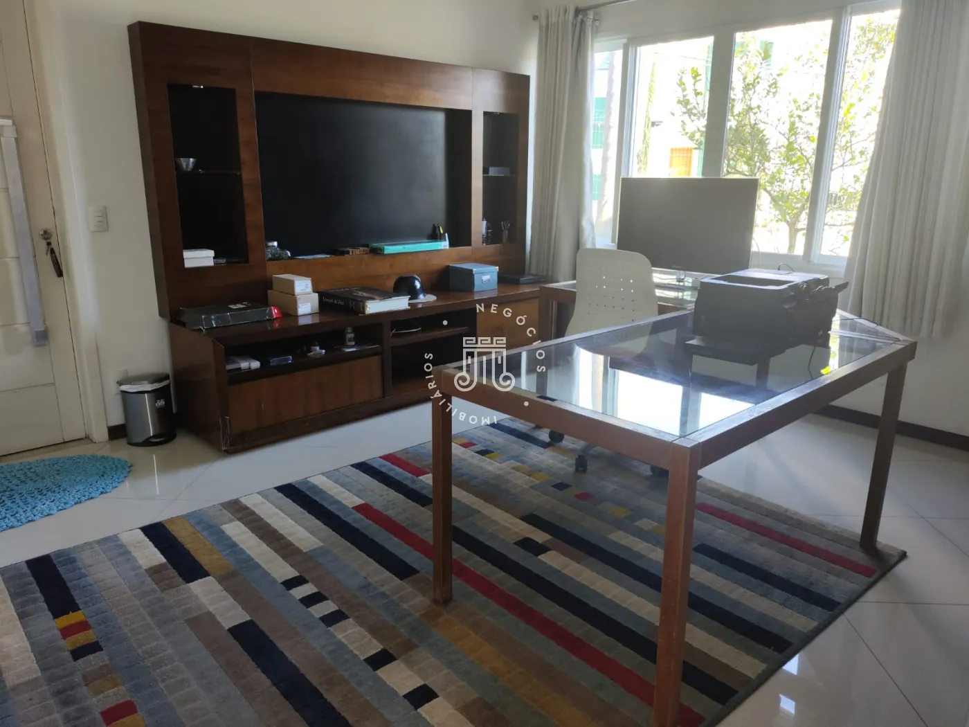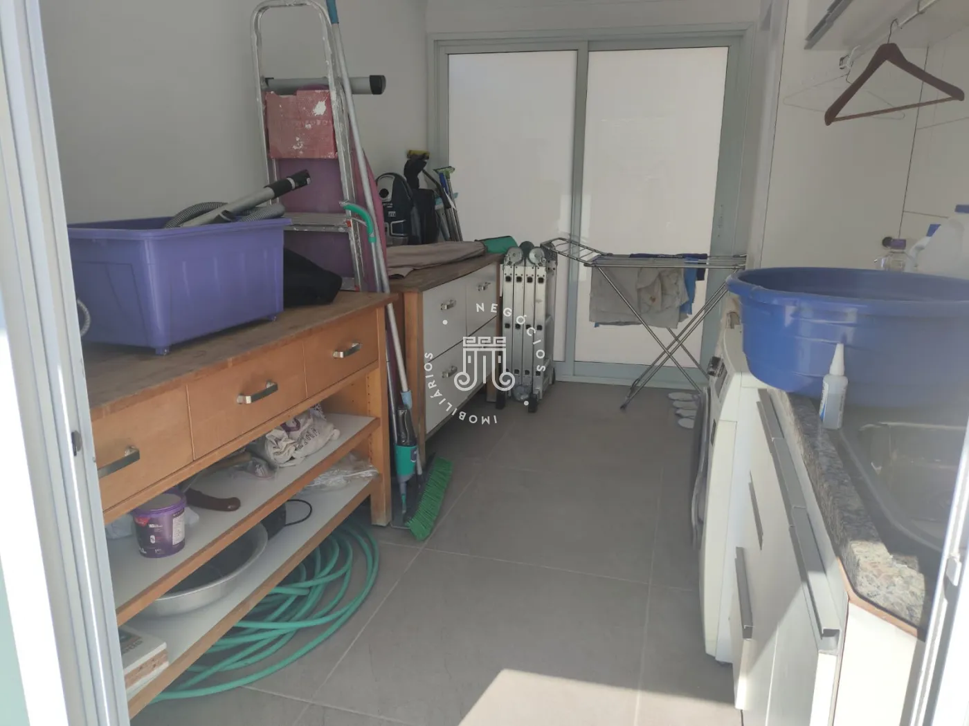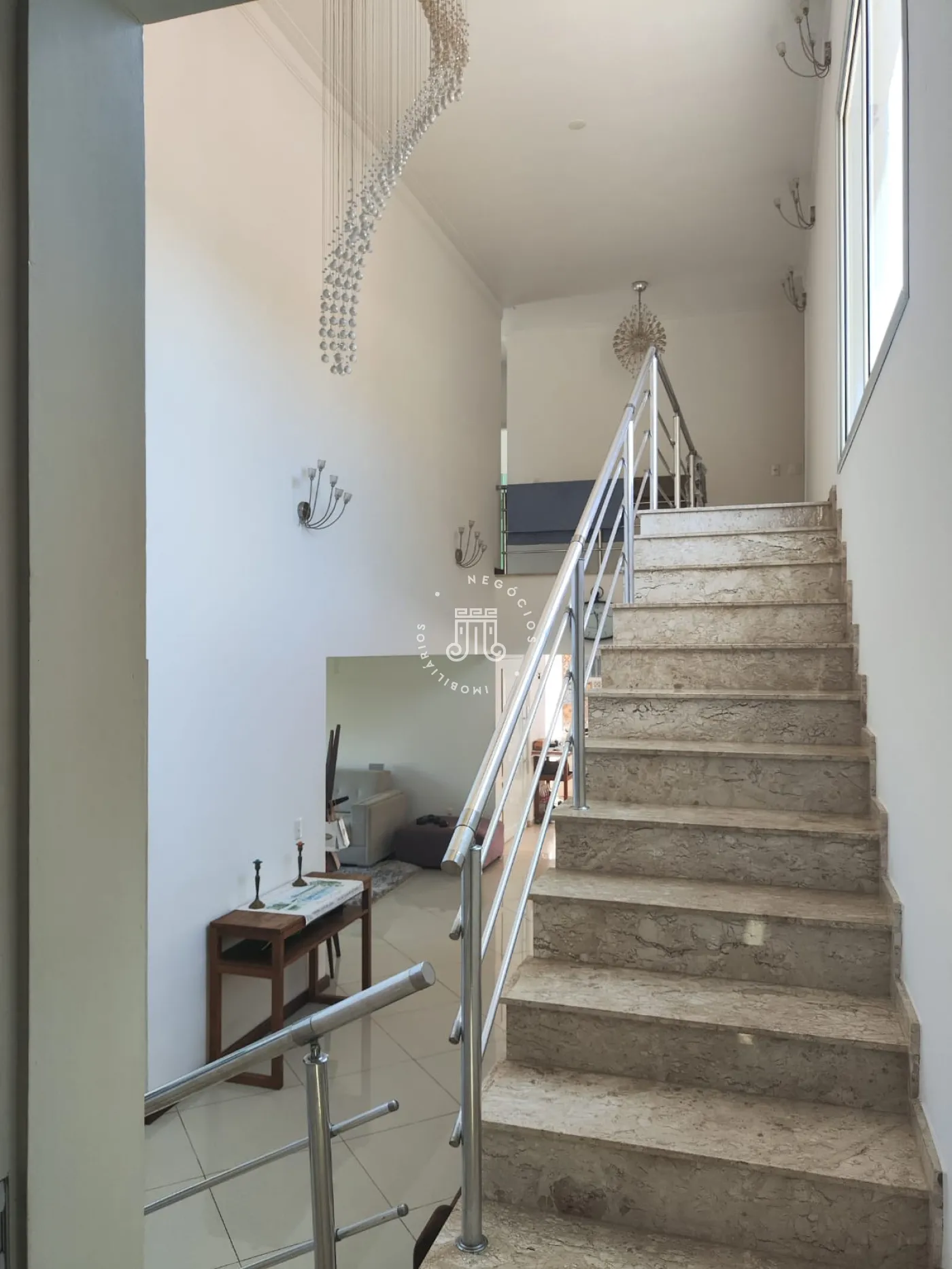 A área social inclui uma sala living e uma cozinha integrada. Na parte externa, há um espaço gourmet com pergolado. A garagem tem capacidade para quatro veículos, sendo duas vagas cobertas.